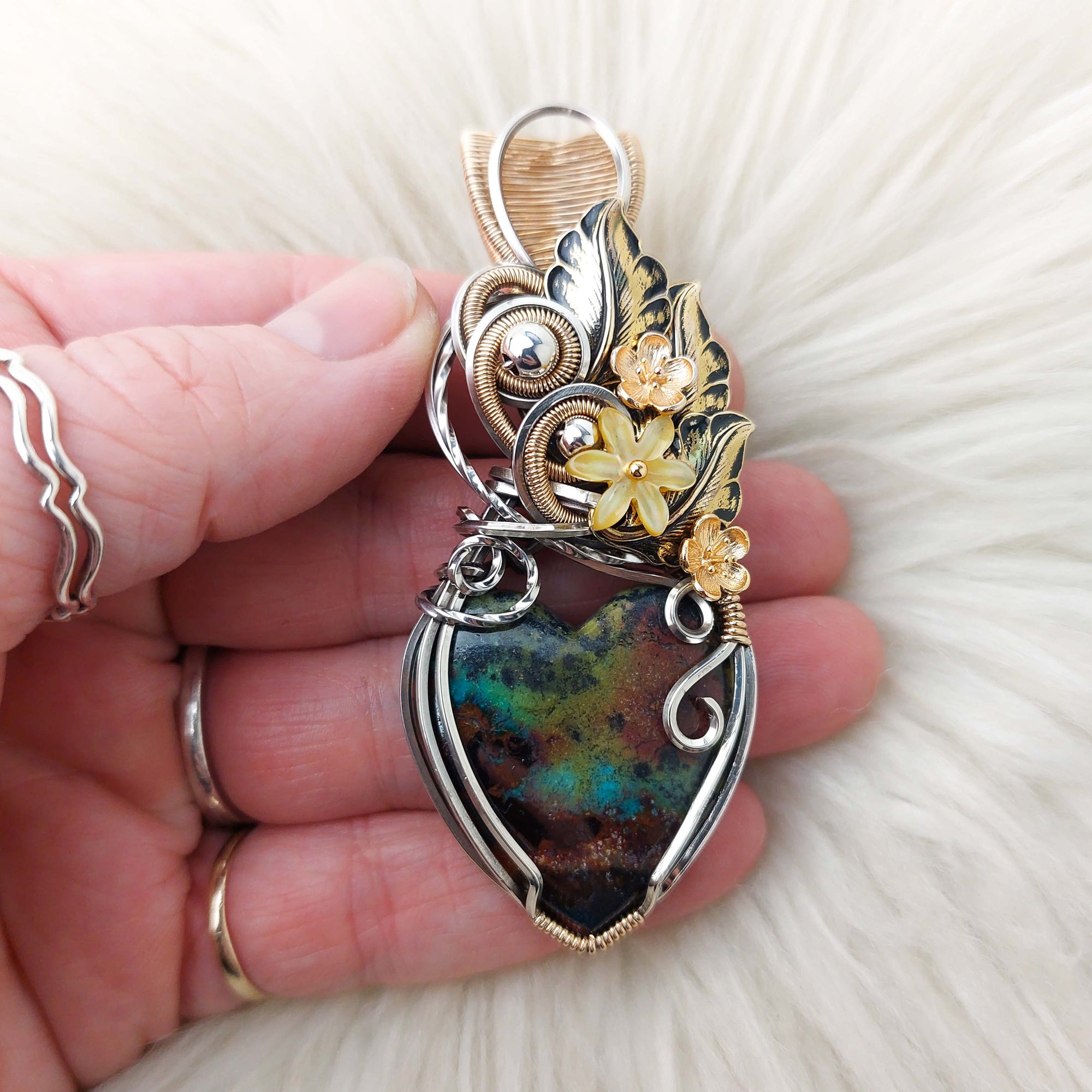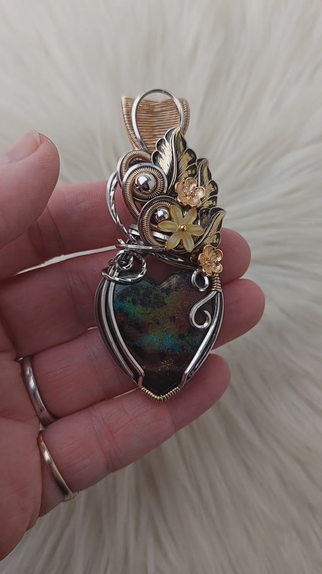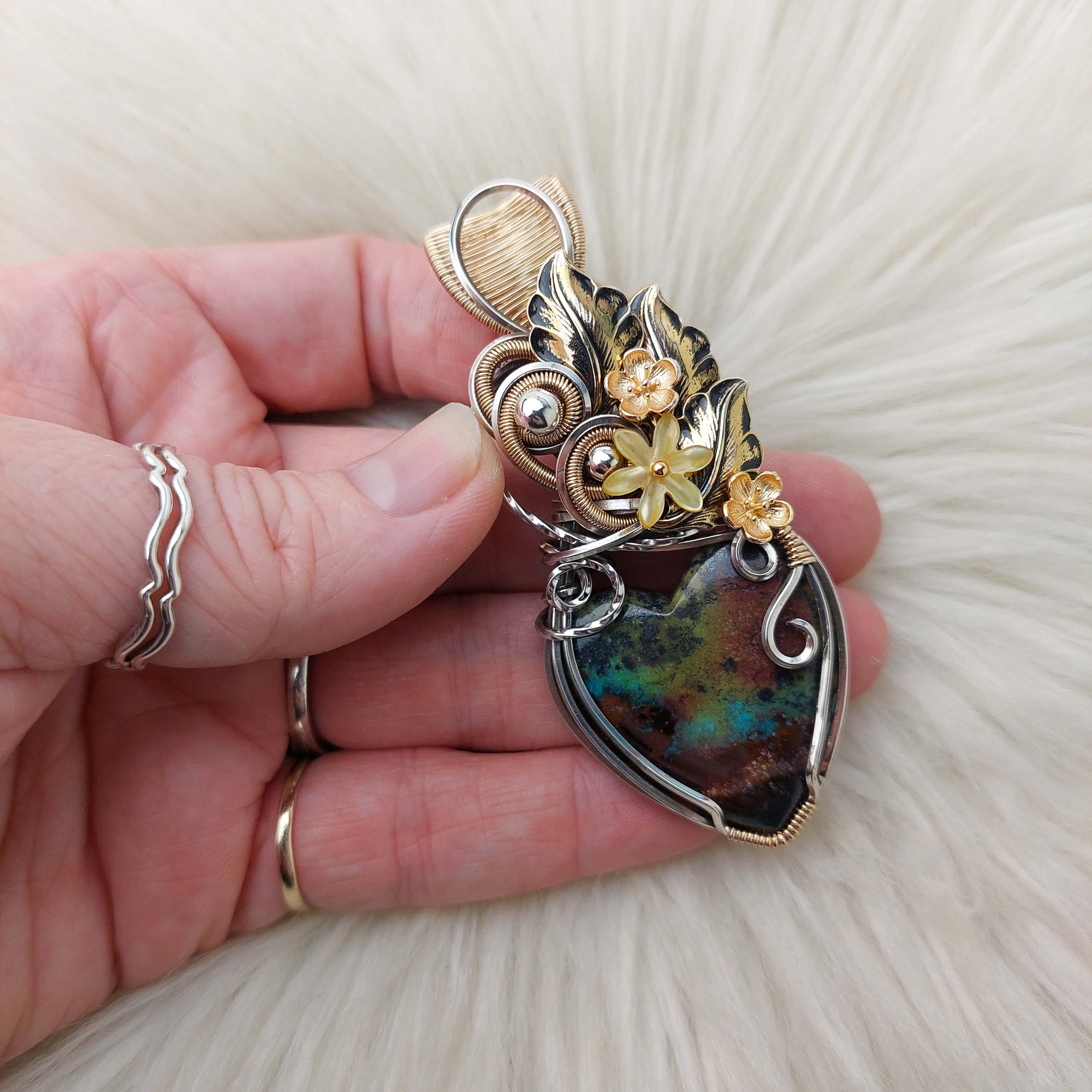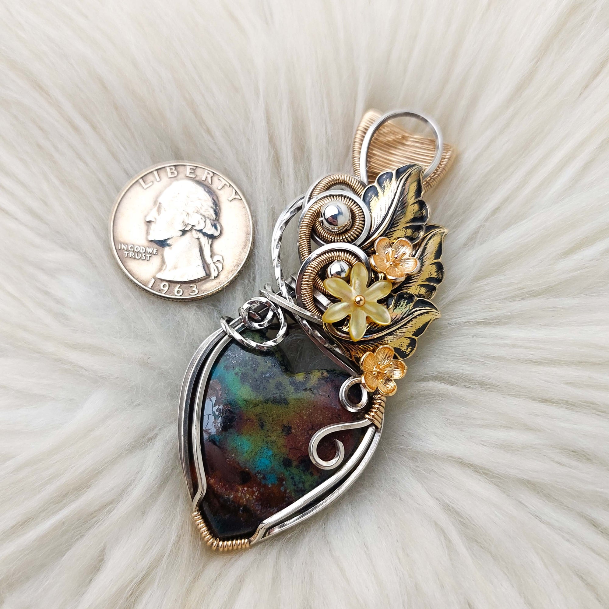 This pendant is absolutely stunning and very extra. The stone is a beautiful artisan cut Mindnight Apache. It was cut by Ben Kaniuth. The flowers are brass and shell. The beads are Sterling Silver. The leaves are brass. It is set in Sterling Silver and 14k gold filled wire. This pendant is large.
