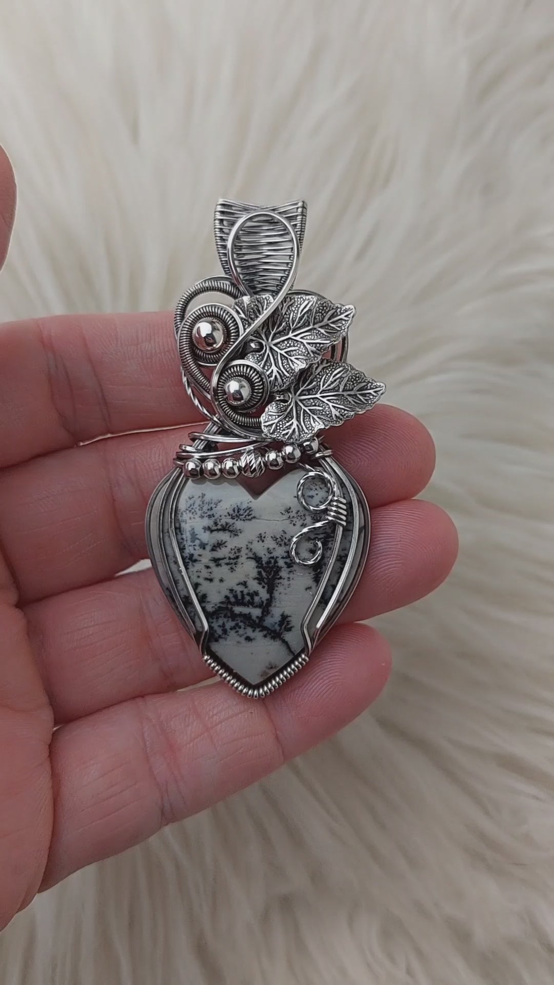 This pendant is absolutely stunning. The stone is a beautiful artisan cut Dendritic Opal. The leaves are silver-plated brass.The beads are Sterling Silver. It is set in Sterling Silver. This pendant is large.