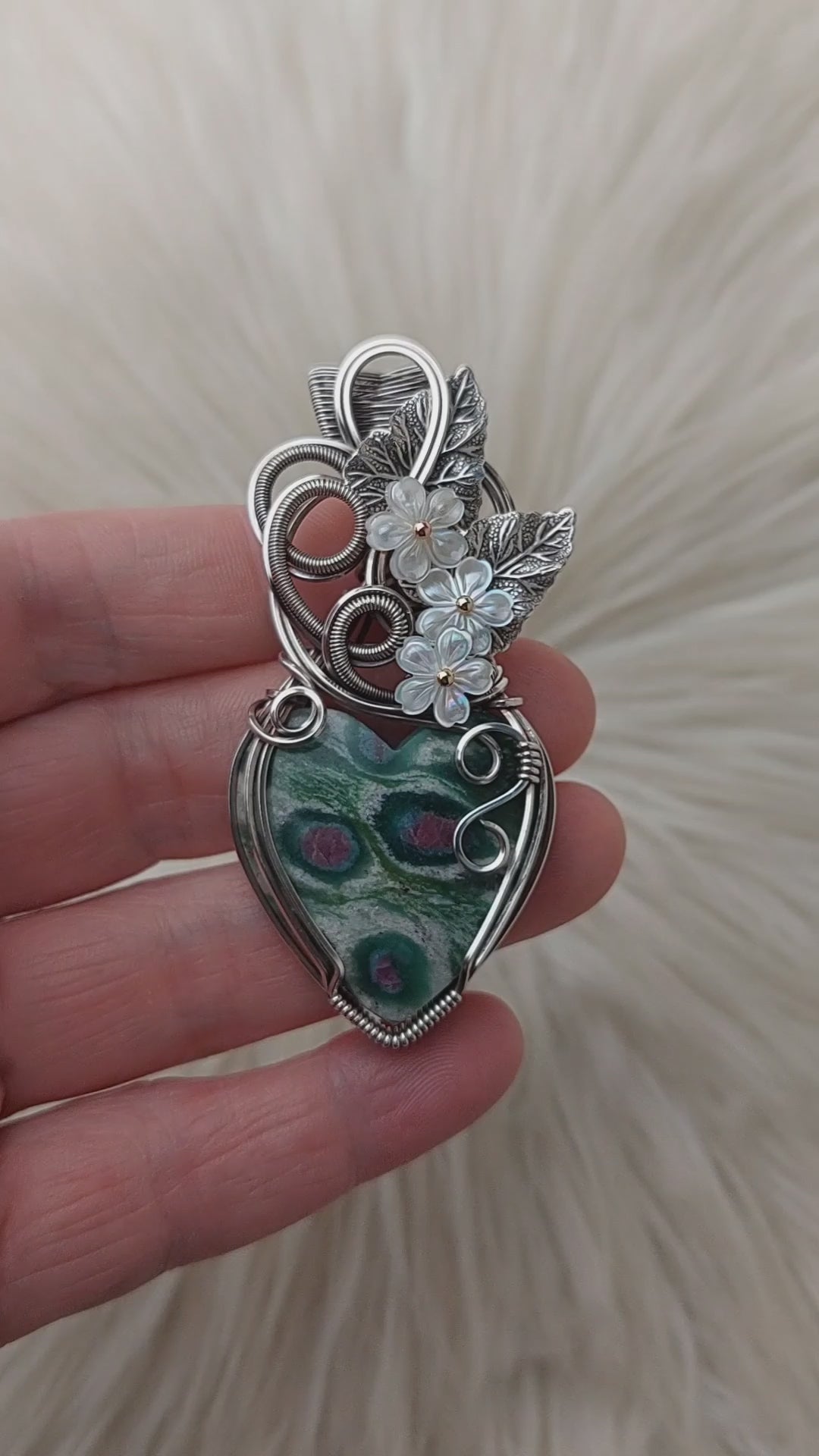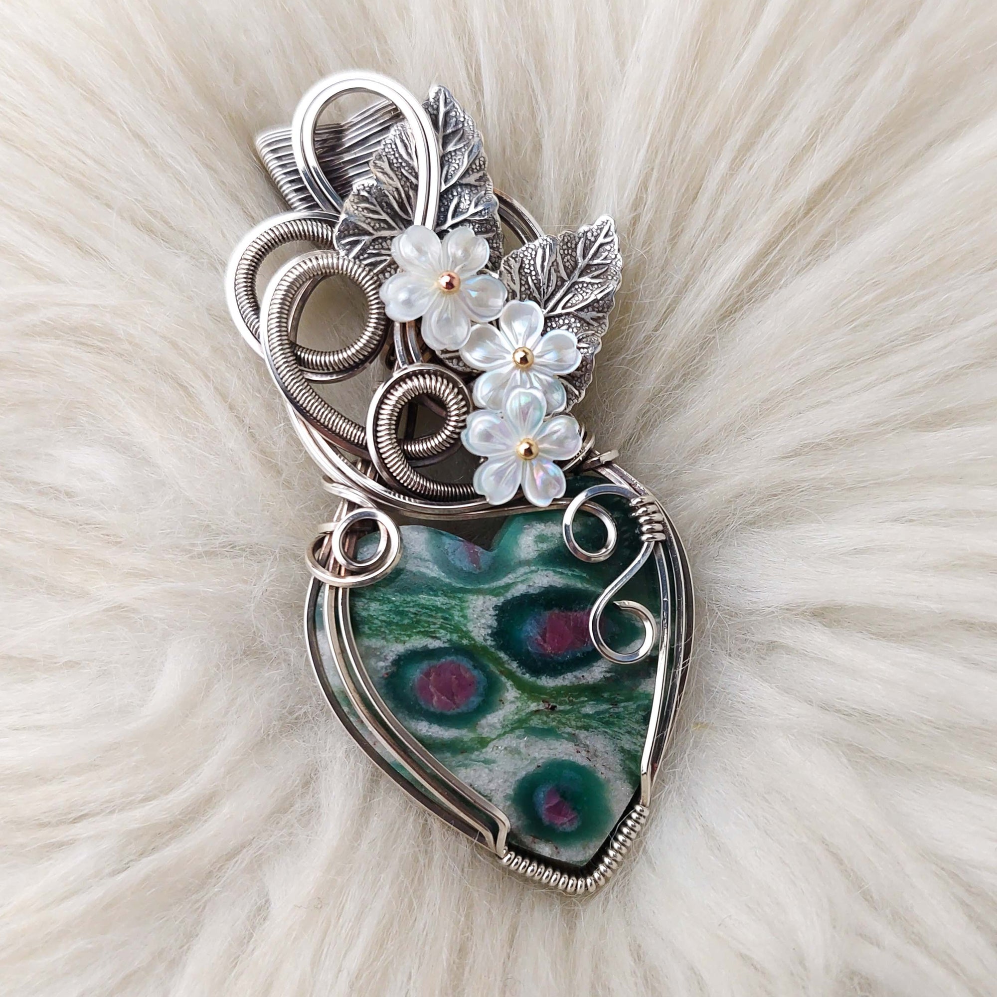 This pendant is absolutely stunning. The stone is a beautiful artisan cut Ruby In Fuchsite With Kyanite . It was cut by Rock Boss Lapidary. The leaves are silver-plated brass. The flowers are mother of pearl. It is set in Sterling Silver.