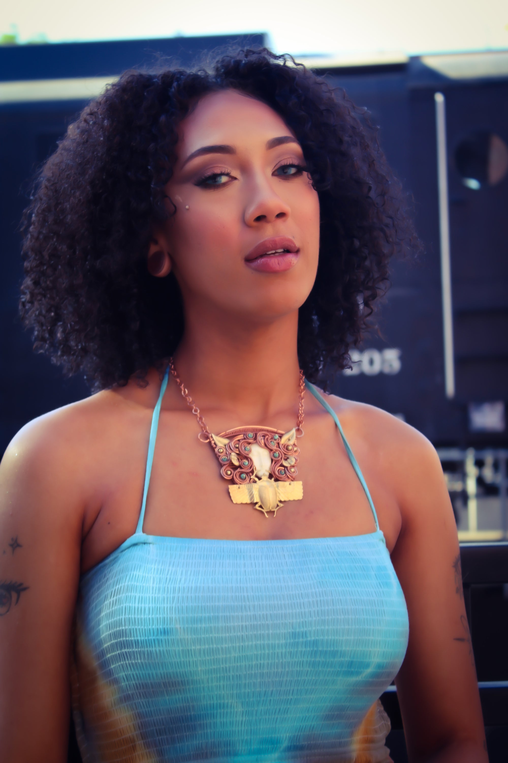 This necklace is absolutely beautiful, very unique, and very intricate. The goddess face is made from hand carved Buffalo bone. The beetles are brass. The beads are Kingman Turquoise. It's set in Copper. It's been oxidized and polished for an antiqued look.