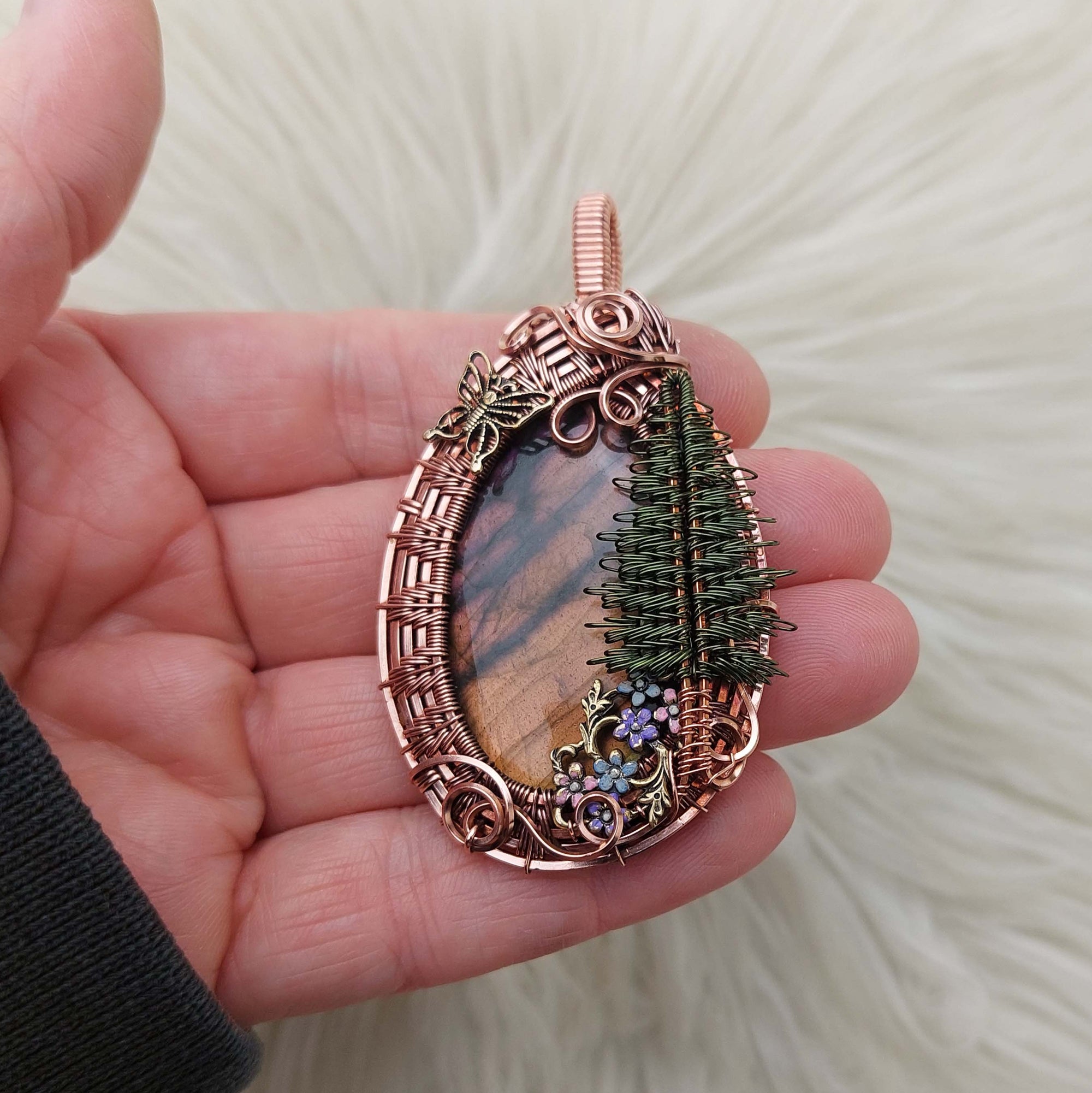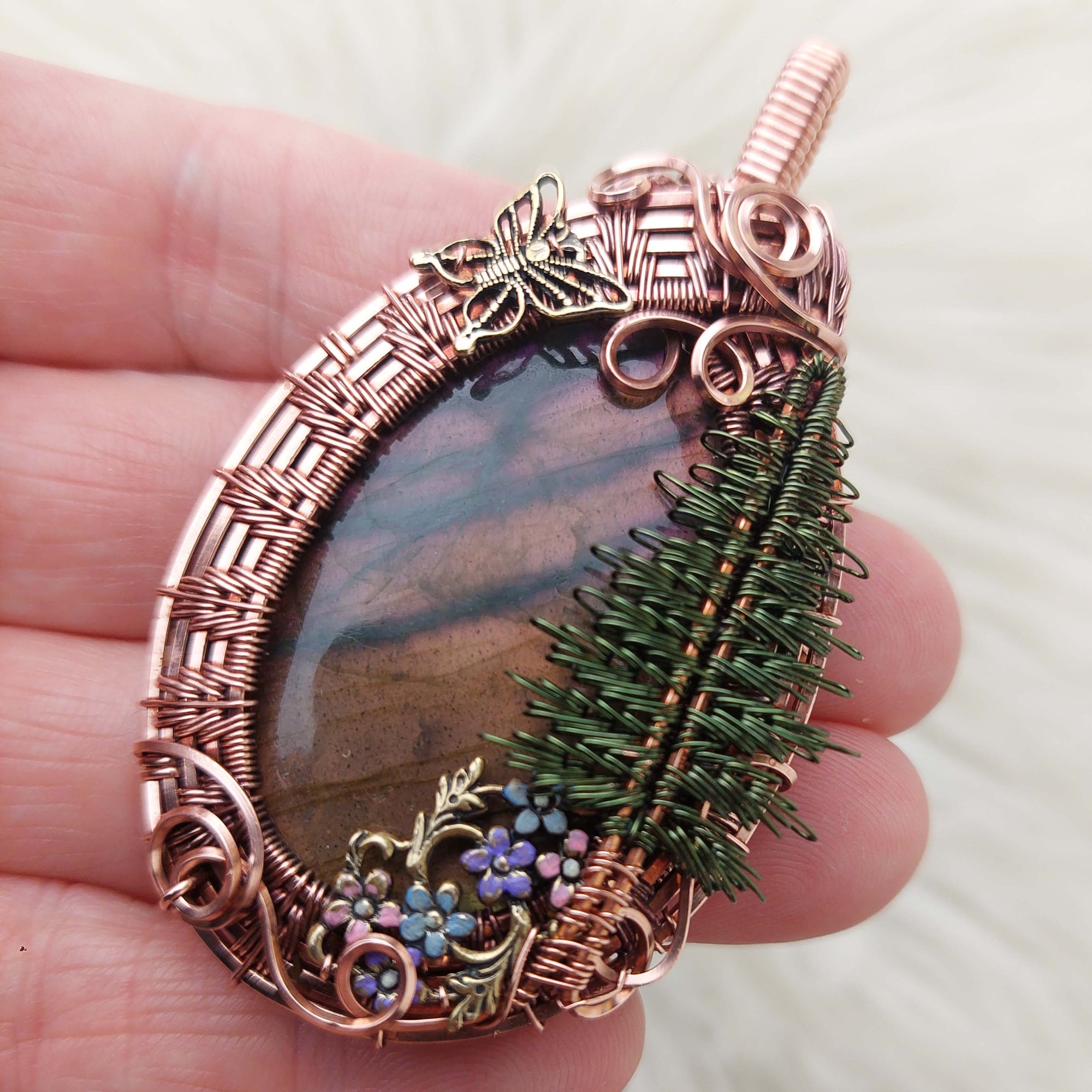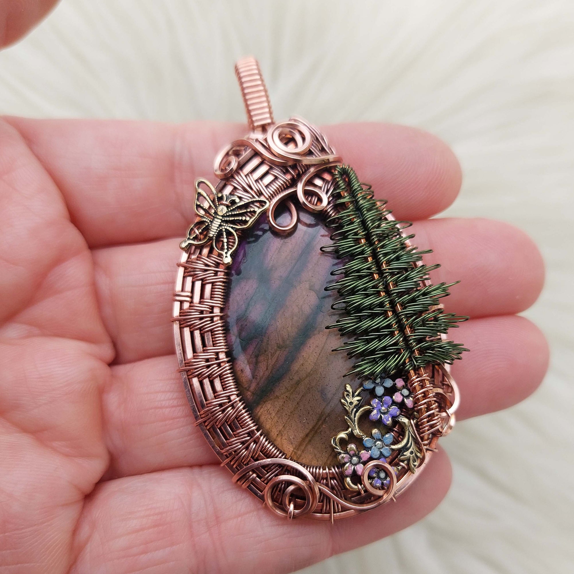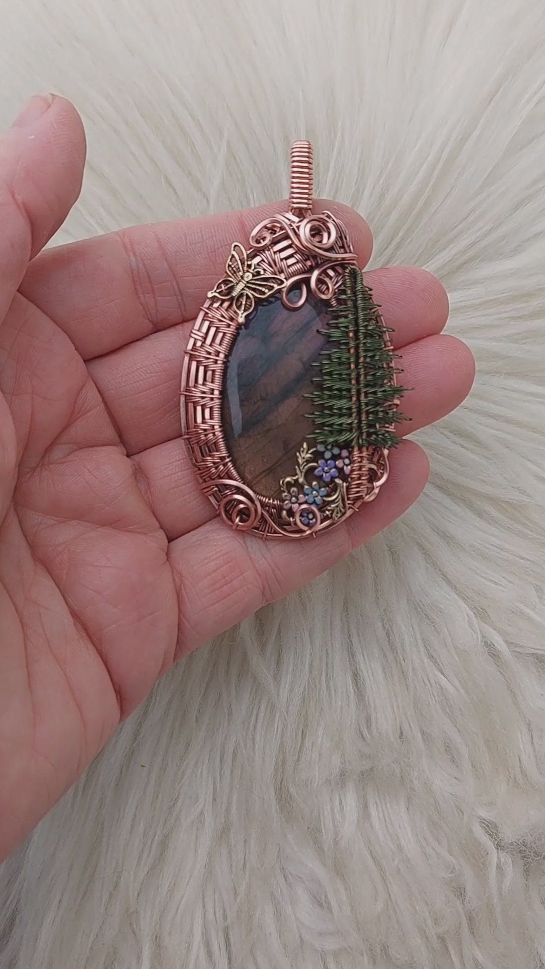This collaboration pendant is absolutely beautiful. The stone is a very beautiful and super flashy Labradorite. It's set in Copper. The flowers and butterfly are brass. The trees were made for me as a collaboration by Jennifer Haworth of Wild Raven Designs. She's the original designer of tree designs and a master tree maker. It's been oxidized and polished for an antiqued look.