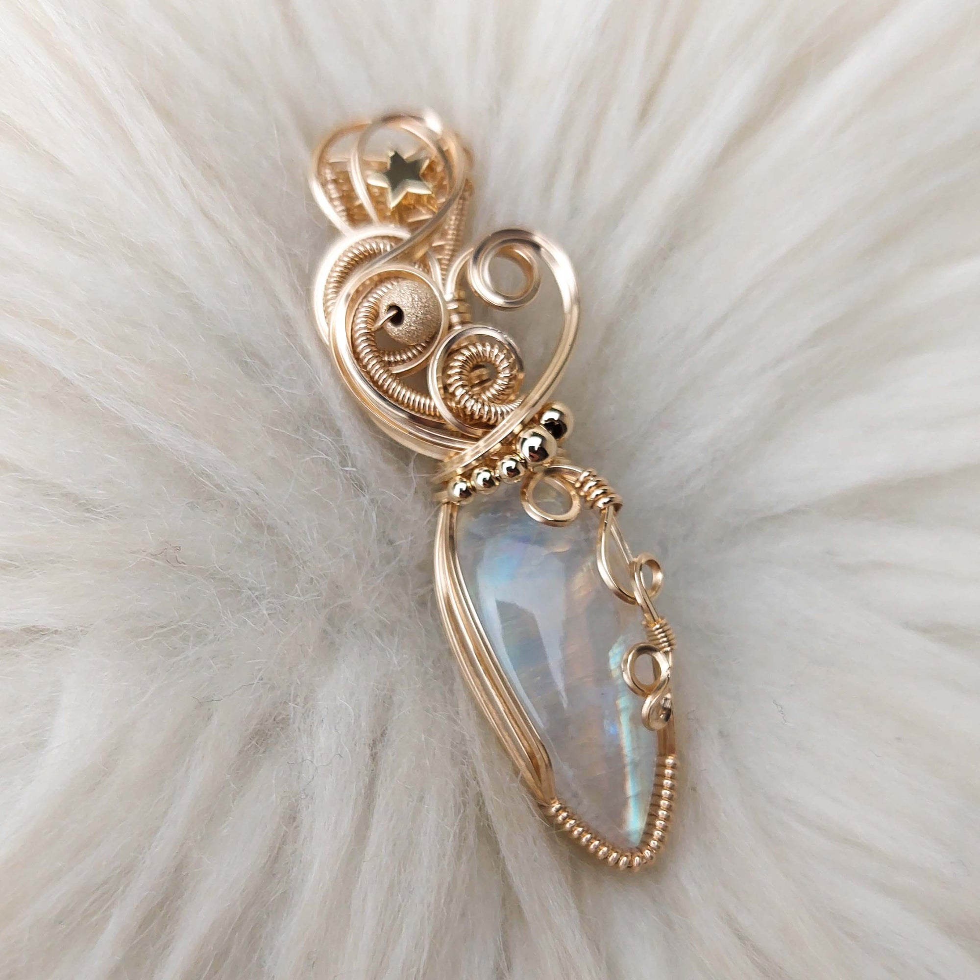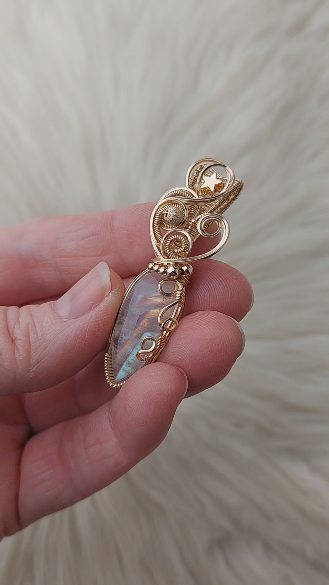 This pendant is very beautiful and super unique. The stone is a very pretty, super gemmy, raibow flash Moonstone. It is set in 14k Goldfill wire. The beads and star are 14k Goldfill as well.