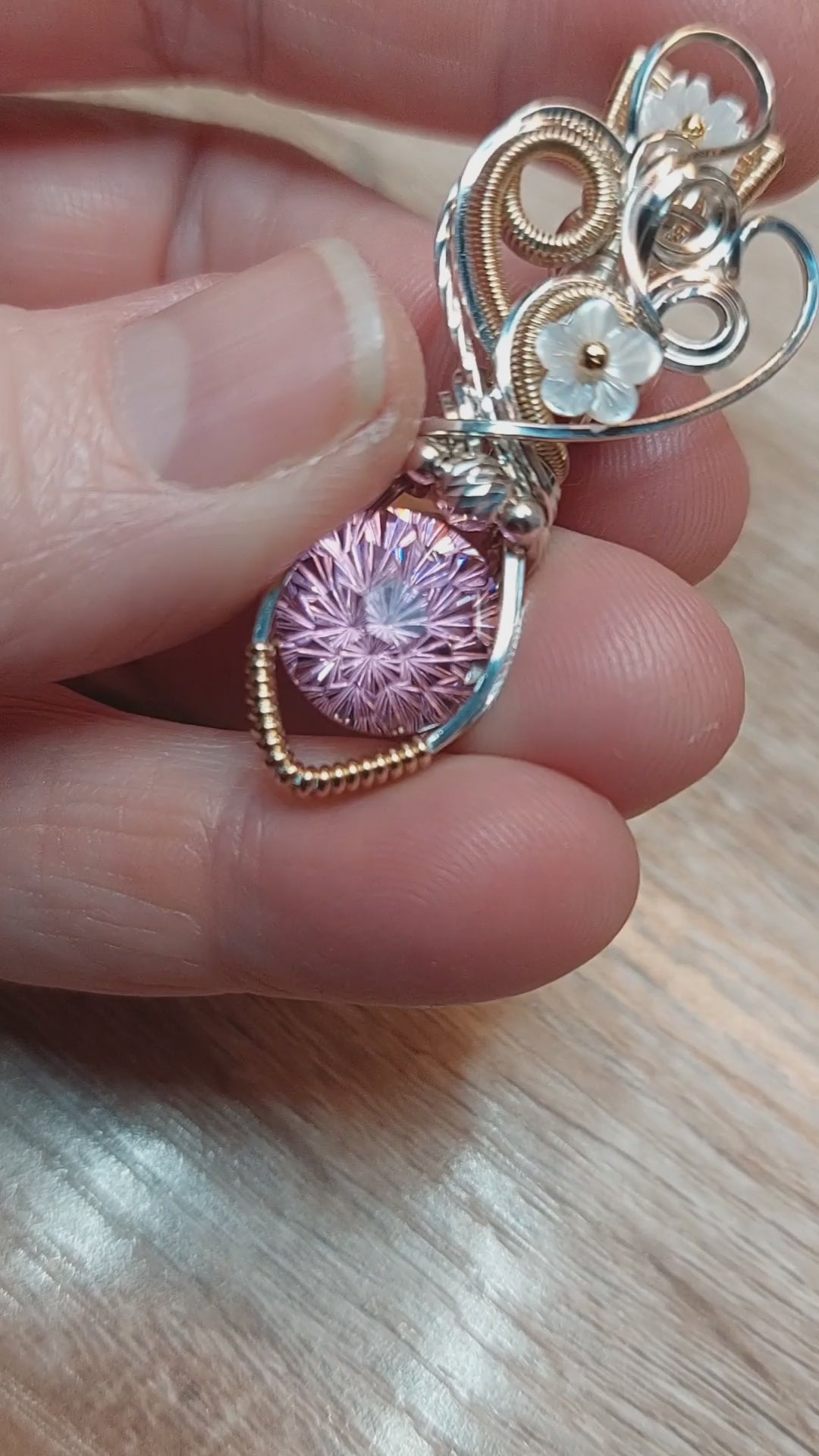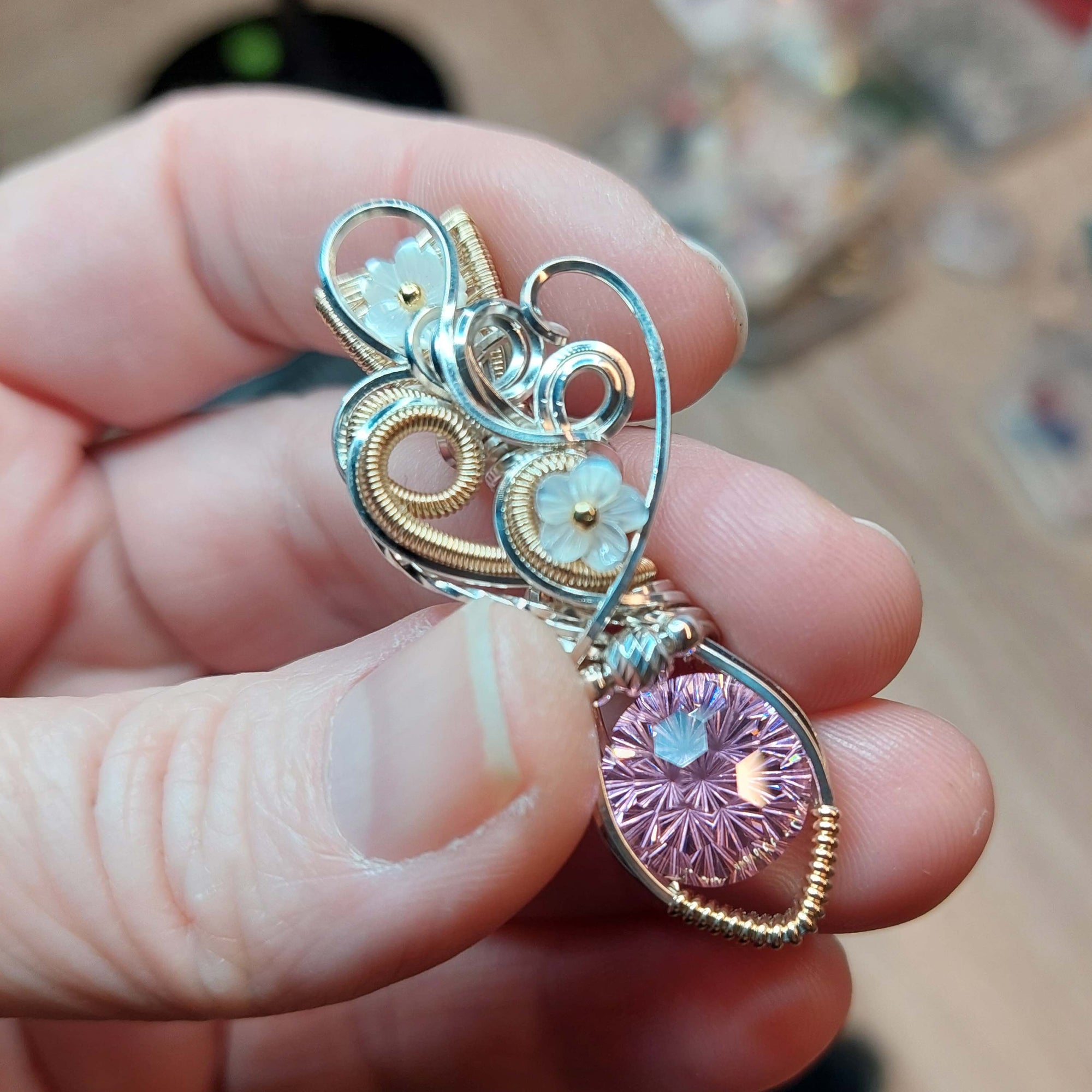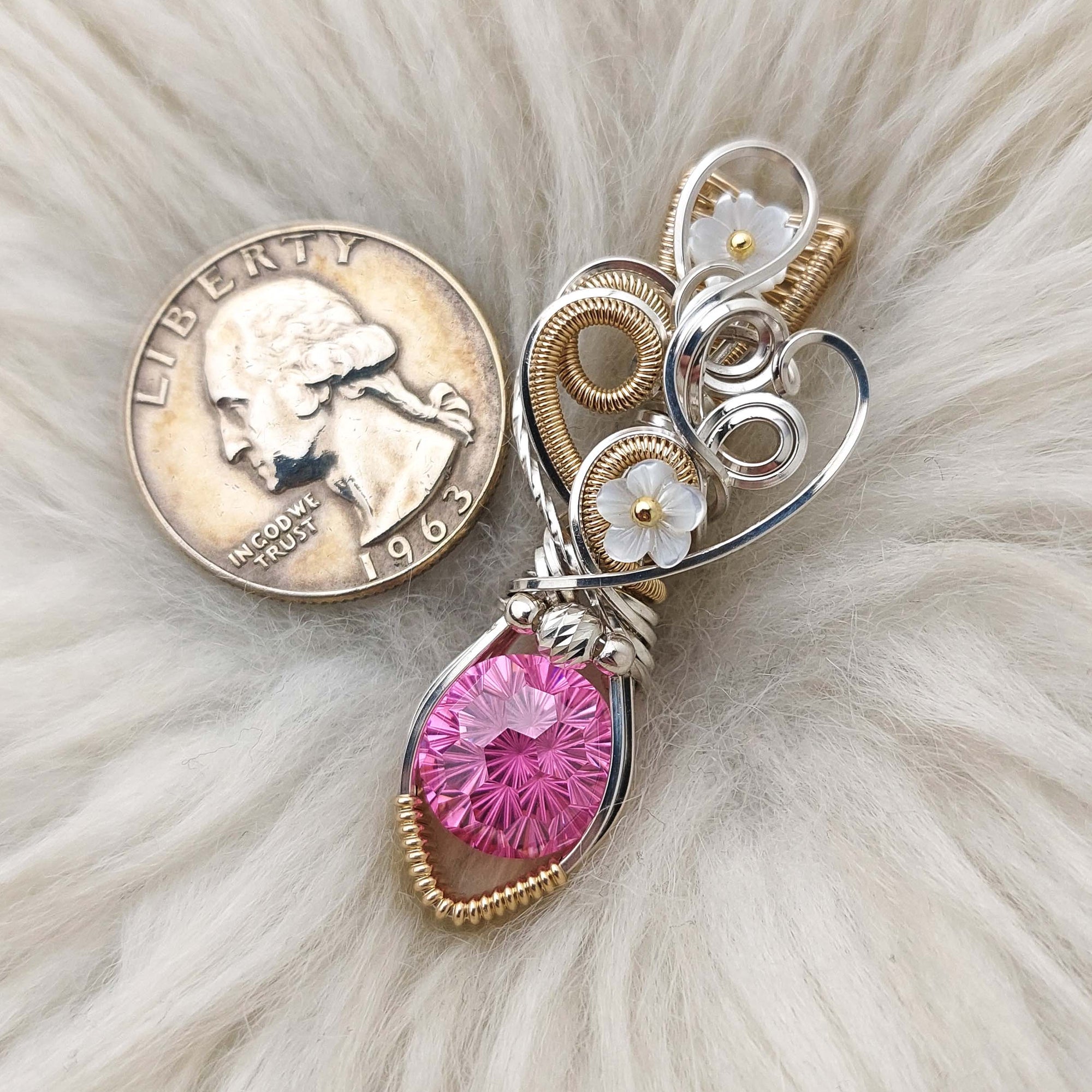 This pendant turned out absolutely beautiful. The stone is a very pretty 12ct Fireworks Cut Cubic Zirconia. It changes color from a light pink to a bright pink depending on the light source. It's set in solid Sterling Silver and 14k gold filled wire. The beads are Sterling Silver. It's only been polished.