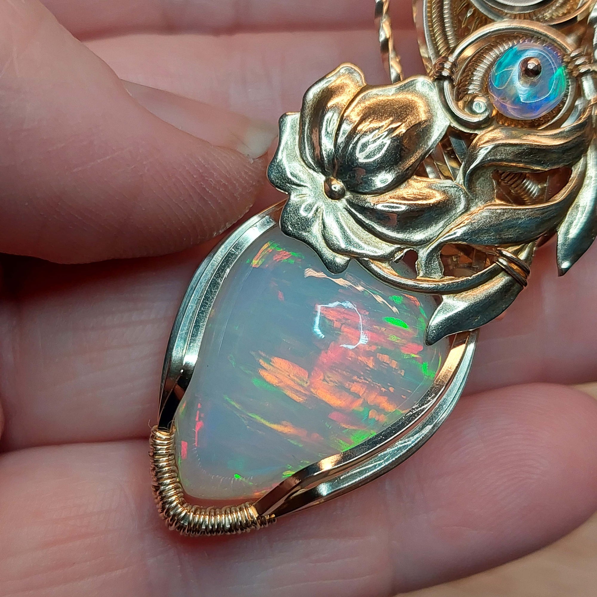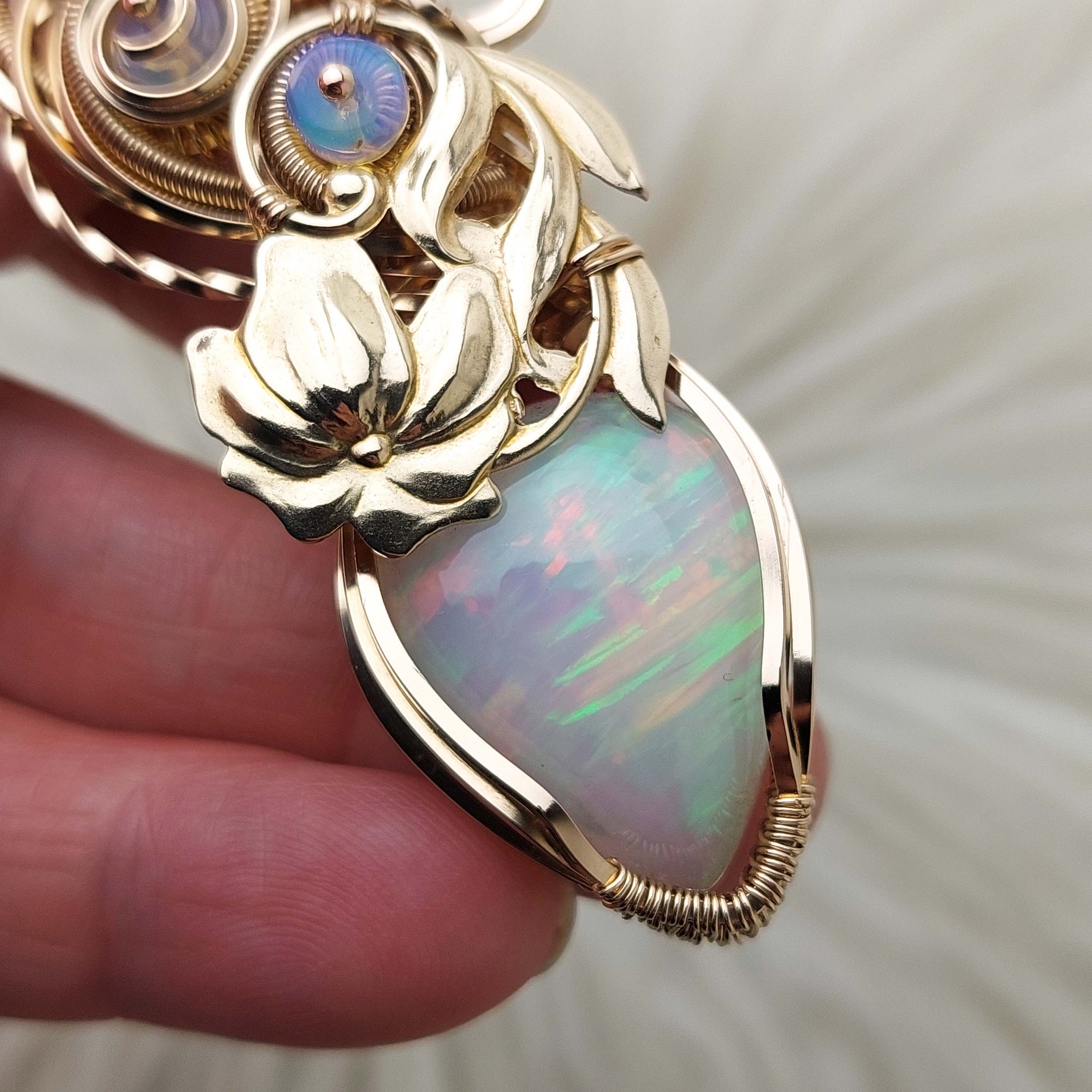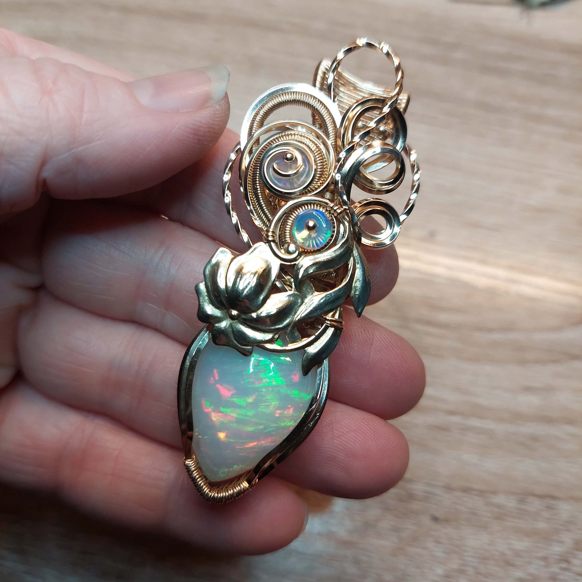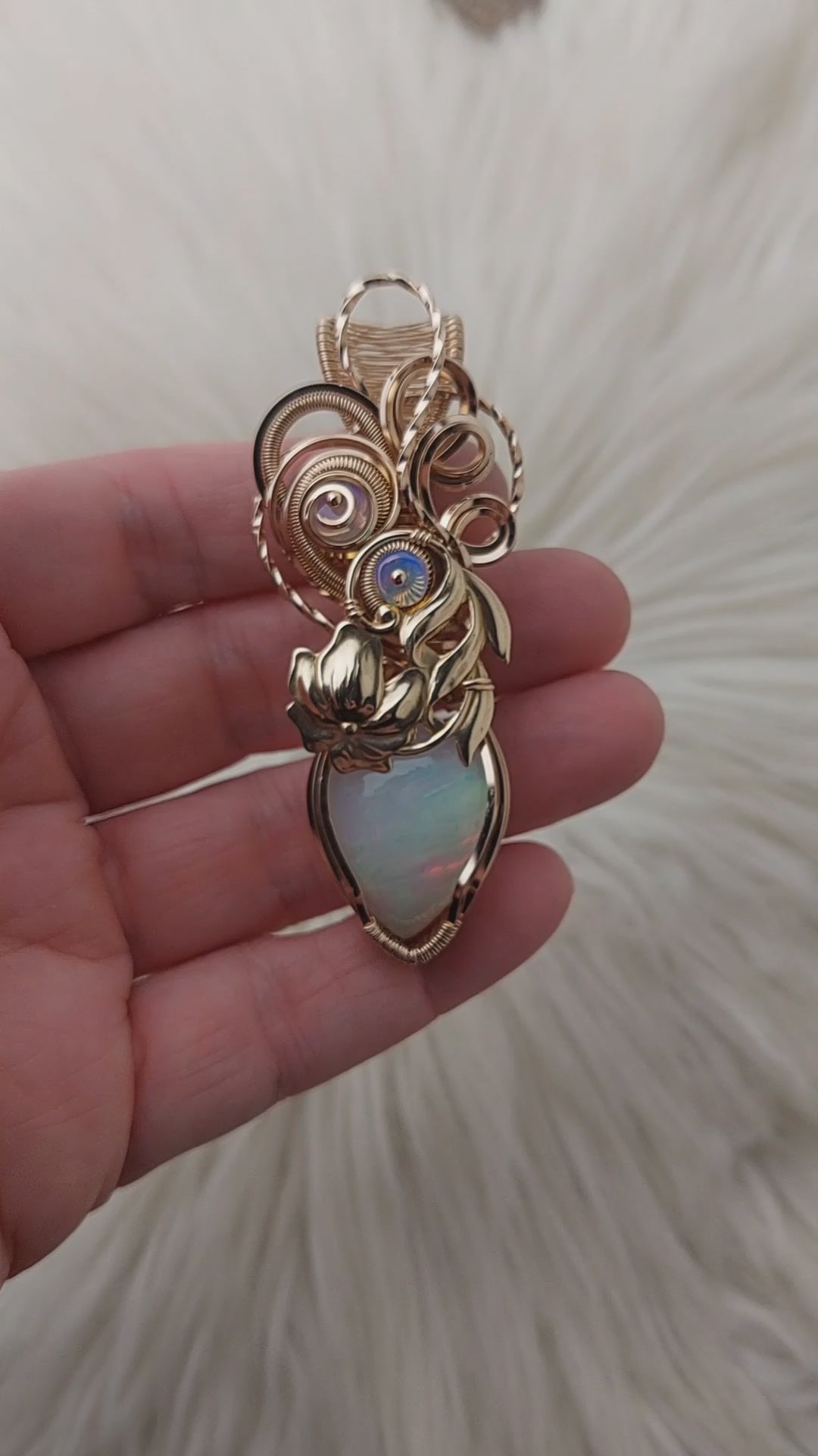 This pendant turned out absolutely beautiful. The stone is a very pretty natural 21.5ct. natural white base Ethiopian Opal. It's set in high quality 14k Goldfill wire. The beads are Ethiopian Opal. The flower is gold plated brass. It's only been polished.