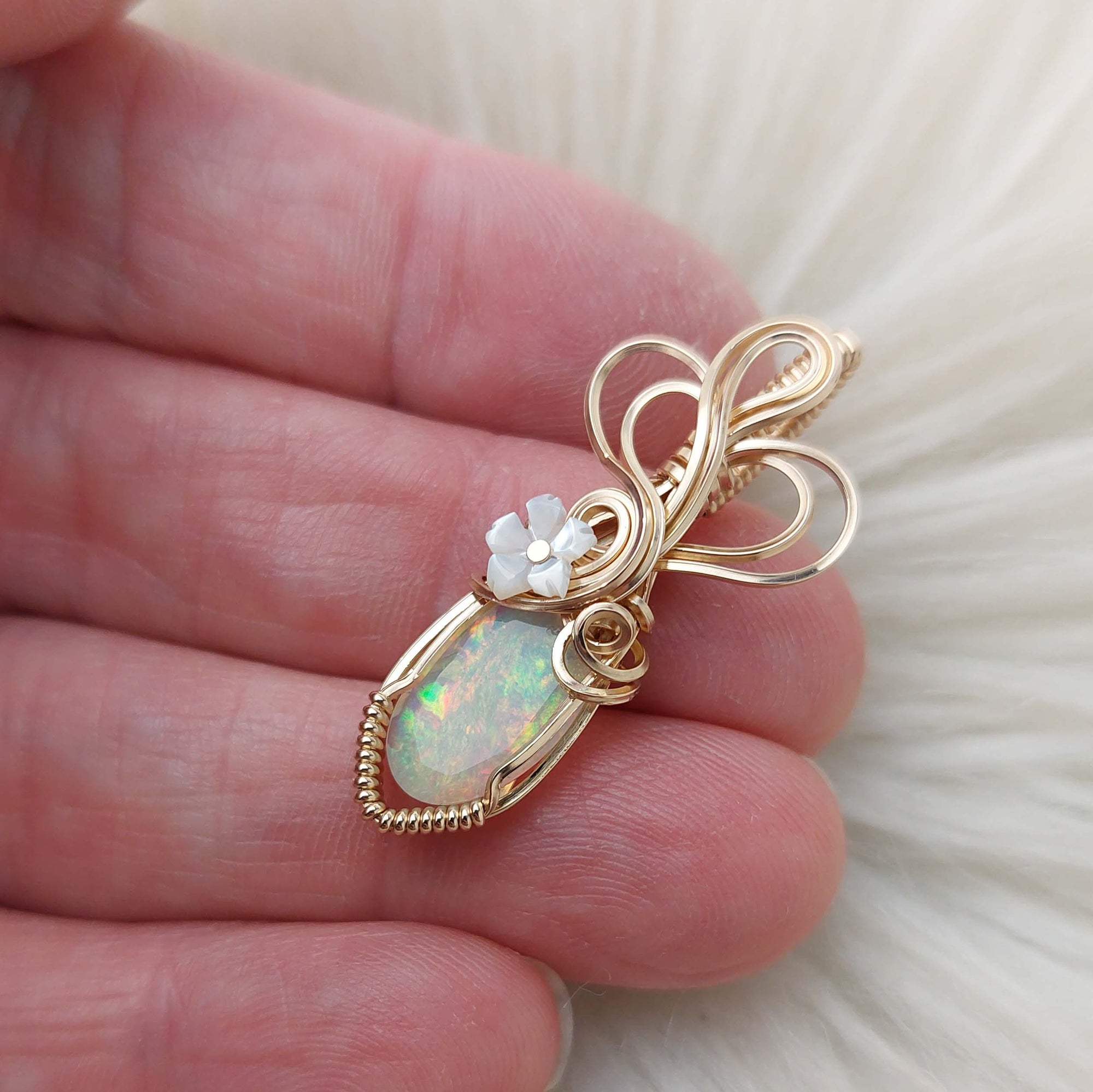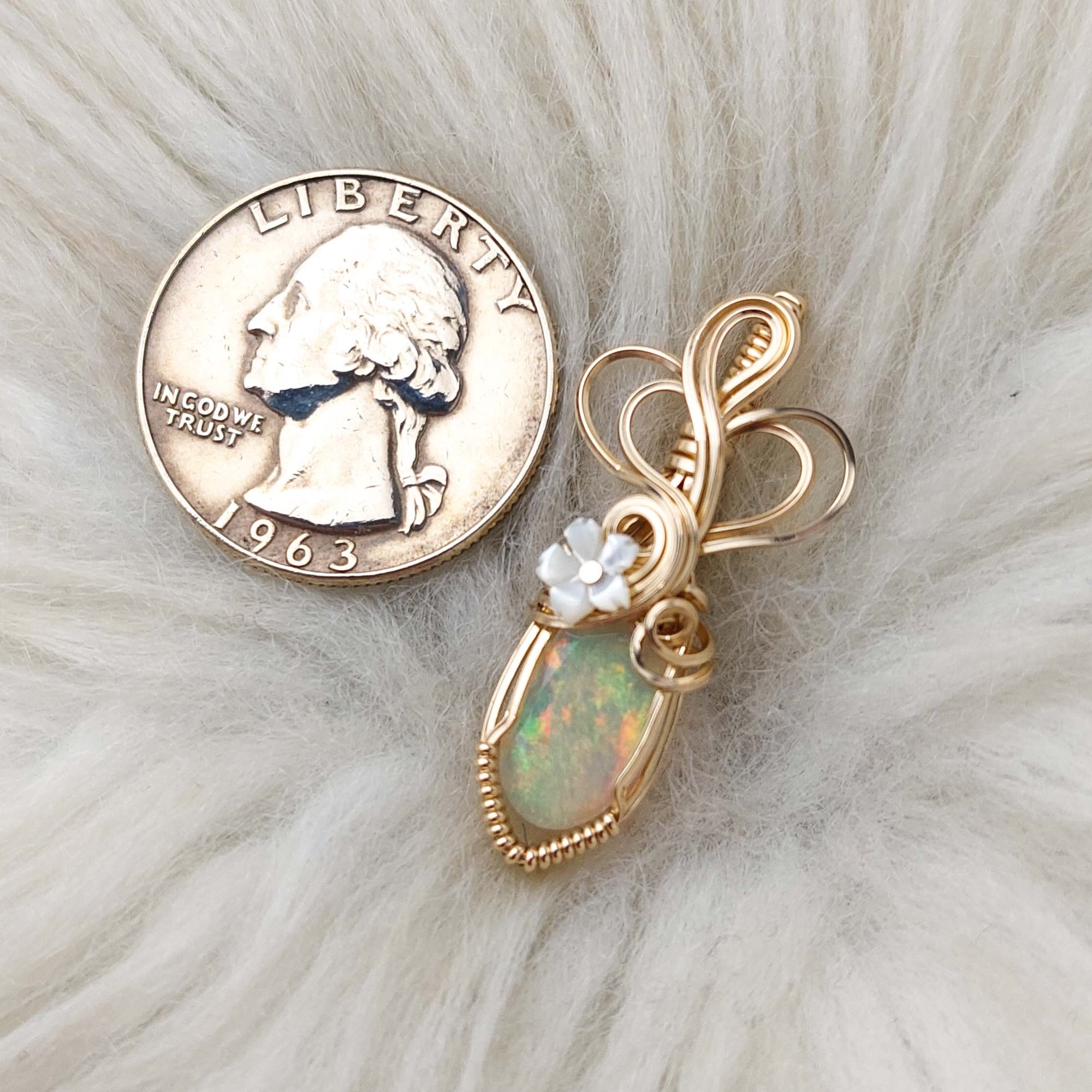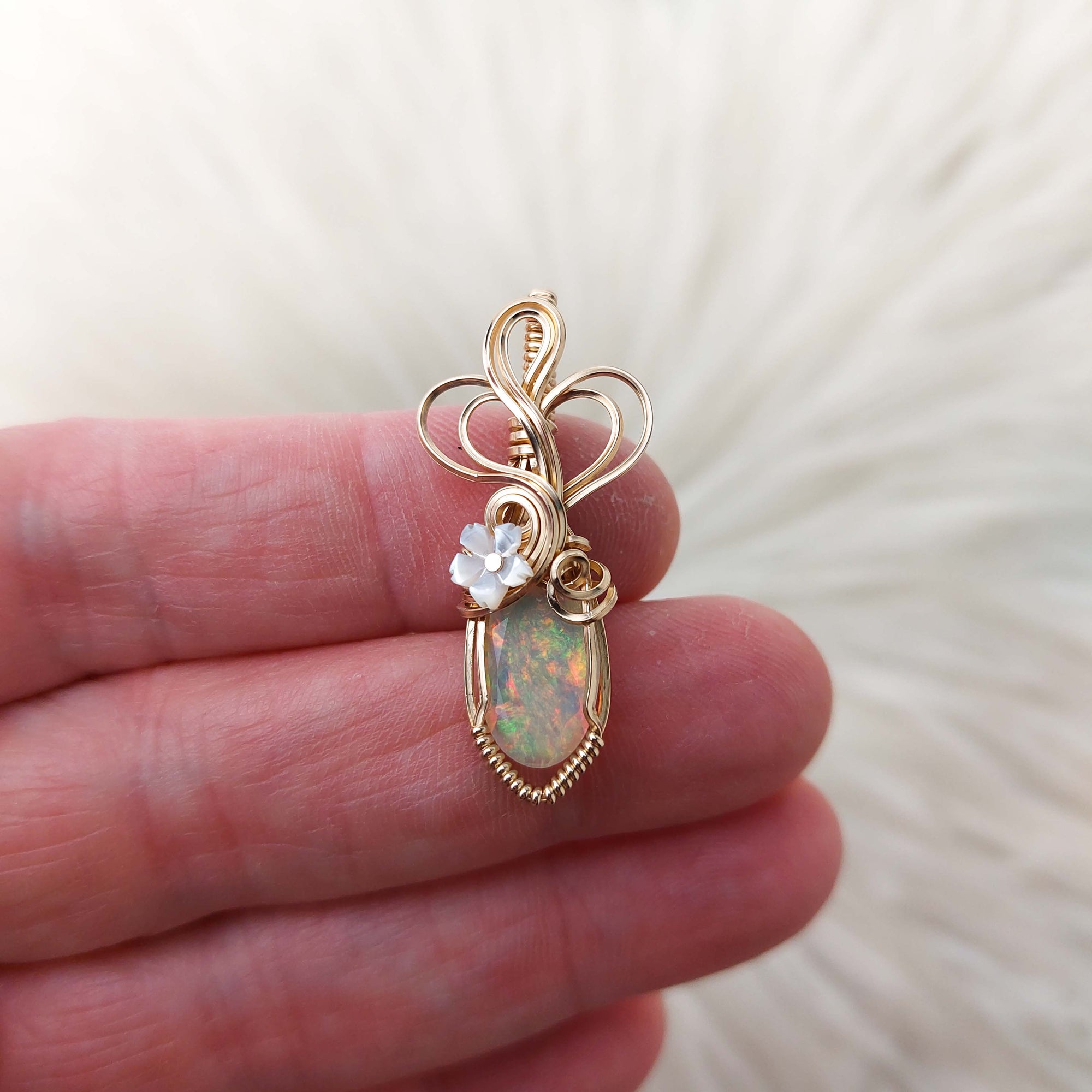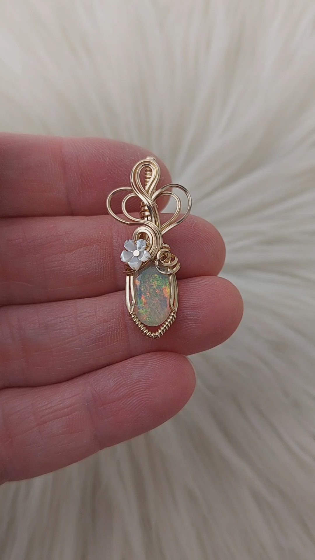 This pendant turned out really beautiful. The stone is a very pretty natral 2 ct. Ethiopian Opal. It's set in high quality 14k Goldfill wire. The flowers are mother of pearl. It's only been polished.