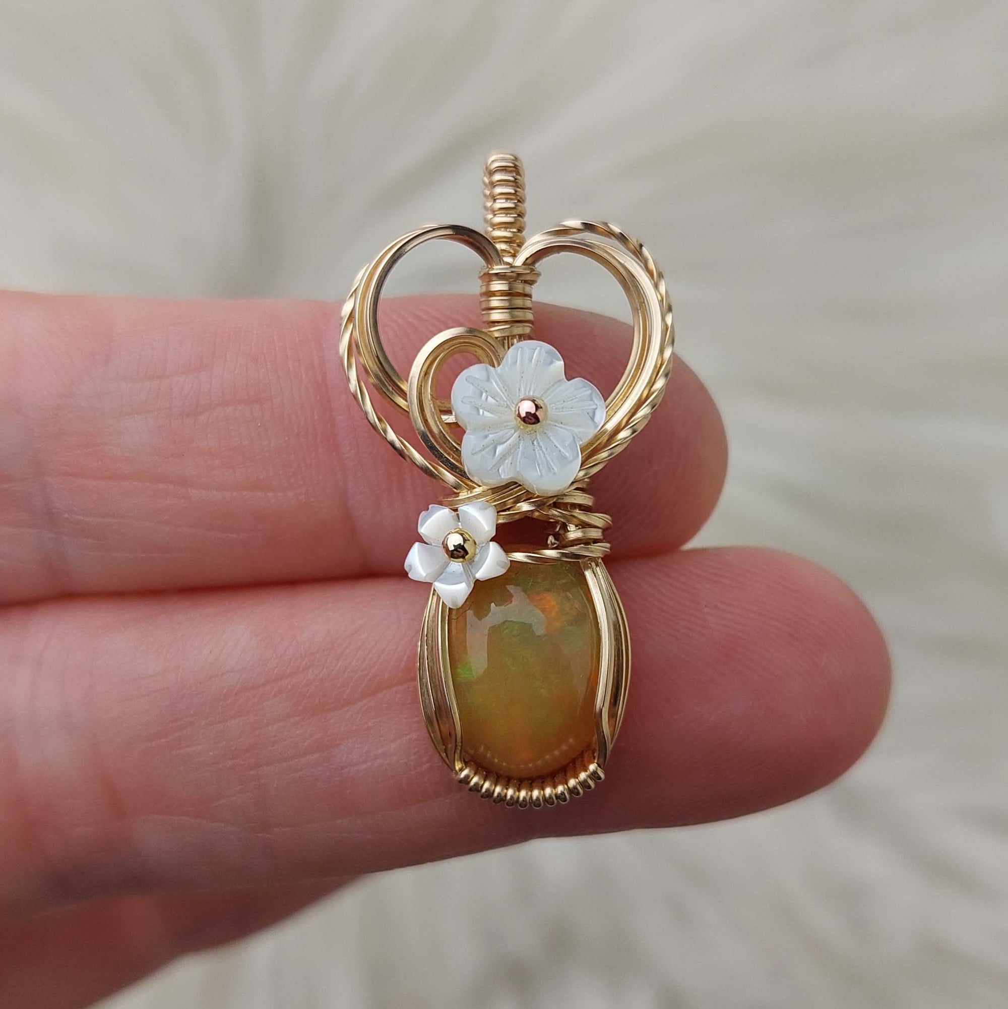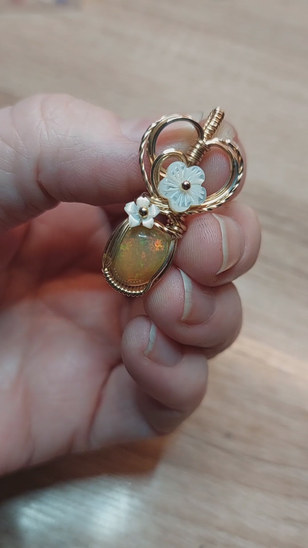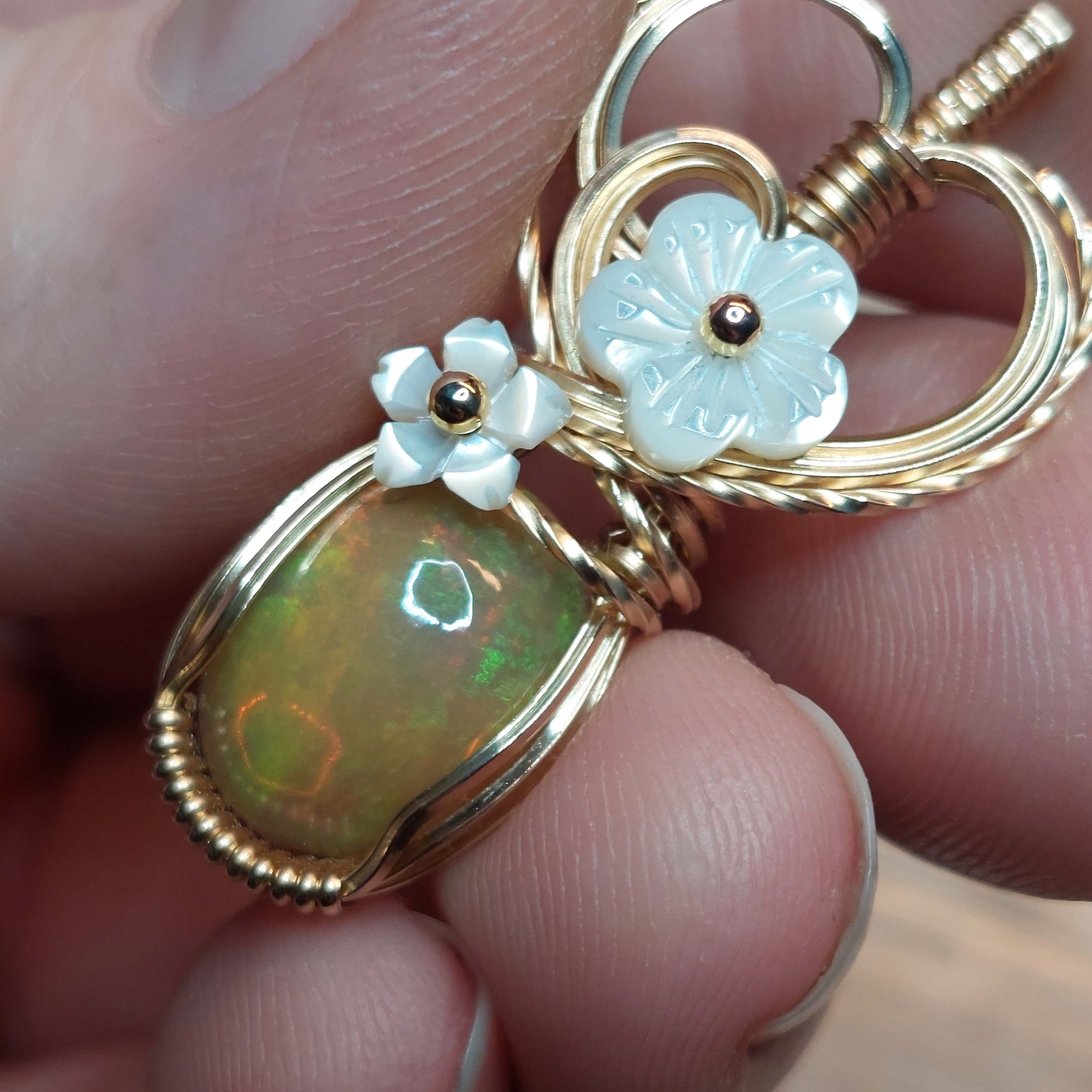 This pendant turned out really beautiful. The stone is a very pretty natral 2 ct. Ethiopian Opal. It's set in high quality 14k Goldfill wire. The flowers are mother of pearl. It's only been polished.
