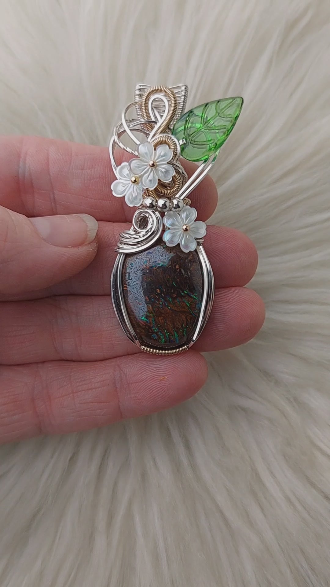 This pendant is absolutely stunning. The stone is a 40 ct Australian Boulder Opal. The flash is beautiful. It was artisan cut by Brandee Sue Carpentier. The leaf is glass. The flowers are shell. It's set in solid sterling silver. This pendant has only been polished