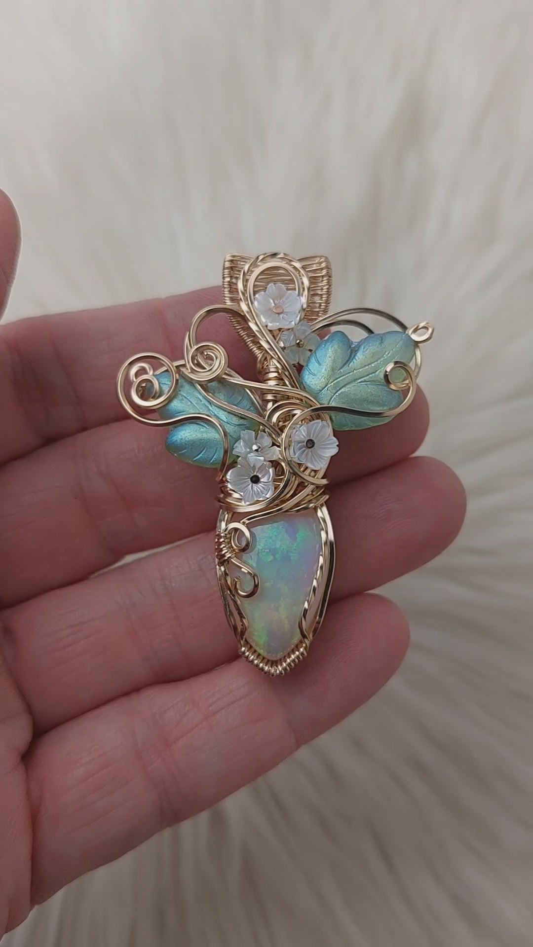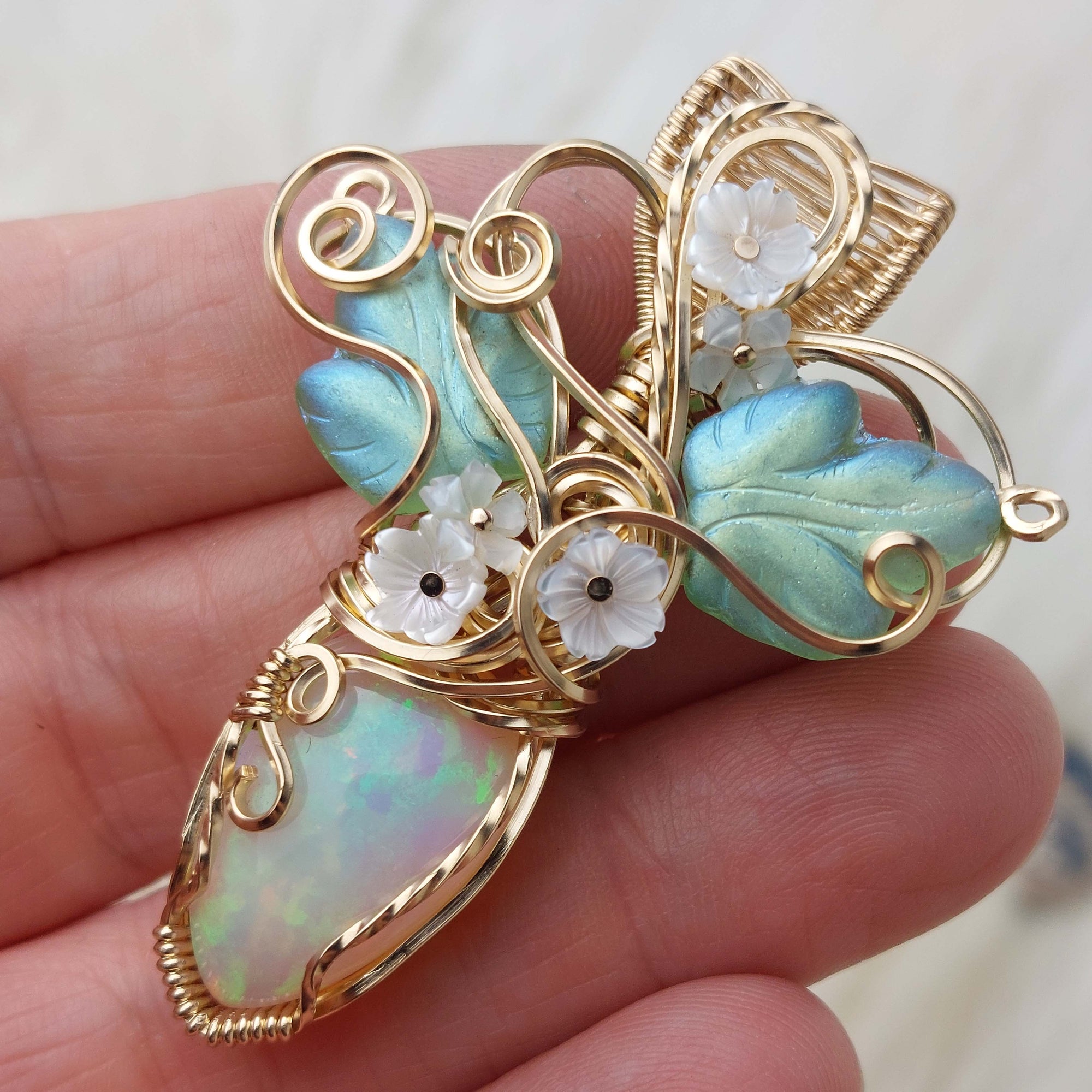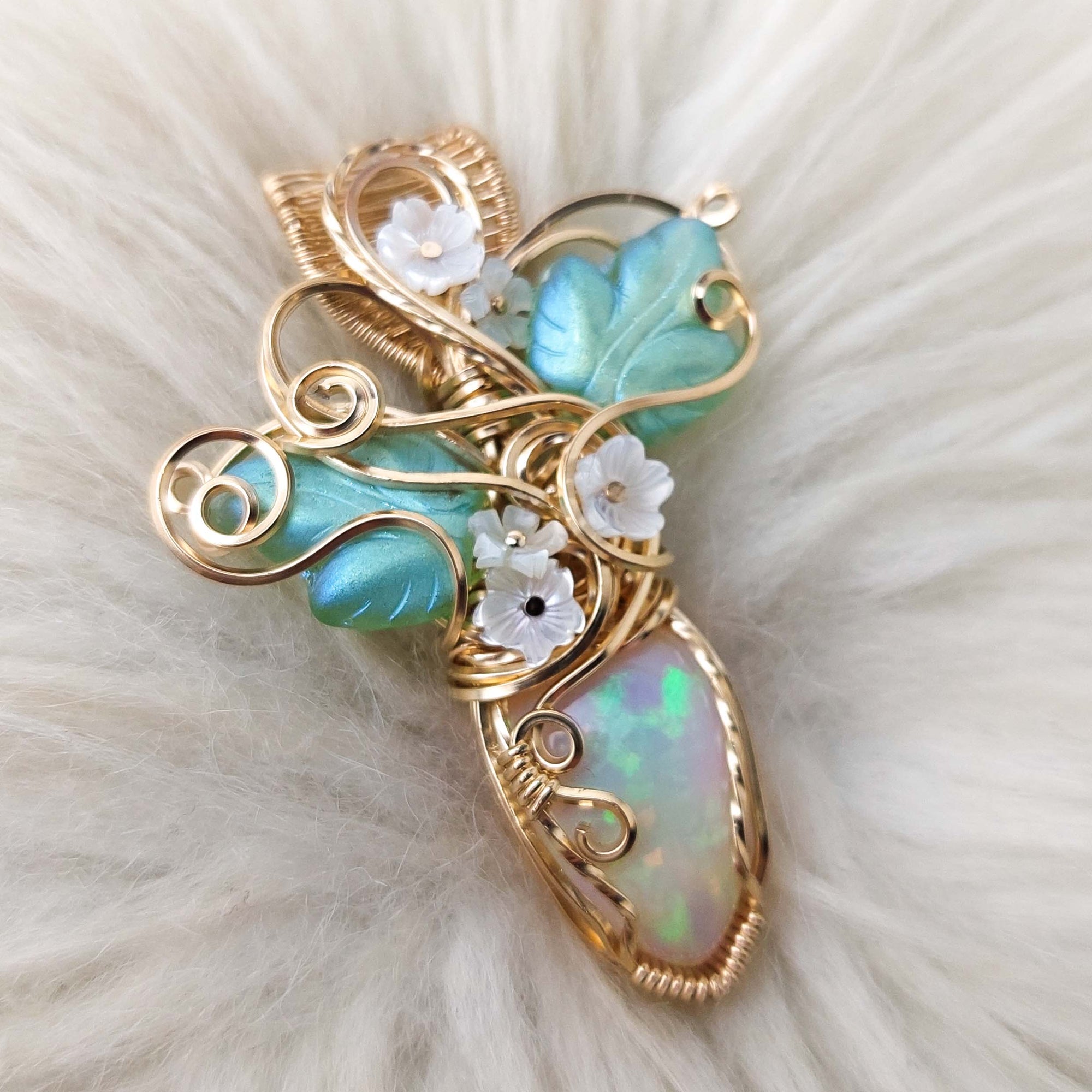 This pendant is absolutely stunning. It says I'm a fairy princess for sure. The stone is a 14.5 ct AAA Ethiopian Opal. The flash in this stone is incredible. The front is a beautiful spread out pattern and the back is an incredible honeycomb. This is one of the prettiest opals I have seen. The leaves are vintage Czech Glass. The flowers are mother of pearl. It's set in 14k Goldfilled wire. This pendant has only been polished.