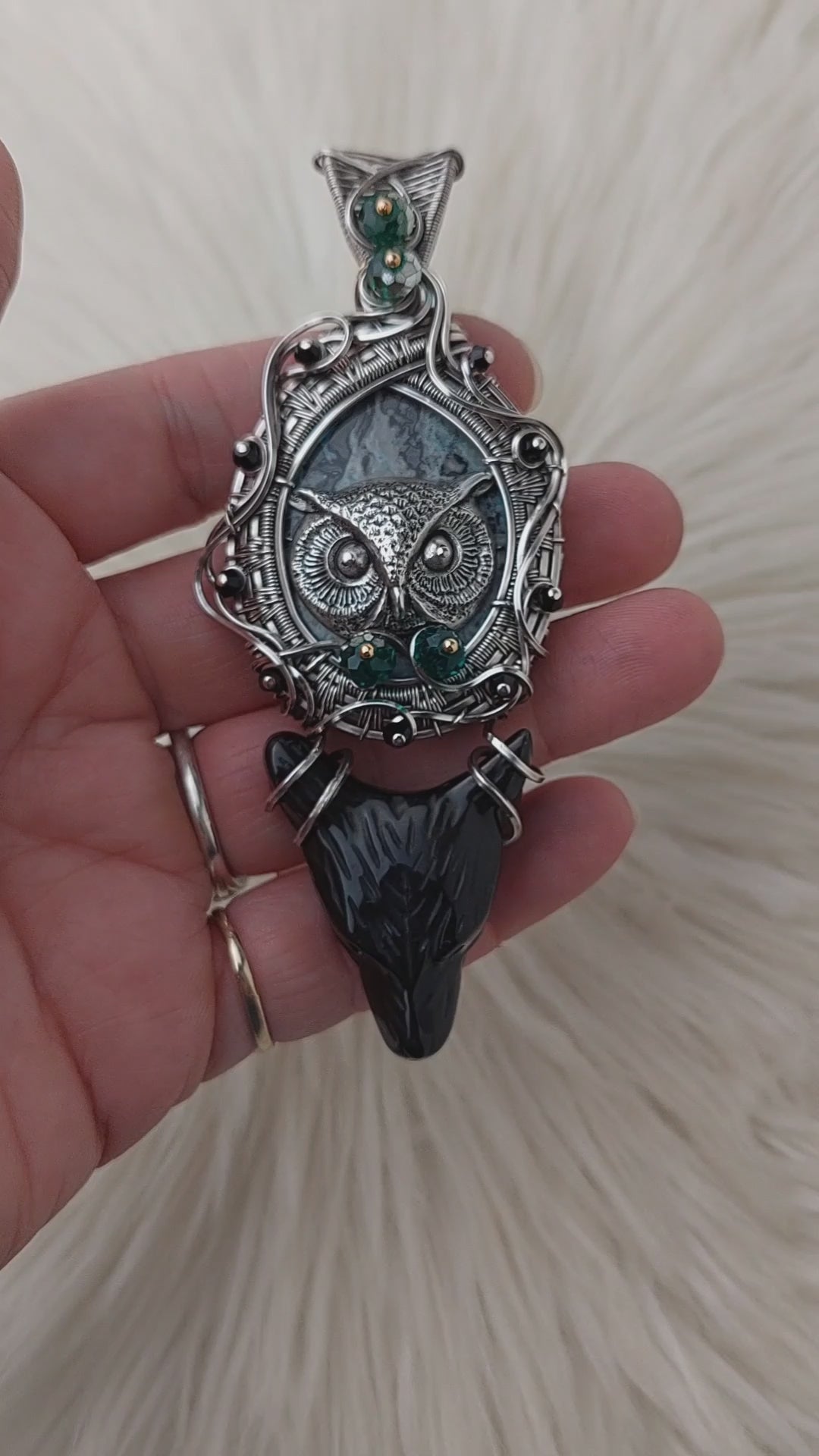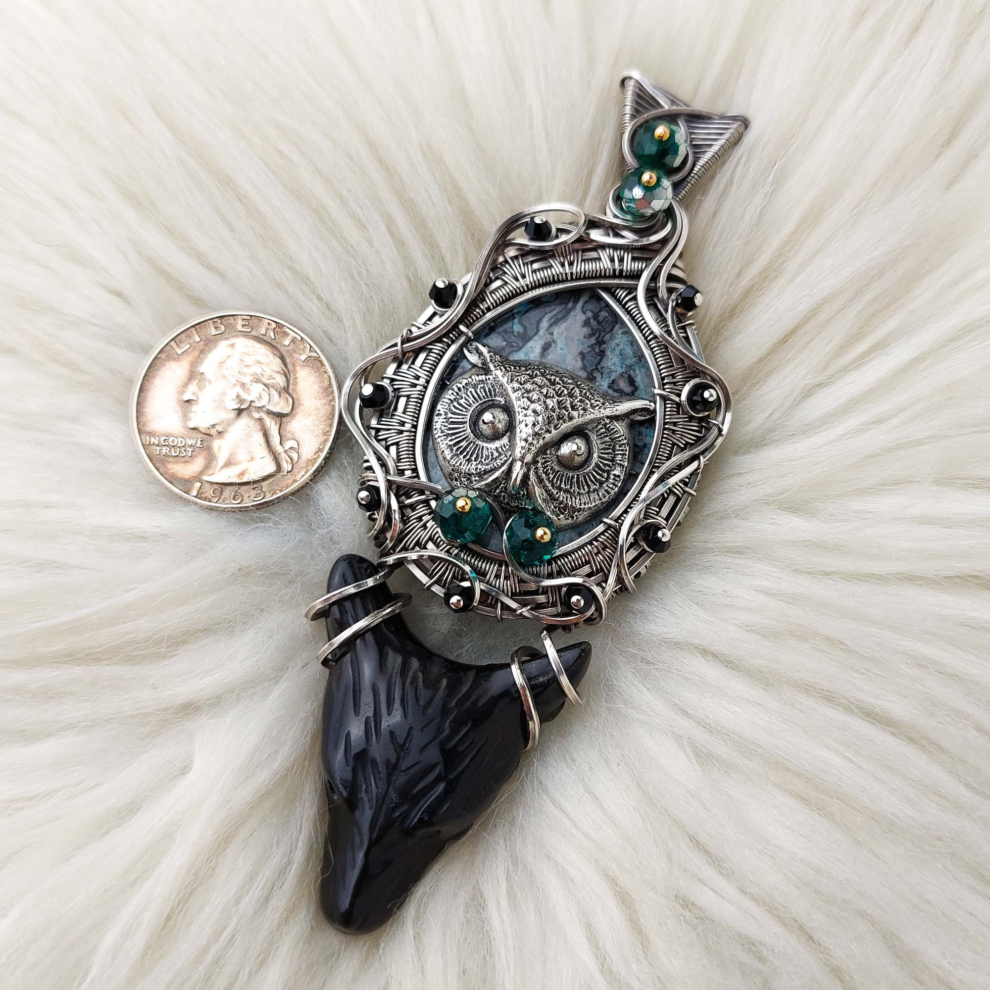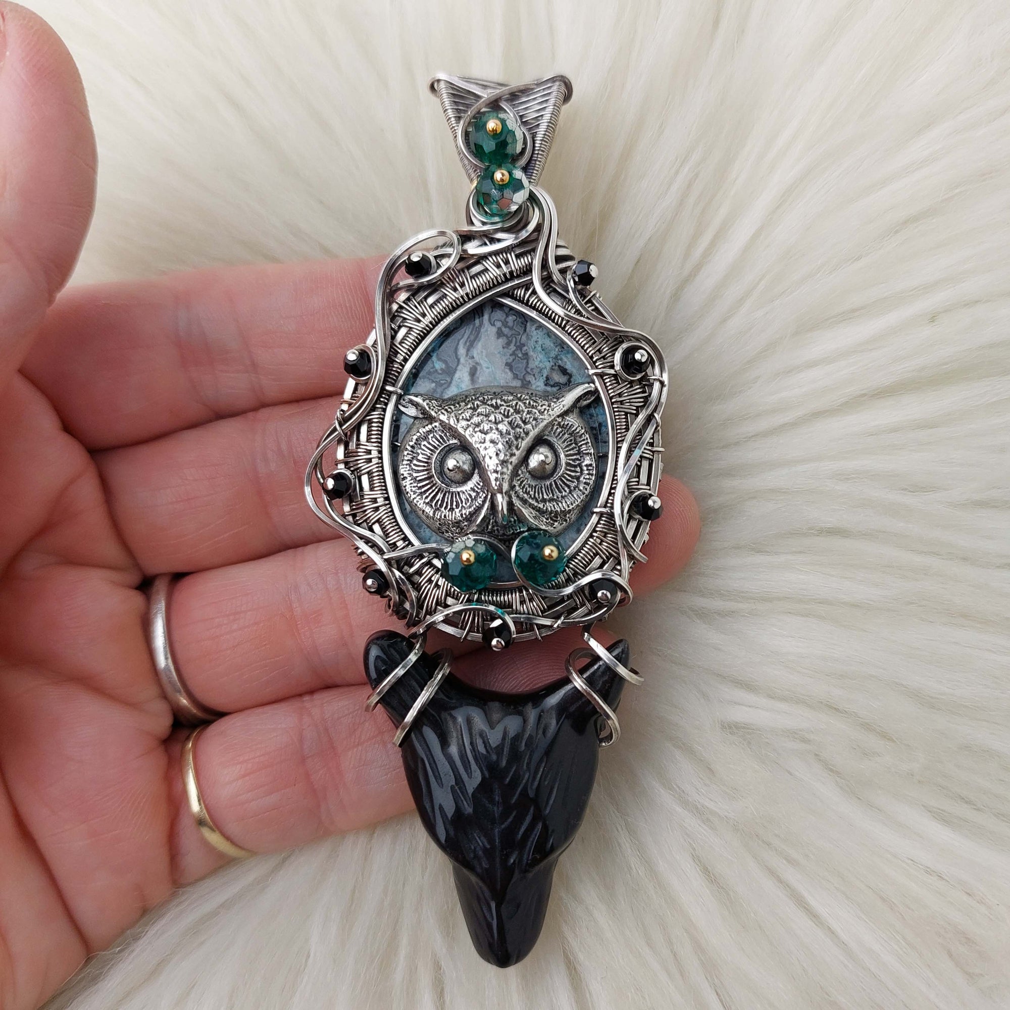 This is a very beautiful pendant. The stone is a stunning Dyed Agate. The Wolf head is Obsidian. It's set in Solid Sterling Silver wire. This pendant has been oxidized and polished for an antiqued look.