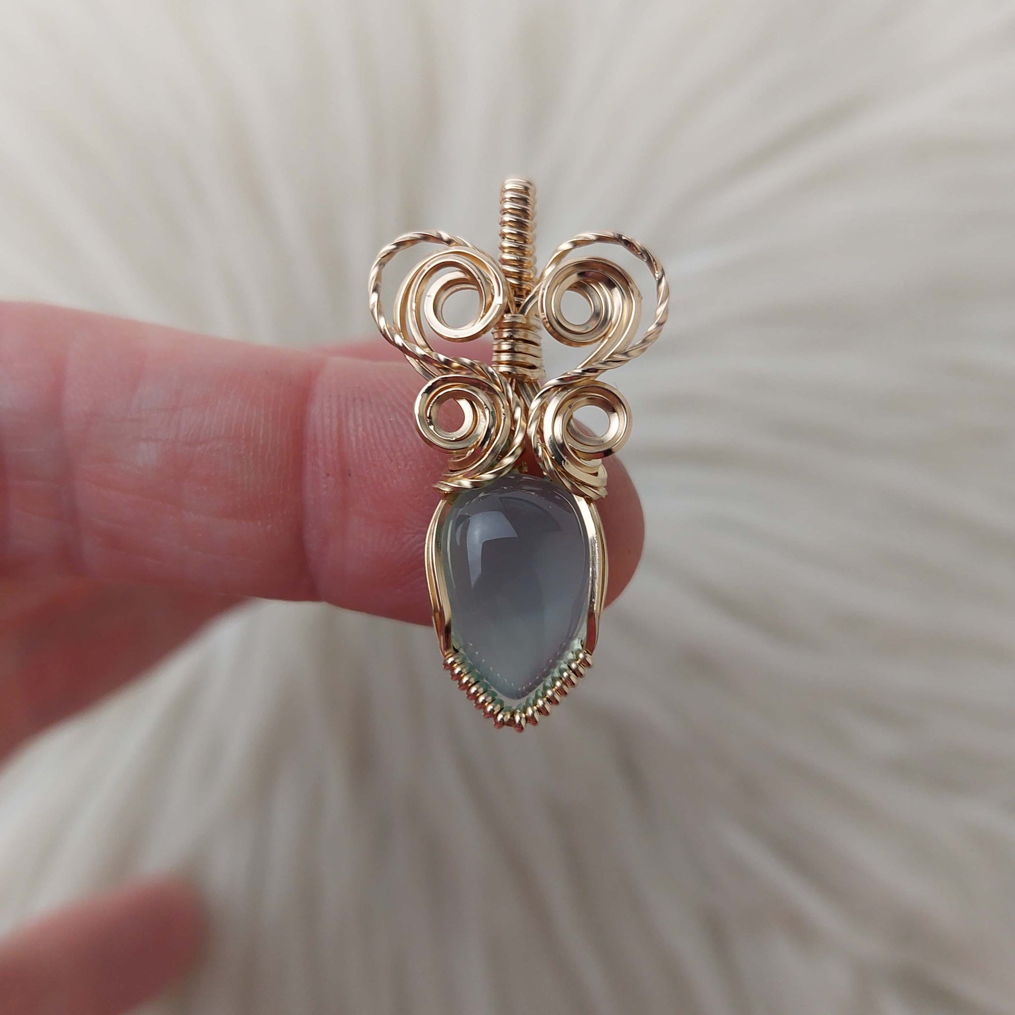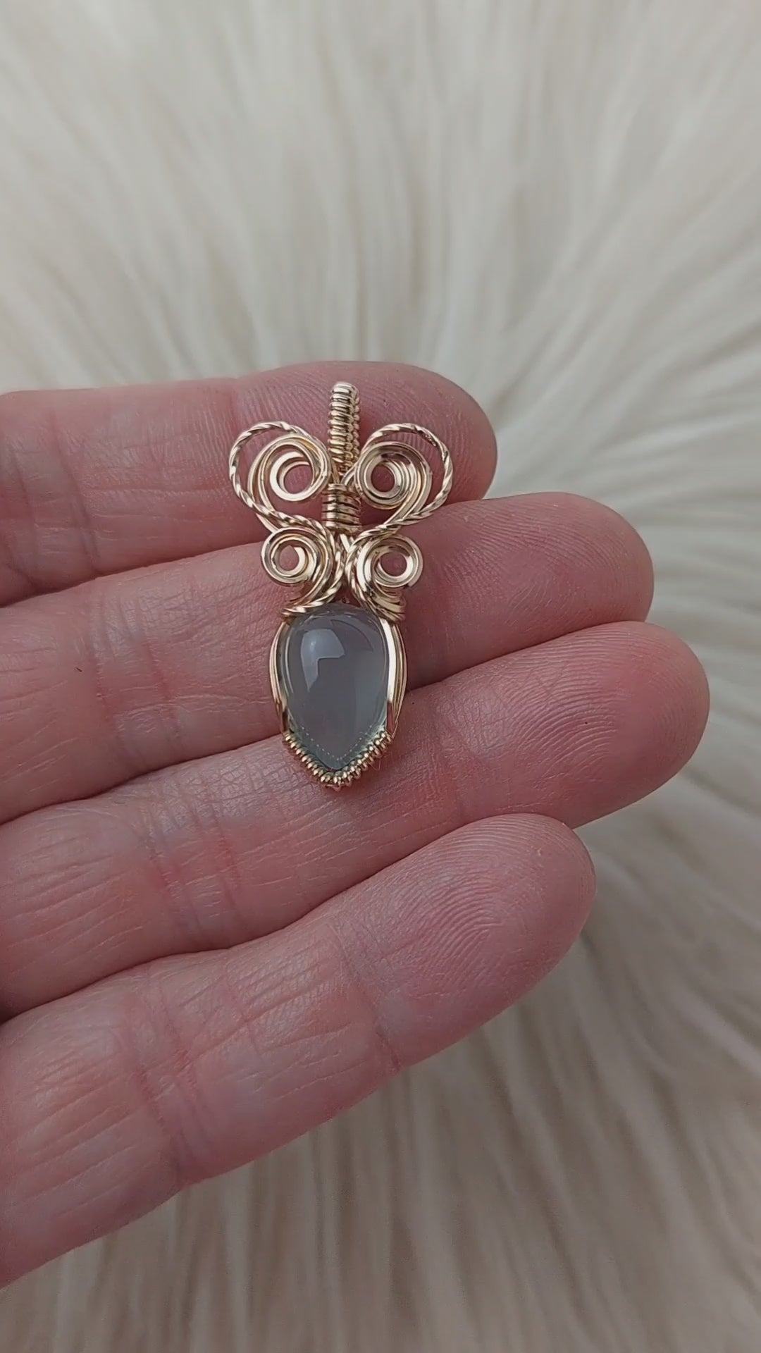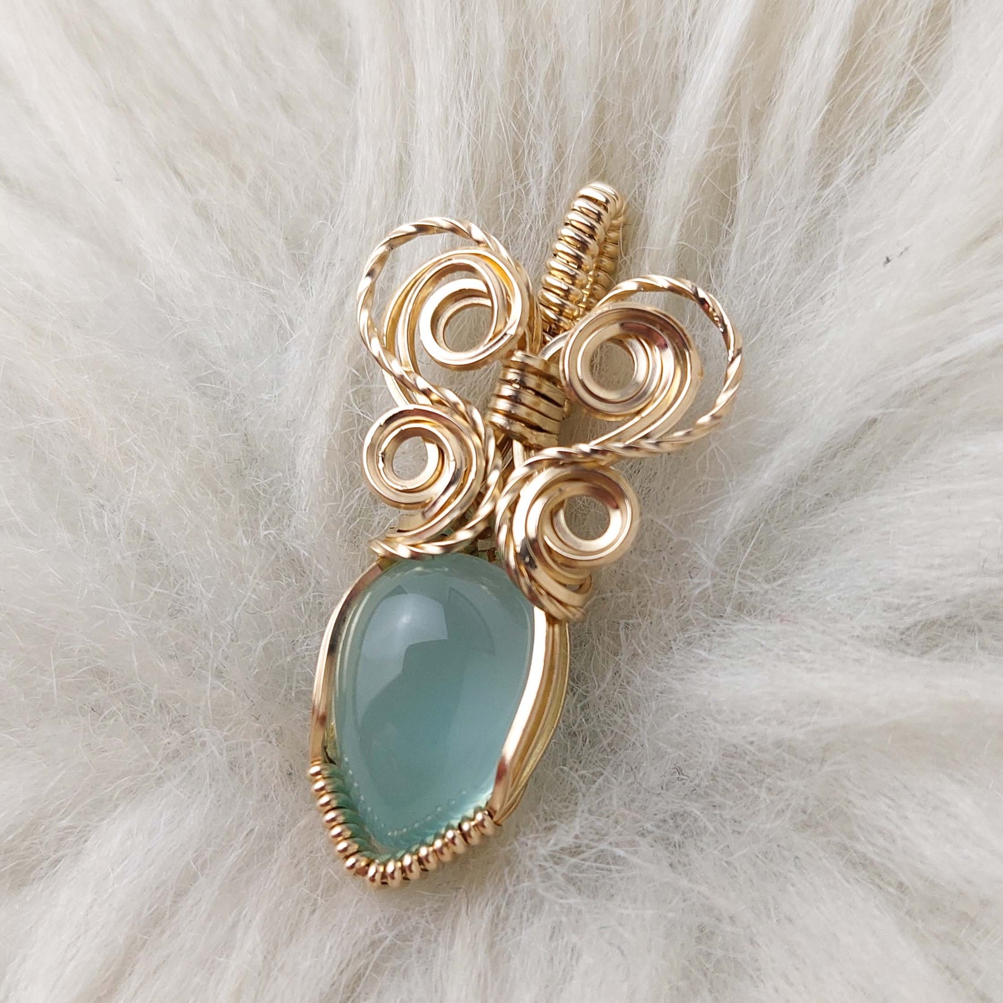 This pendant turned out really beautiful. The stone is a very pretty Aqua Chalcedony. It's set in high quality 14k Goldfill wire. It's only been polished.