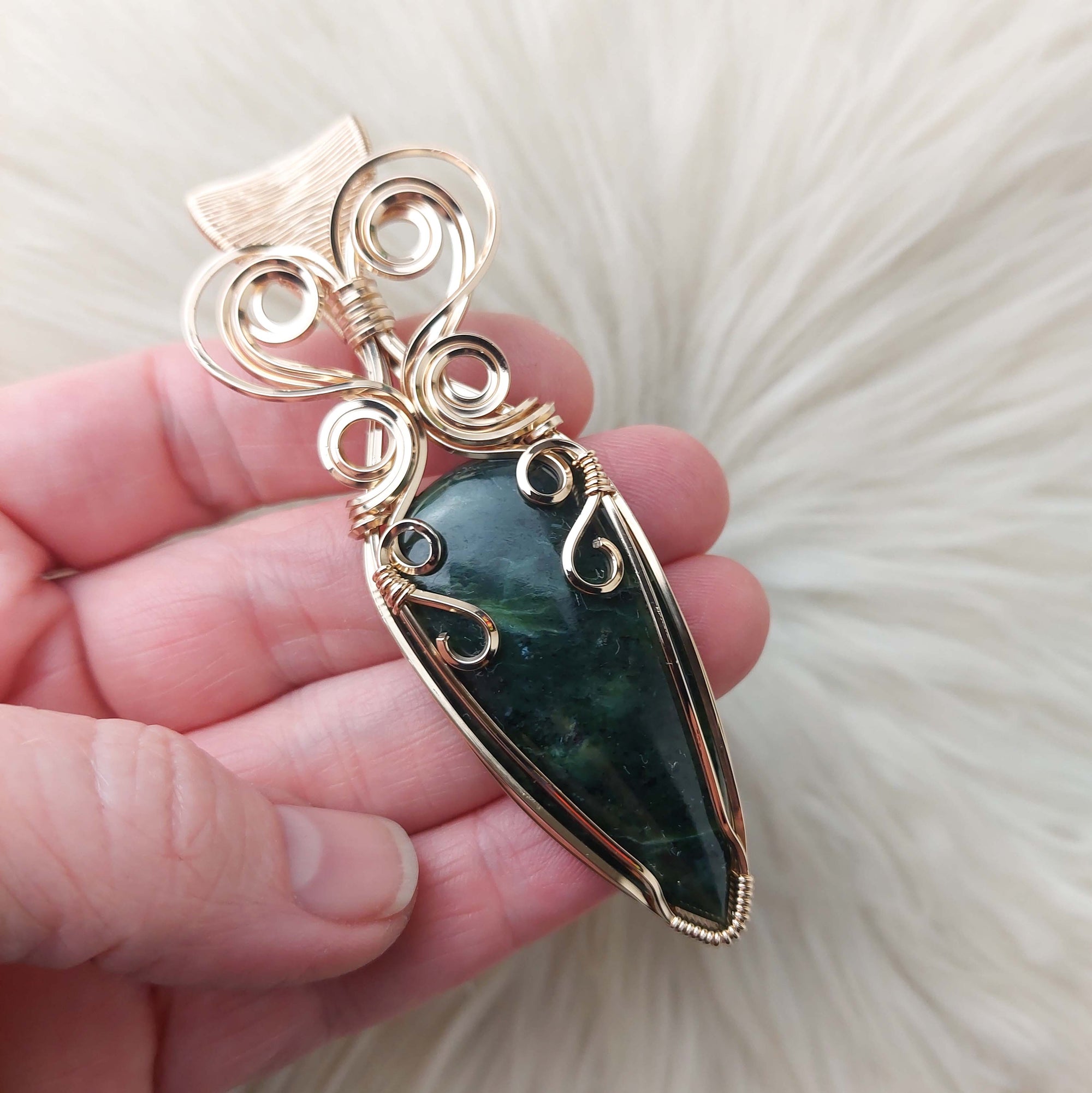 This pendant is absolutely beautiful. The stone is an incredible artisan cut Nephrite Jade. It's an absolutely stunning hand cut stone. The stone was cut by my husband Aaron Mills. It is set in 14k gold fill wire.