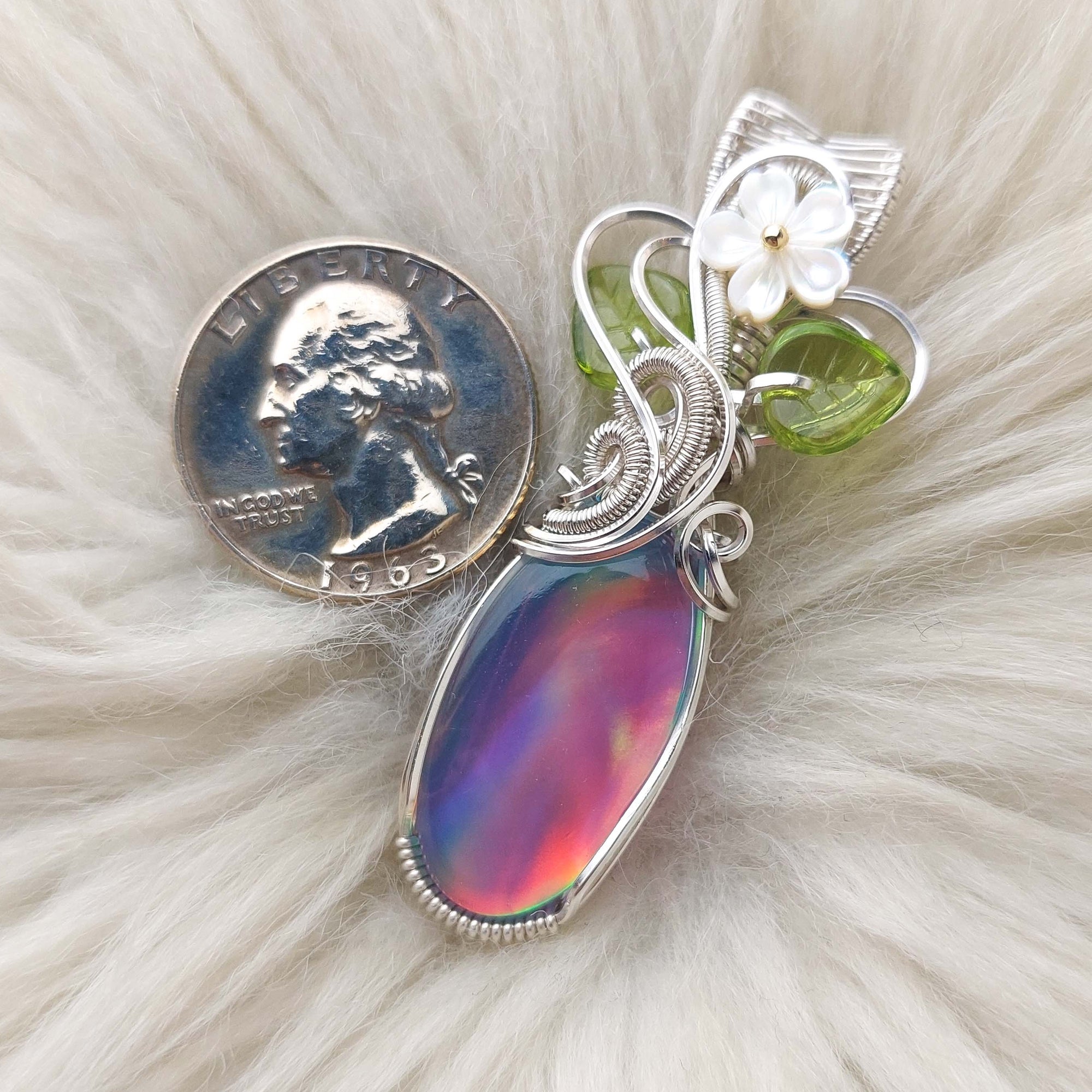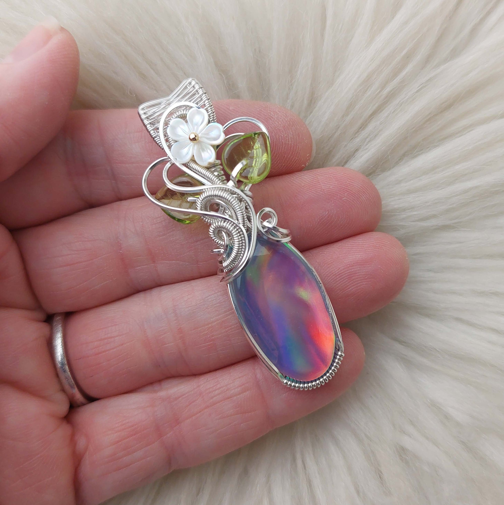 This pendant is absolutely stunning. The stone is a very pretty Aurora Opal. The leaves are glass. The beads are Sterling Silver. The flower is shell It's set in Solid Sterling Silver. It's been oxidized and polished for an antiqued look.