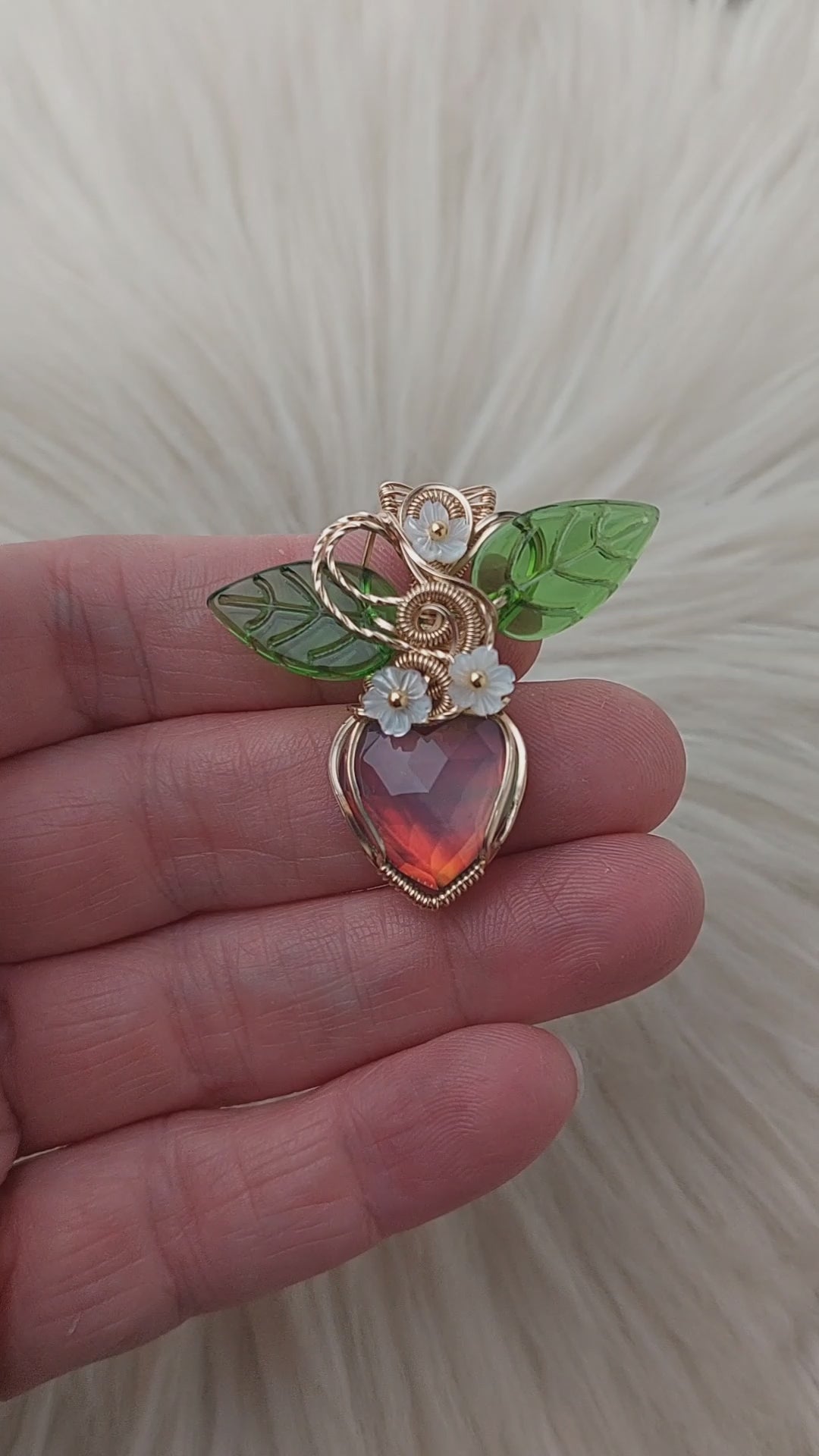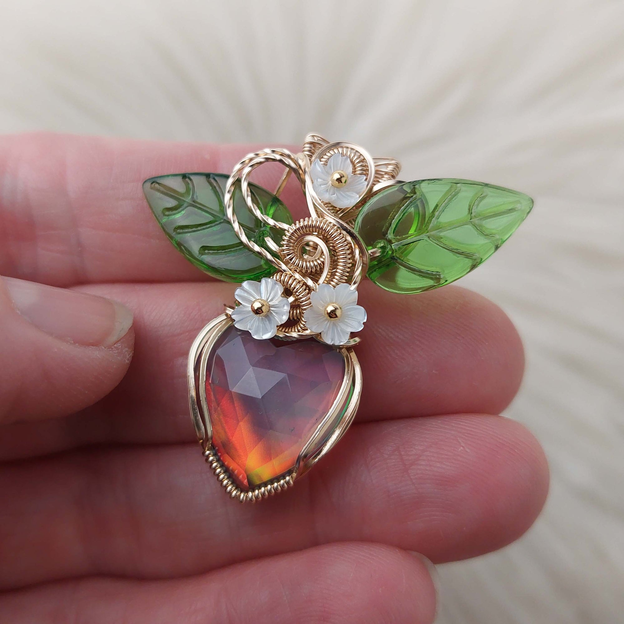 This pendant is absolutely stunning. The stone is an Aurora Opal Doublet. It's set in 14k gold filled wire. The leaves are glass. The flowers are mother of pearl and the pins are brass.