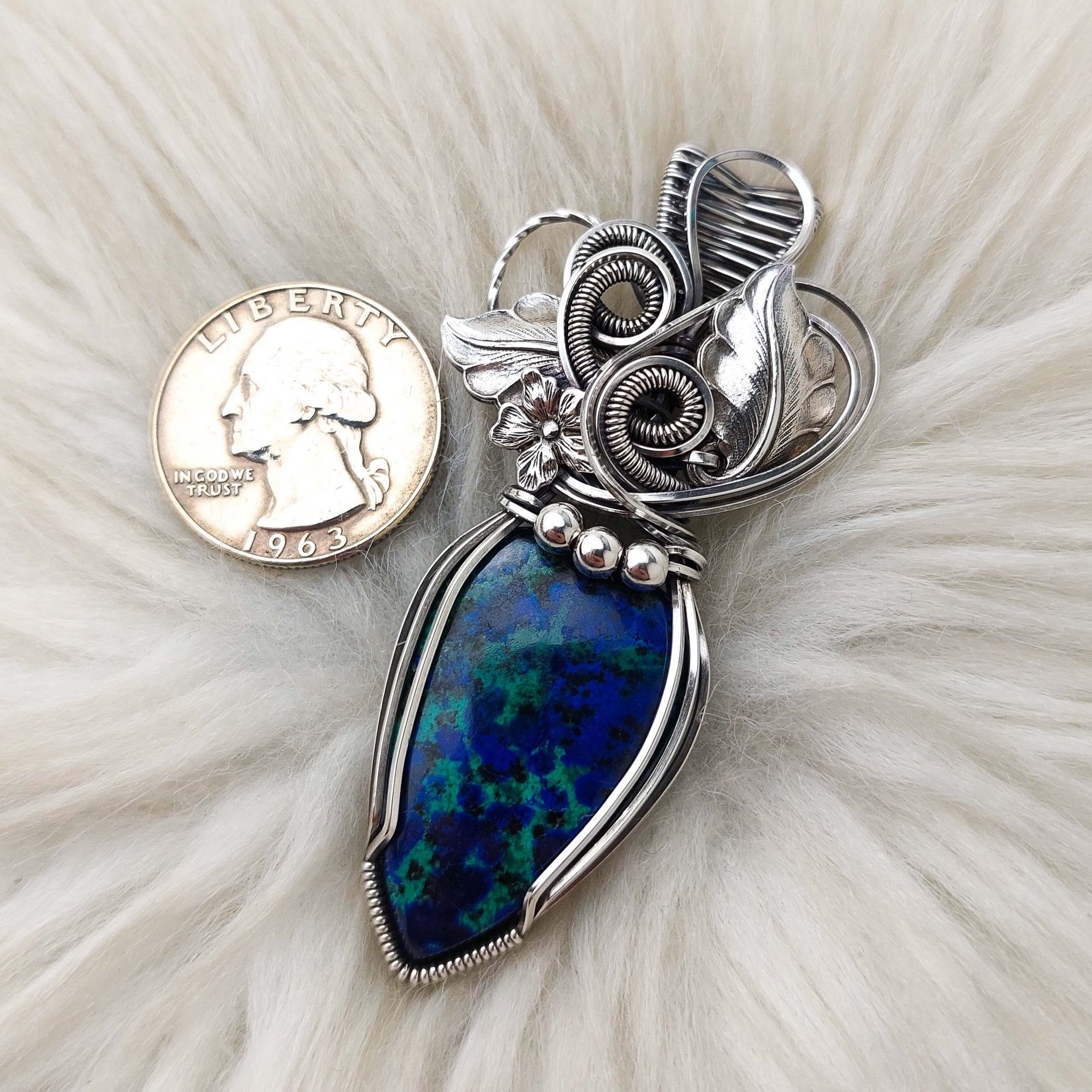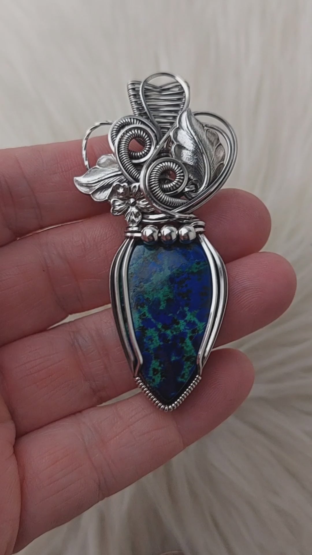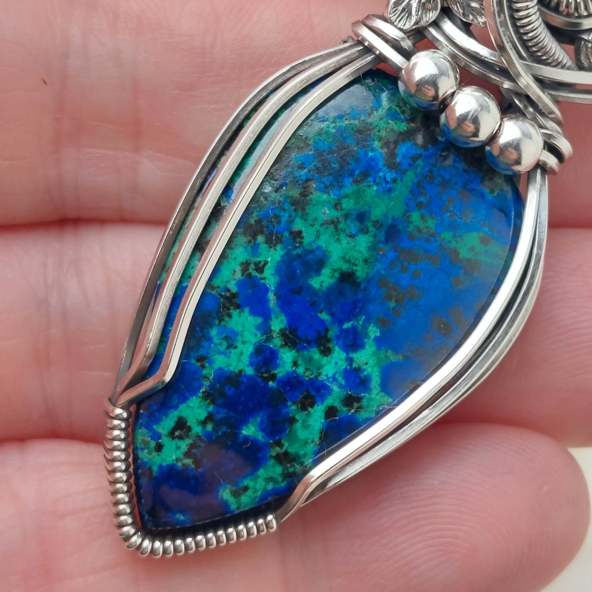 This is a very beautiful pendant. The stone is a stunning Azurite with Malachite. The leaves and flower are vintage silver-plated brass. The beads are stetling silver. It's set in Solid Sterling Silver wire. This pendant has been oxidized and polished for an antiqued look.