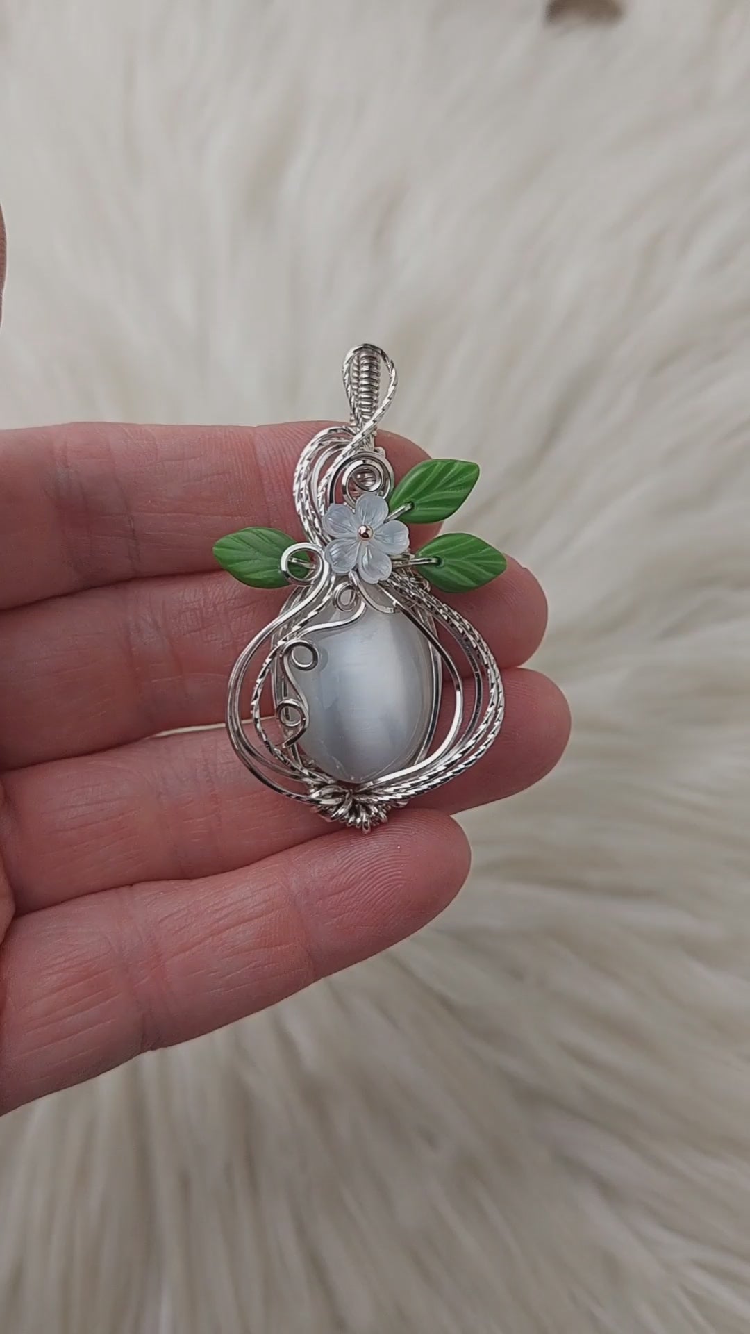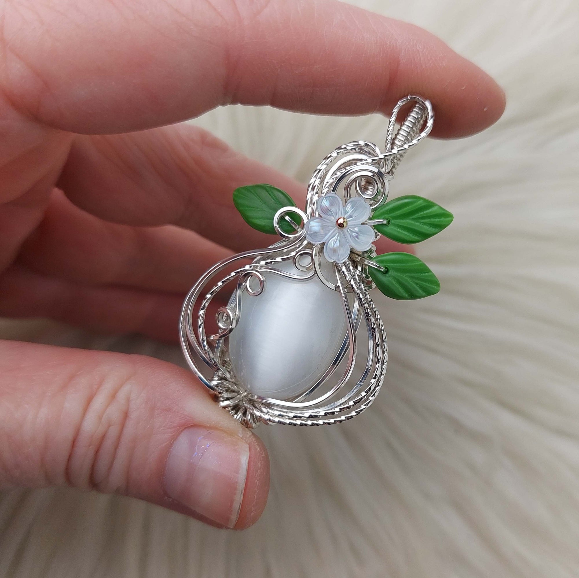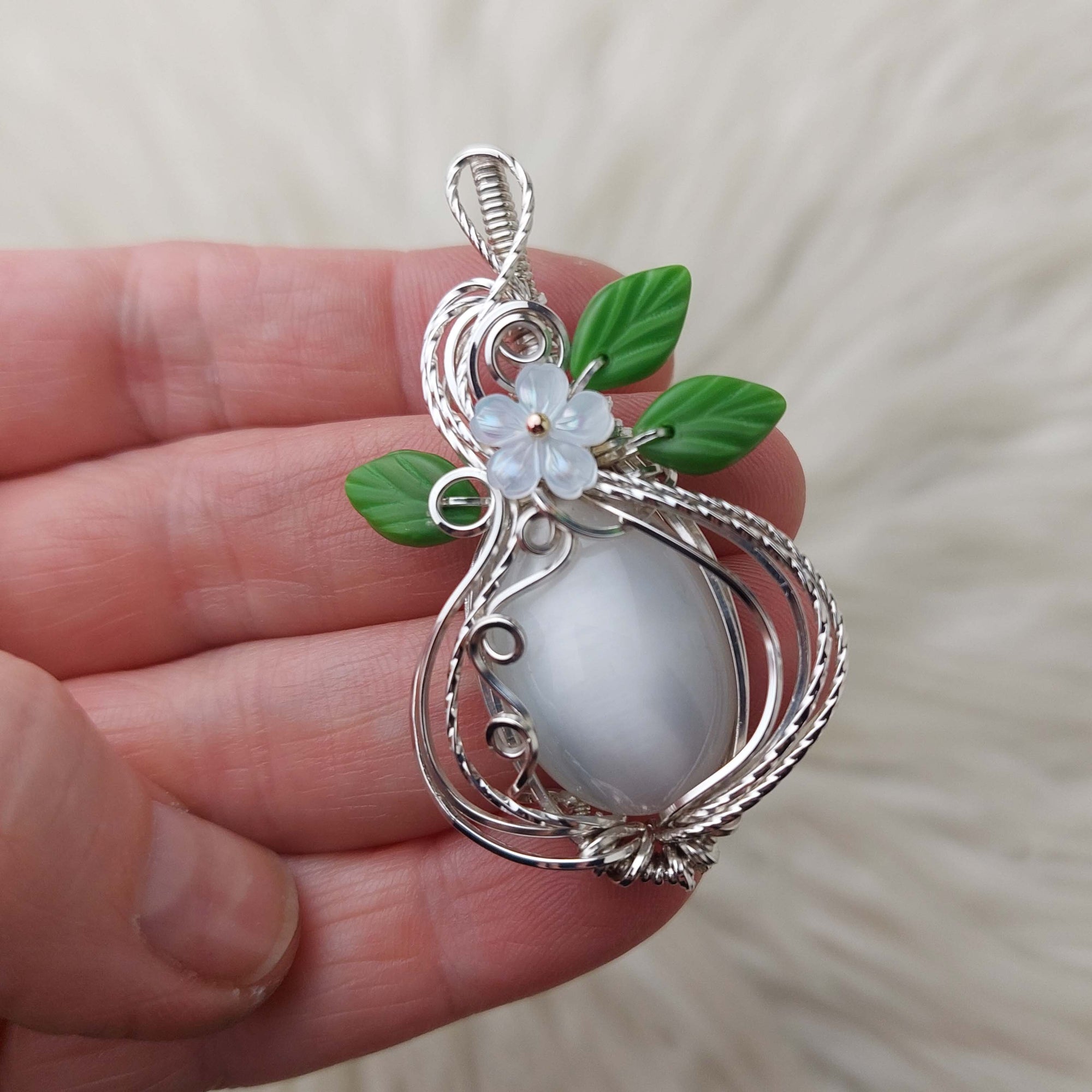 Beautiful pendant! I love the wire wrap contrasting colors and the flash quality of the stone. Can't wait to wear it when I find a matching necklace strong enough to hold up the weight of it.