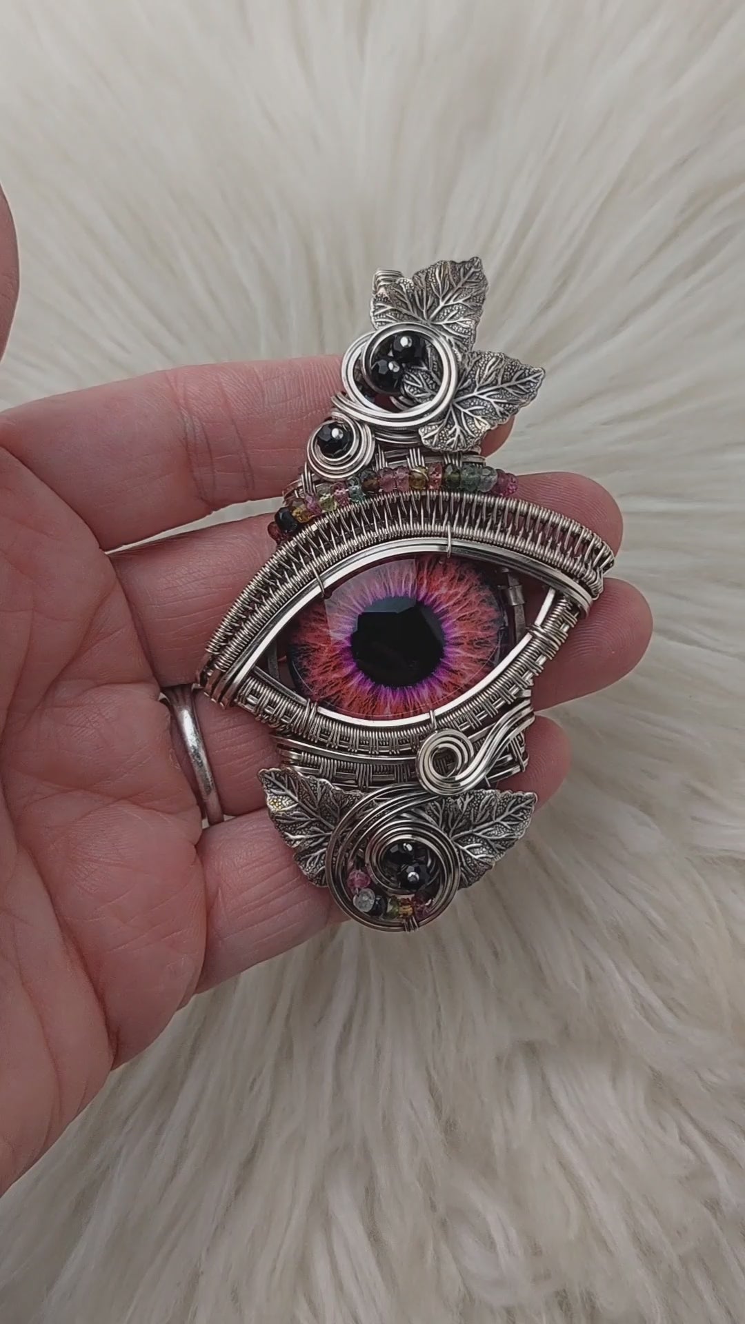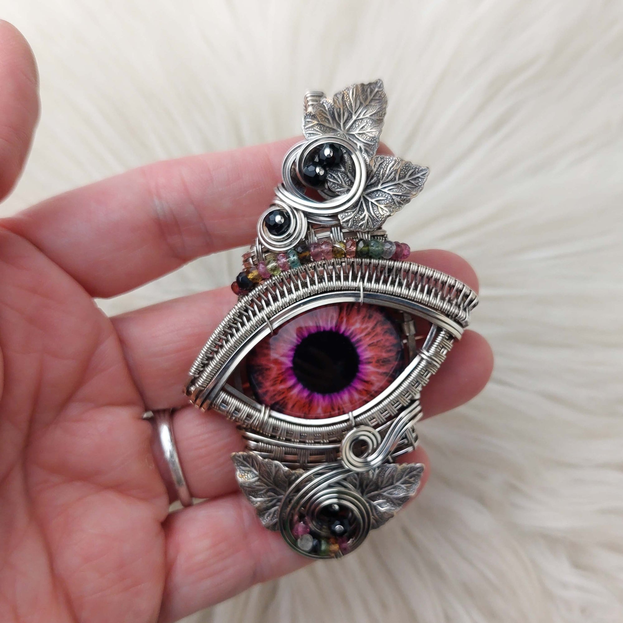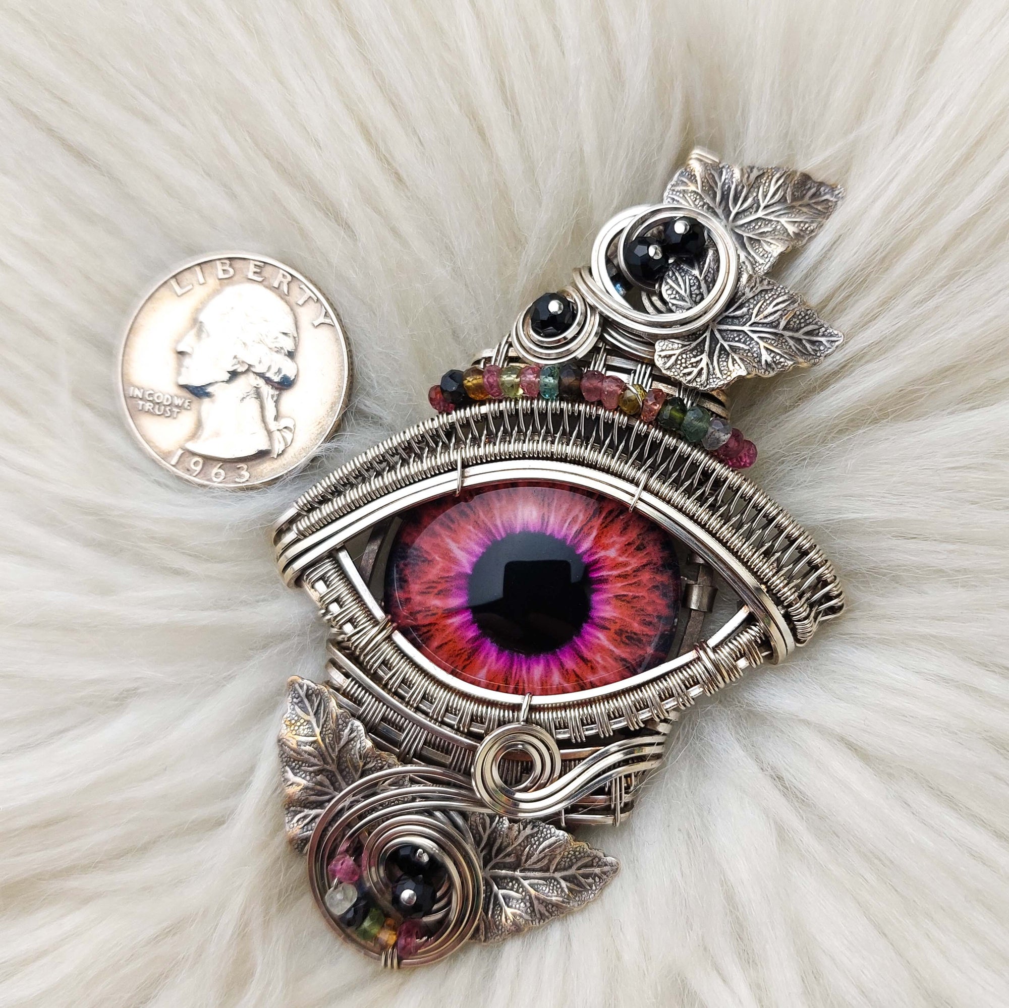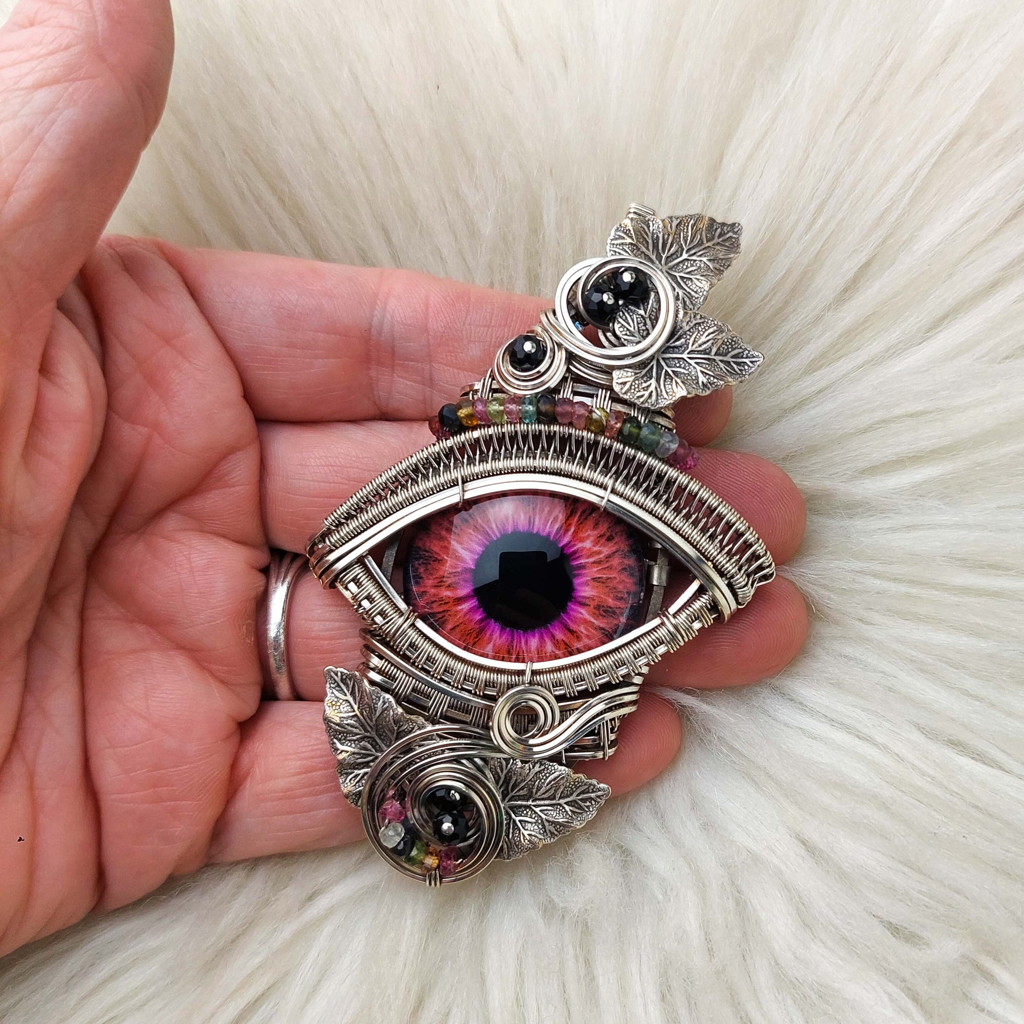 This is a very beautiful dragons eye pendant. The eye is made of glass. It's set in Solid Sterling Silver wire. The beads are Tourmaline. The leaves are silver-plated brass. This pendant has been oxidized and polished for an antiqued look.