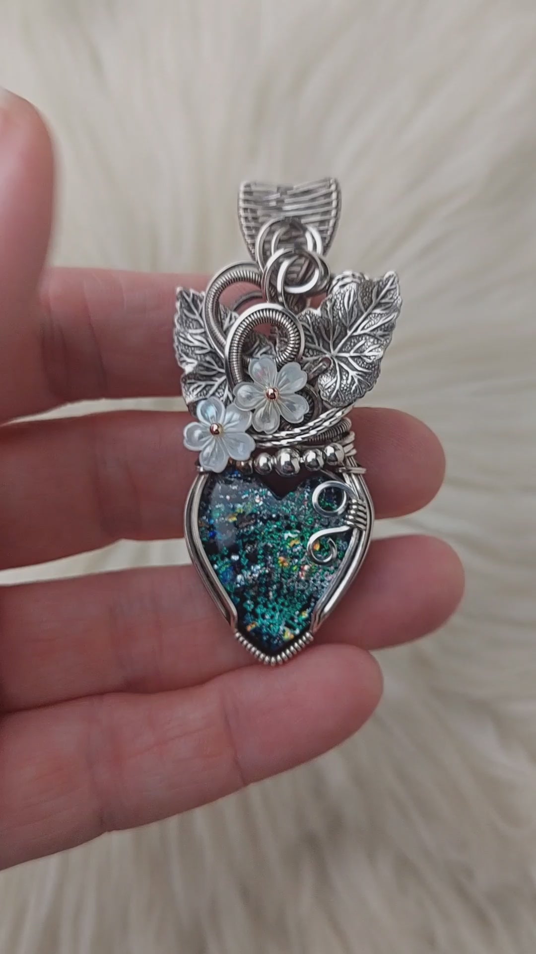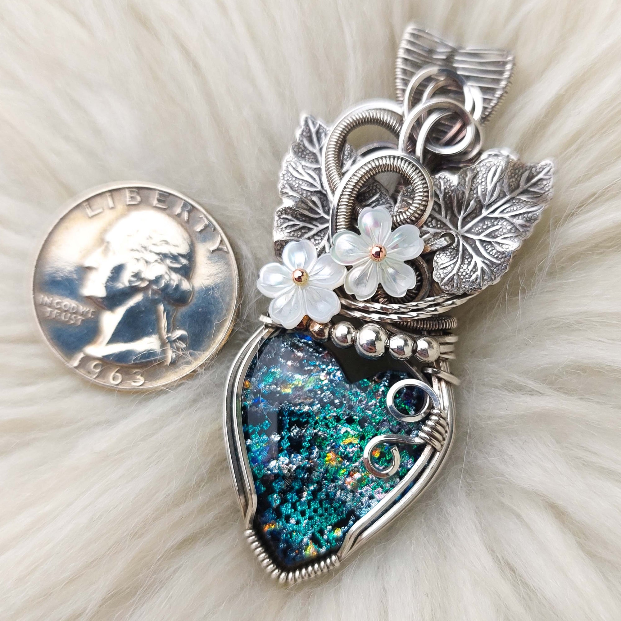 This pendant is absolutely stunning. The stone is a beautiful artisan cut Dichroic Glass. It was cut by Rock Boss Lapidary. The leaves are silver-plated brass. The flowers are mother of pearl. It is set in Sterling Silver.