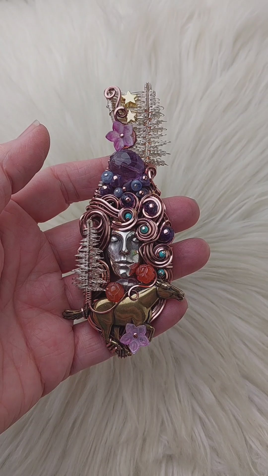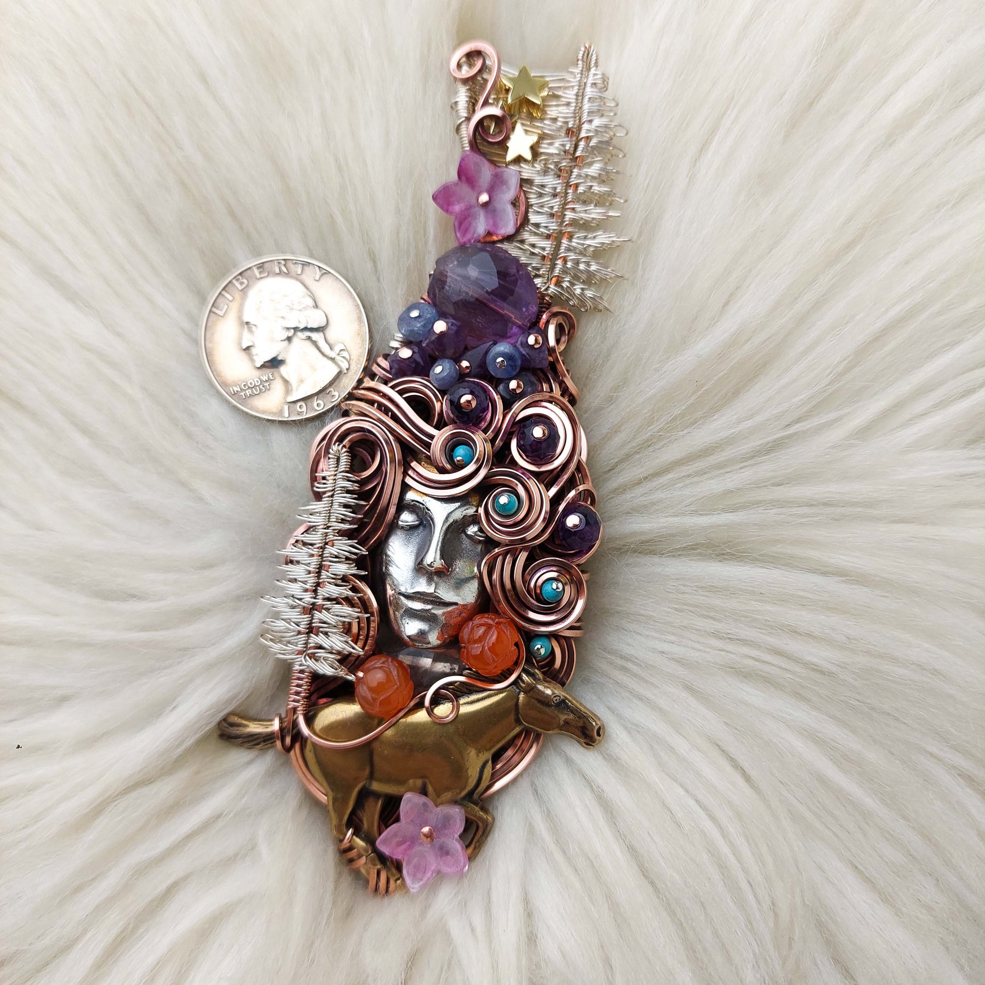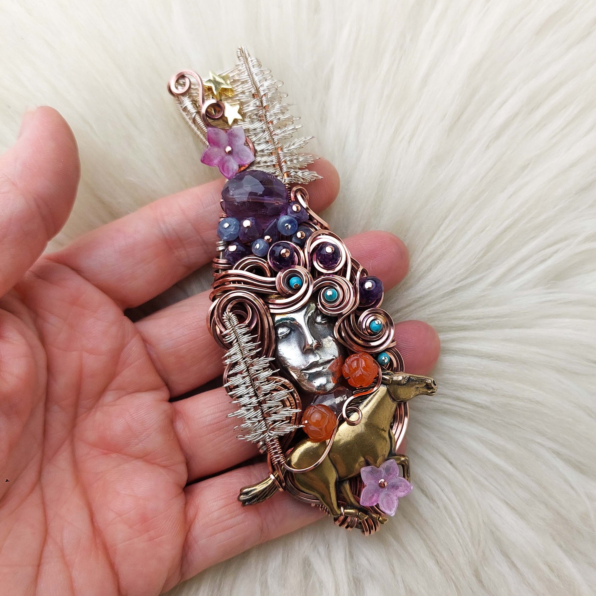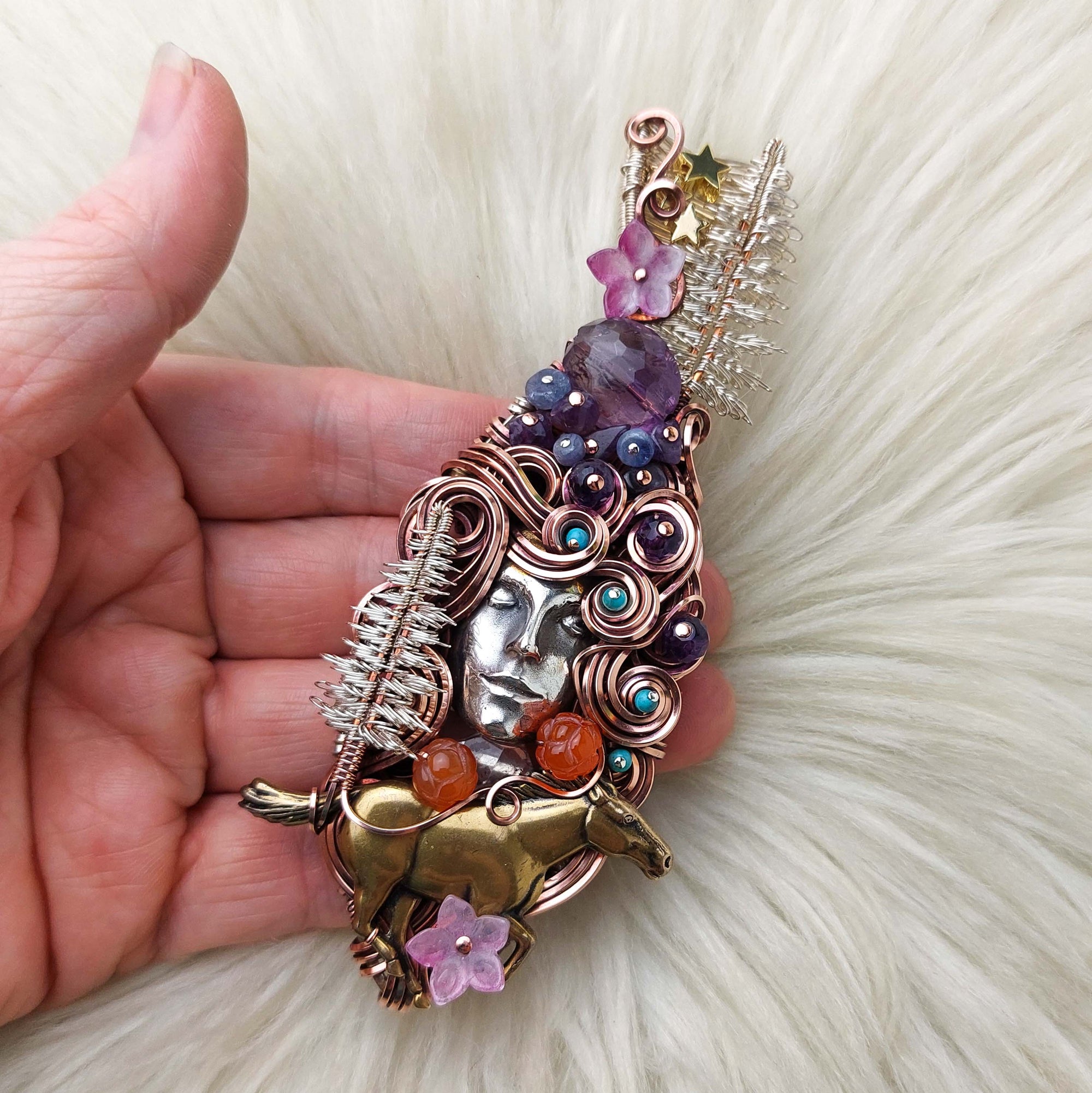 This pendant is absolutely beautiful, very unique, and very intricate. The goddess face is made from Sterling Silver and it was custom cast And designed as a collaboration by Andrew of Valk9 Designs. It is set in over an ounce of Sterling Silver with copper accents. The horse is brass. The beads are Amethyst, Tanzanite, Kingman Turquoise, and 14k gold filled. The flowers are glass and Carnelian Agate. The trees were made by Jeni Haworth of Wild Raven Designs. She's the original designer of the pine tree design. It's been oxidized and polished for an antiqued look.