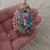 This pendant turned out awesome. The stone is a very flashy Labradorite. It's set in Copper. The fairy is copper. It's been oxidized and polished for an antiqued look.