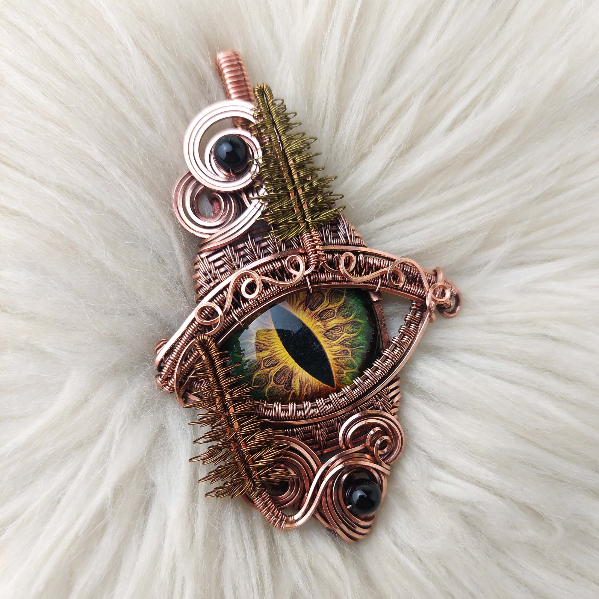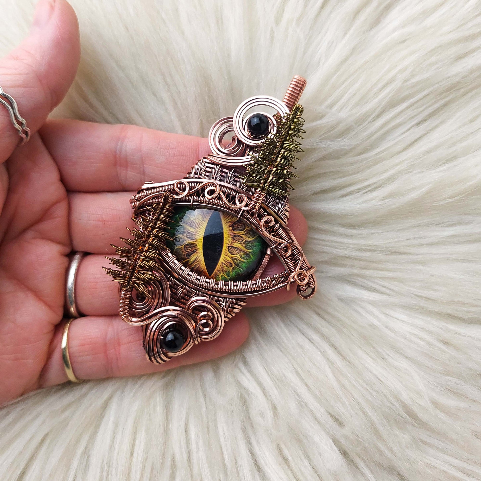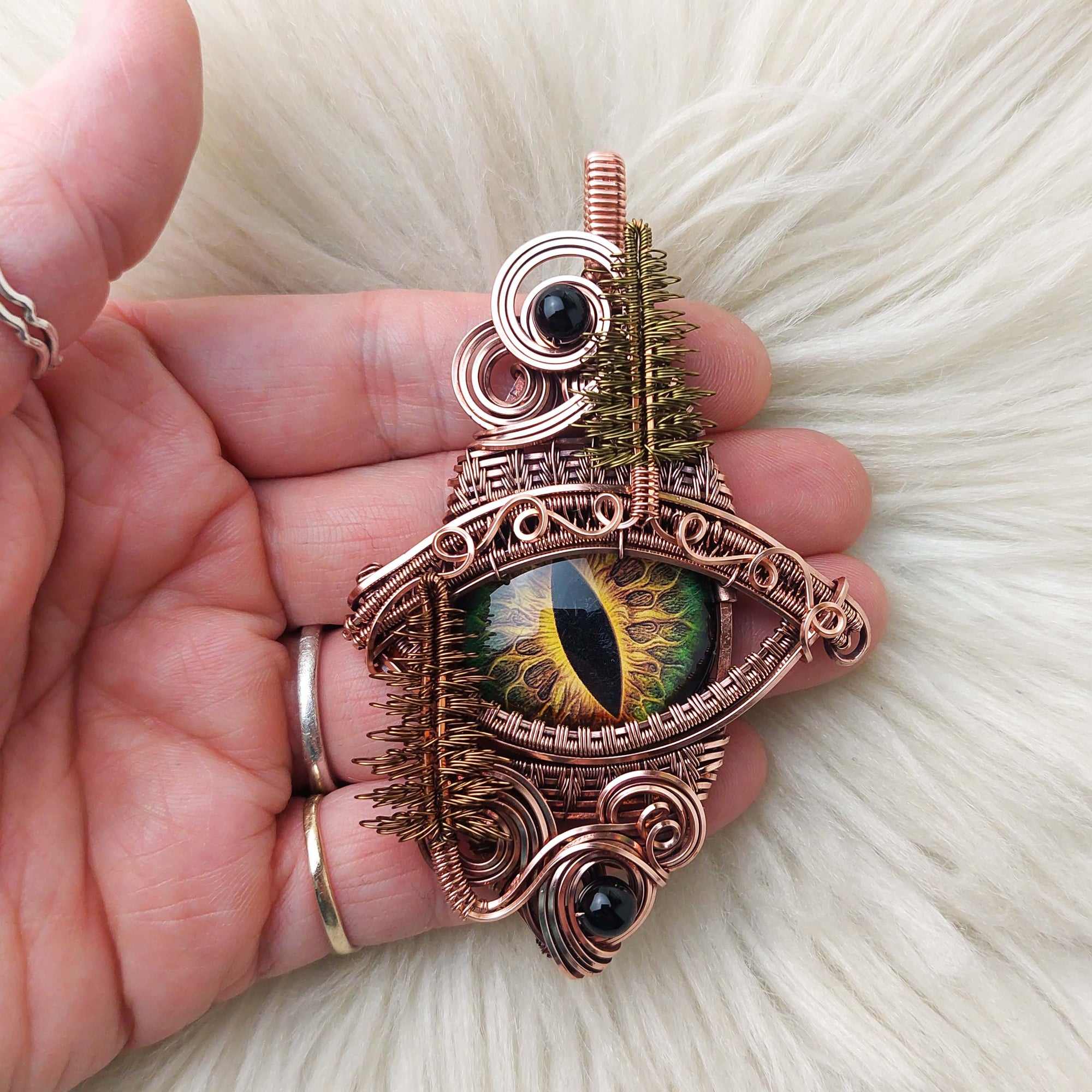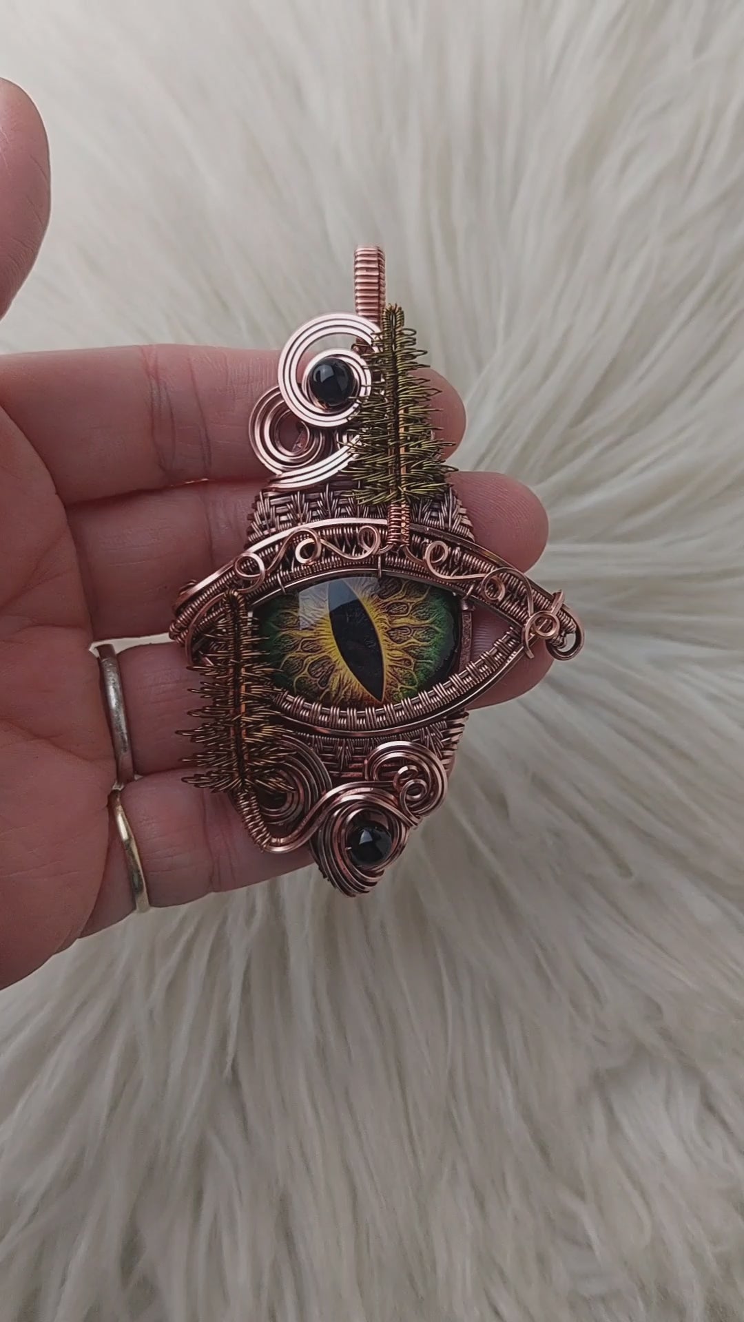 This is a very beautiful eye pendant. The eye is made of glass. It's set in Copper. The beads are Black Onyx. The trees were made by Jennifer Haworth of Wild Raven Designs as a collaboration. This pendant has been oxidized and polished for an antiqued look.