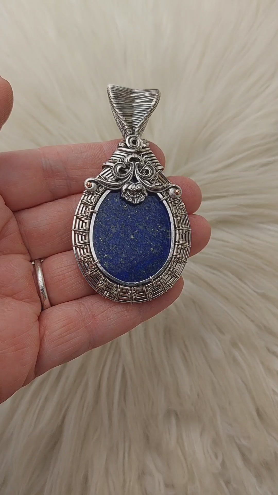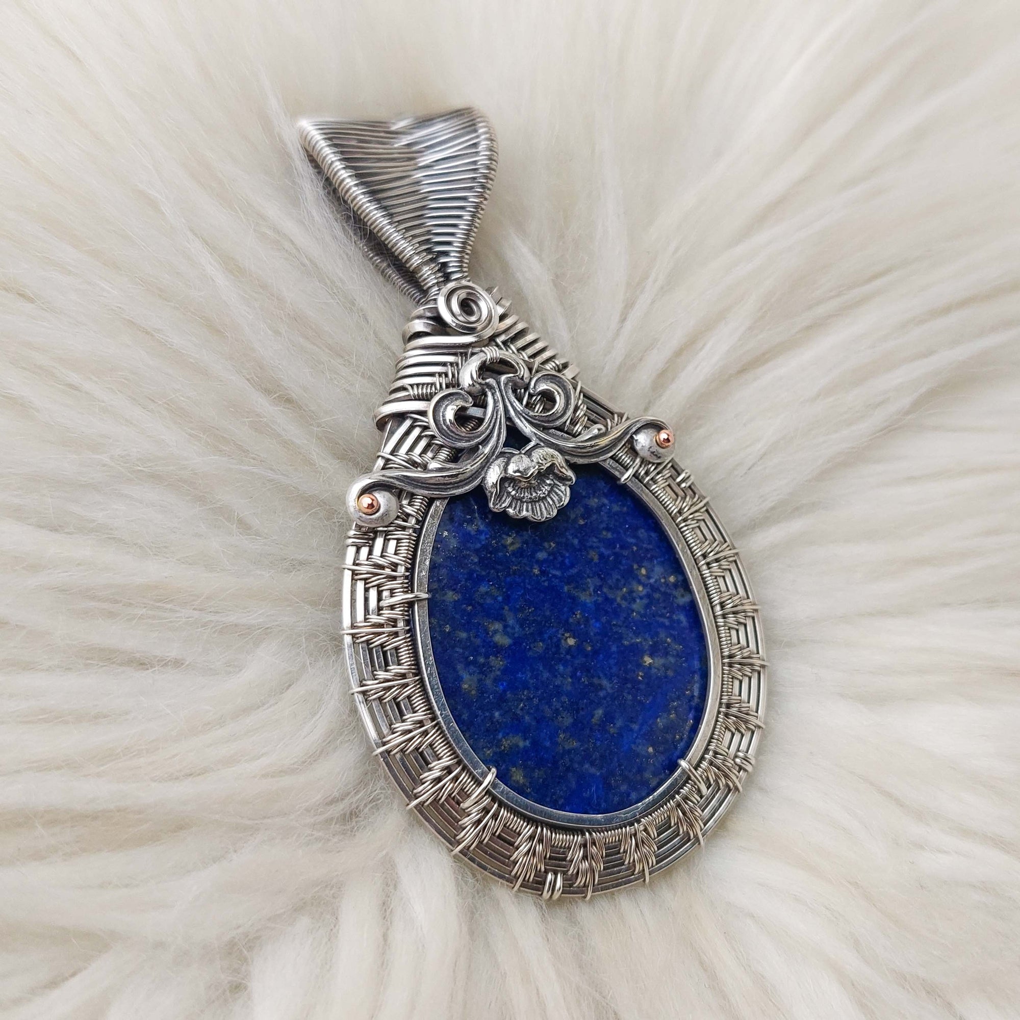 This pendant turned out absolutely awesome. The stone is Lapis. The leaves and flower are silver-plated brass. It is set in sterling silver.