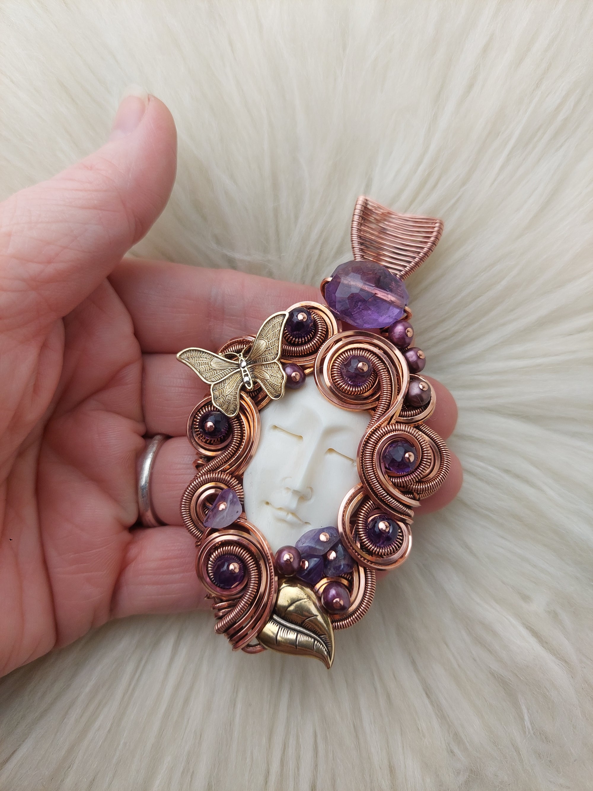 This pendant is absolutely beautiful, very unique, and very intricate. The goddess face is made from hand carved Buffalo bone, and the accent stone is a faceted old stock Amethyst. The butterfly and leaf are brass. The beads are Amethyst and Freshwater Pearl. It's set in Copper. It's been oxidized and polished for an antiqued look.