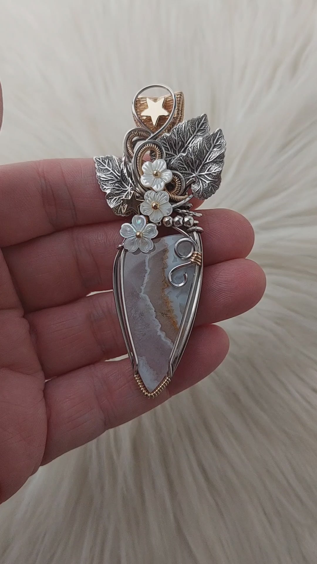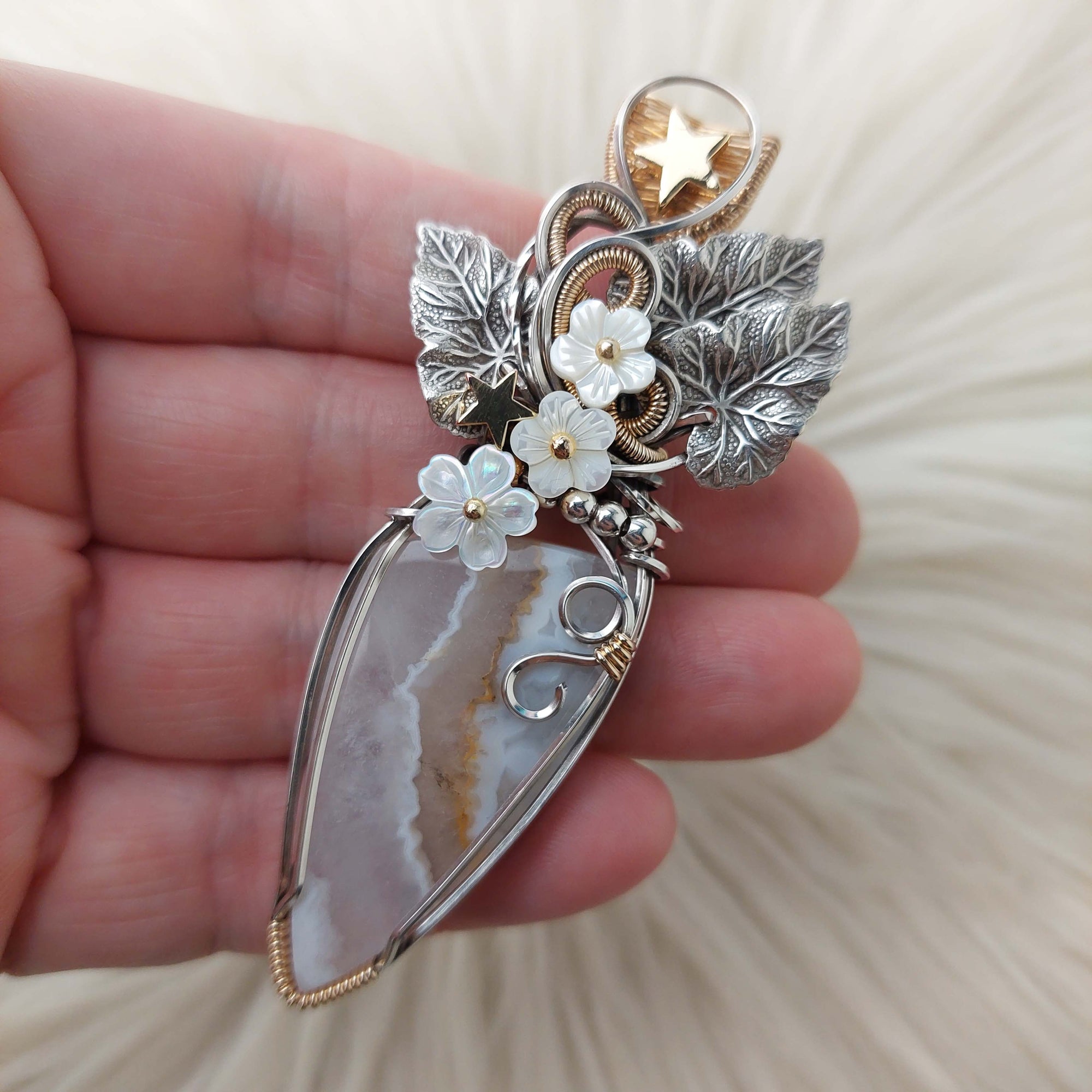This pendant is absolutely stunning and quite large. The stone is a stunning Lace Agate. The beads are 14k Goldfilled and the leaves are silver-plated brass. The flowers are mother of pearl. It's set in solid sterling silver and 14k Goldfilled wire. This pendant has only been polished