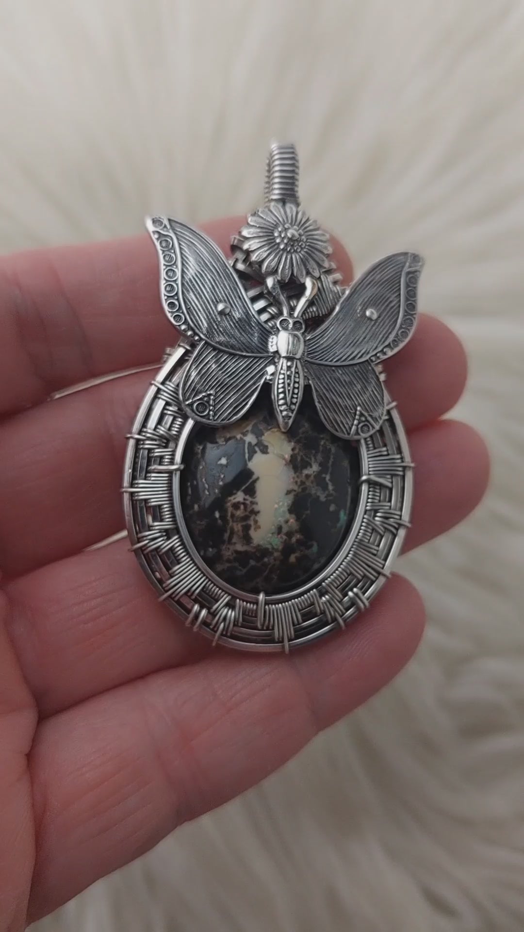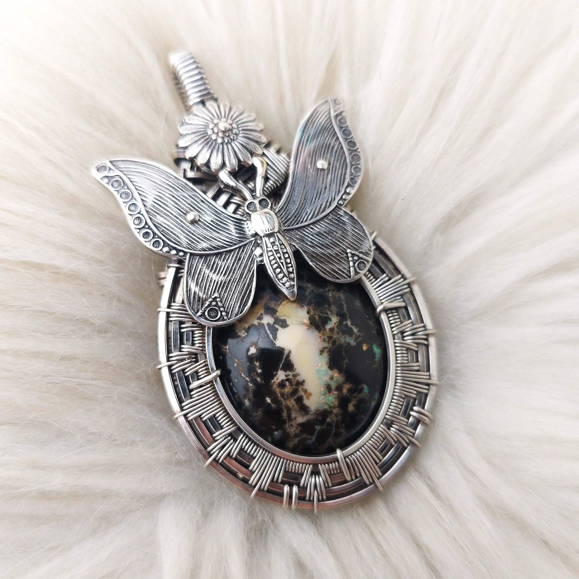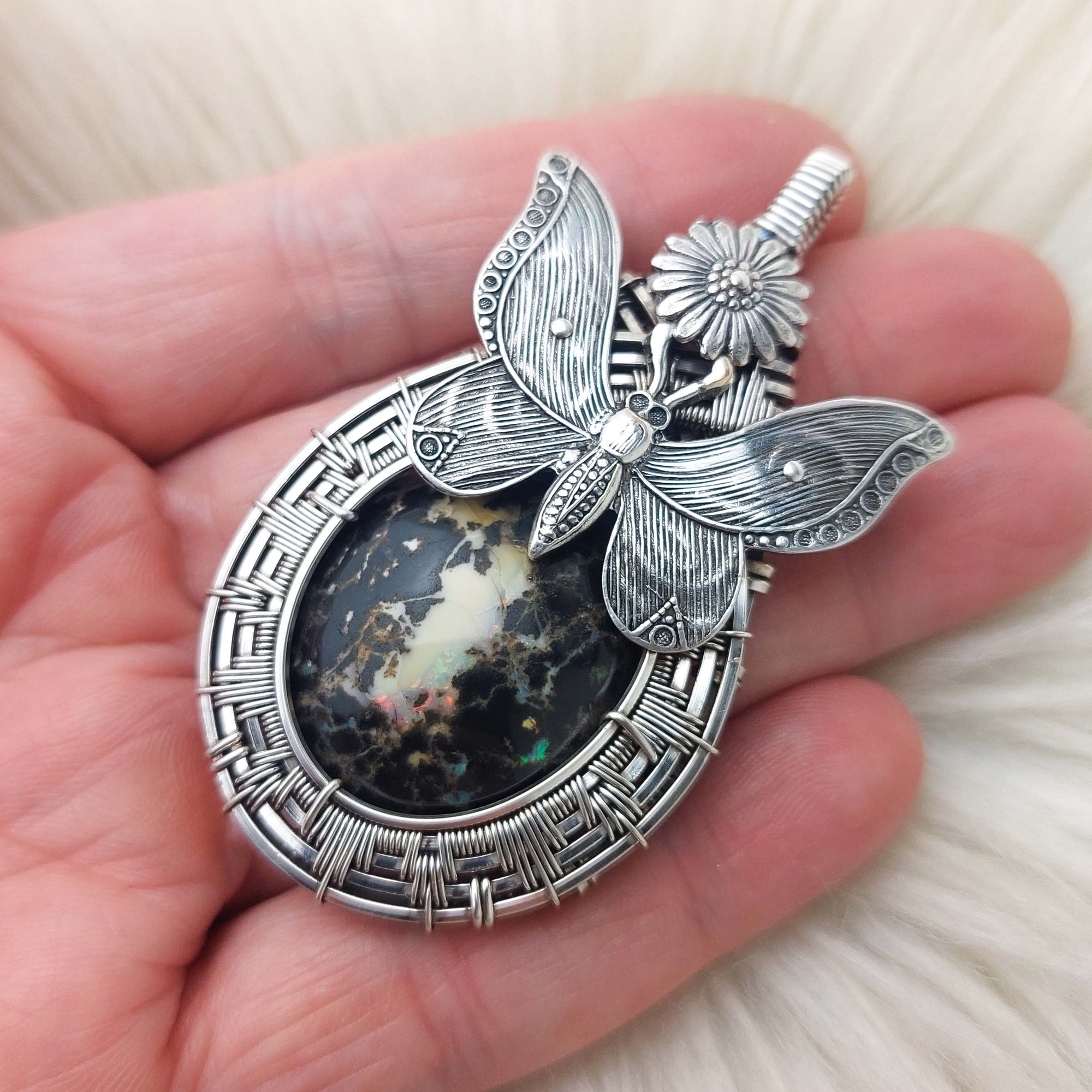 Beautiful pendant! I love the wire wrap contrasting colors and the flash quality of the stone. Can't wait to wear it when I find a matching necklace strong enough to hold up the weight of it.