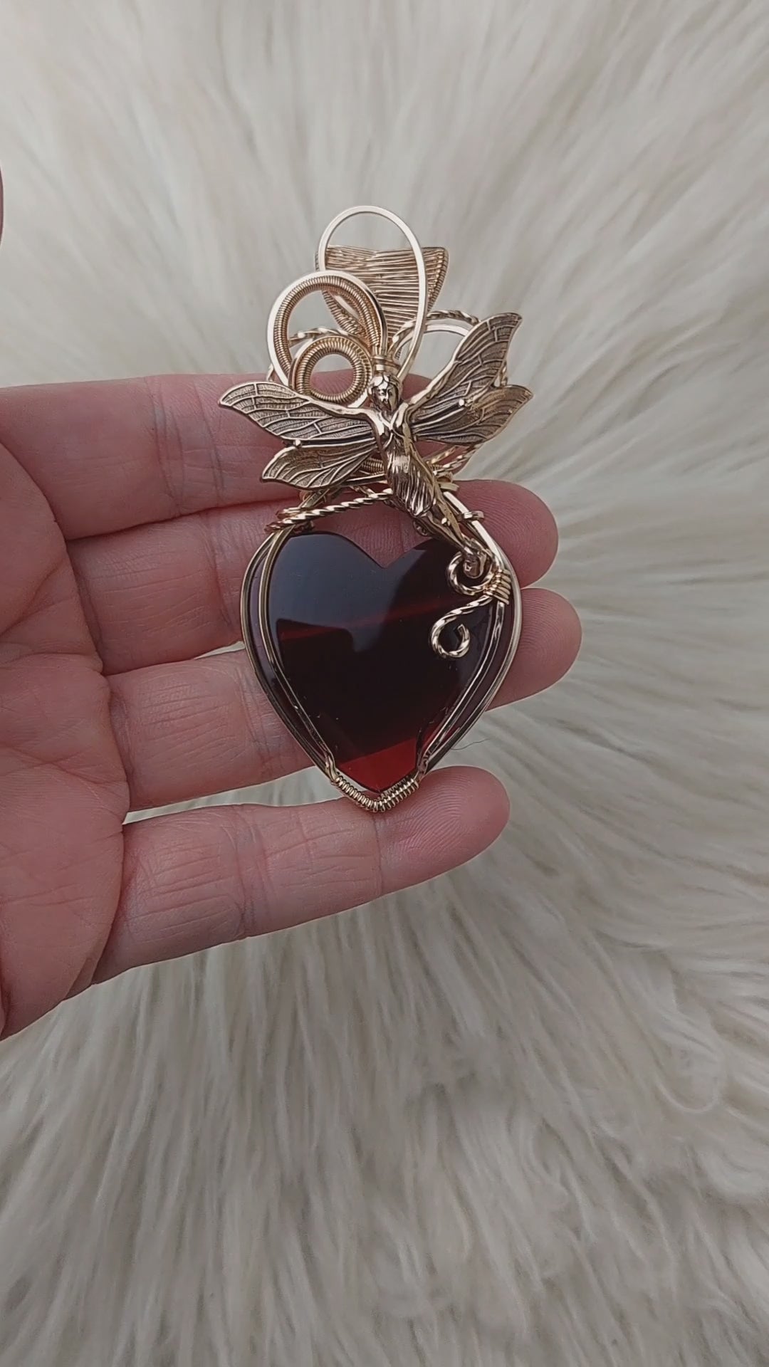 This pendant is absolutely one of a kind and very beautiful. The stone is an absolutely gorgeous piece of vintage red glass. It was designed and cut by Rock Boss Lapidary. The fairy is 14k gold filled. It's set in 18g chunky solid 14k Goldfilled wire. It's only been polished.