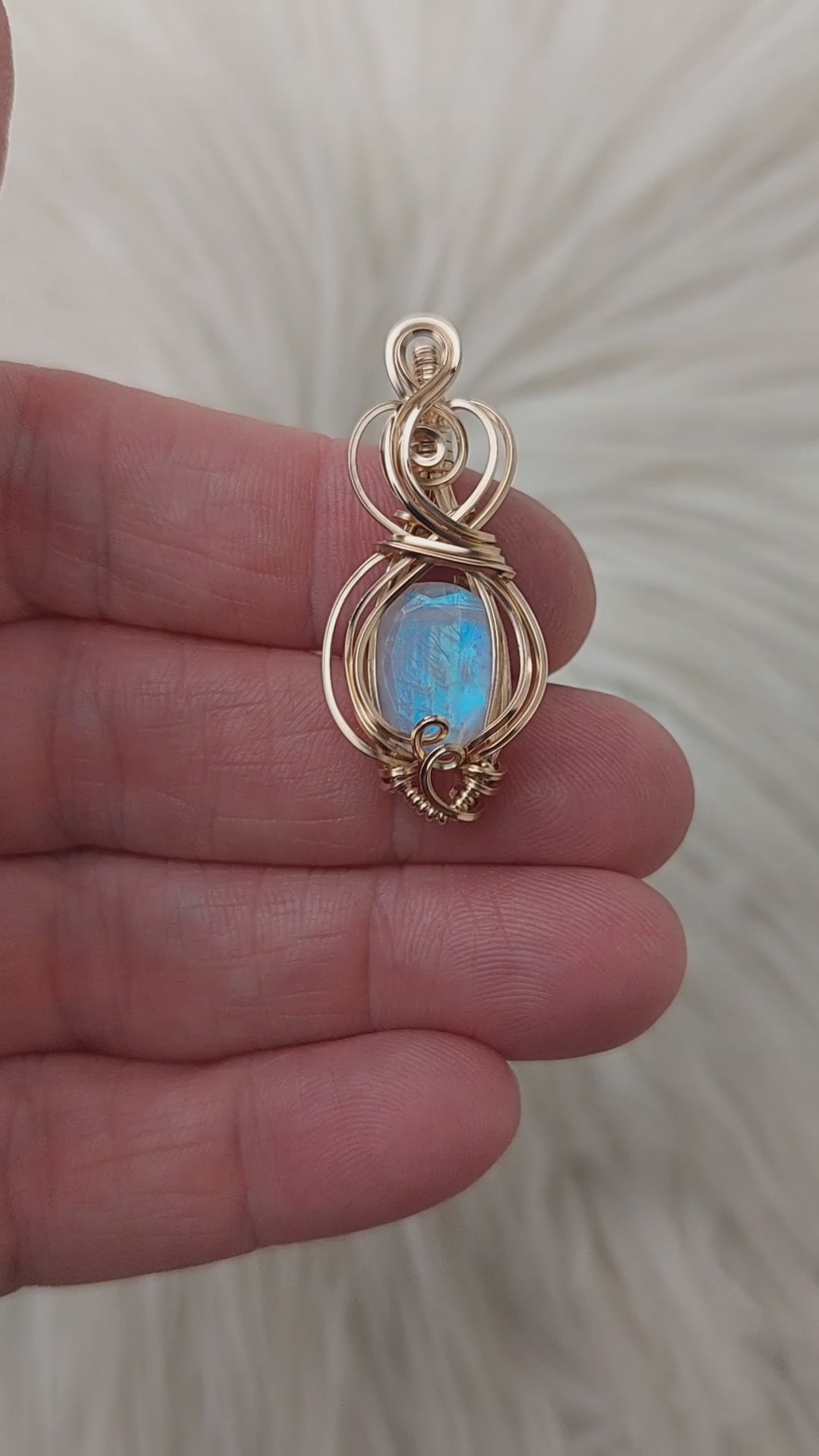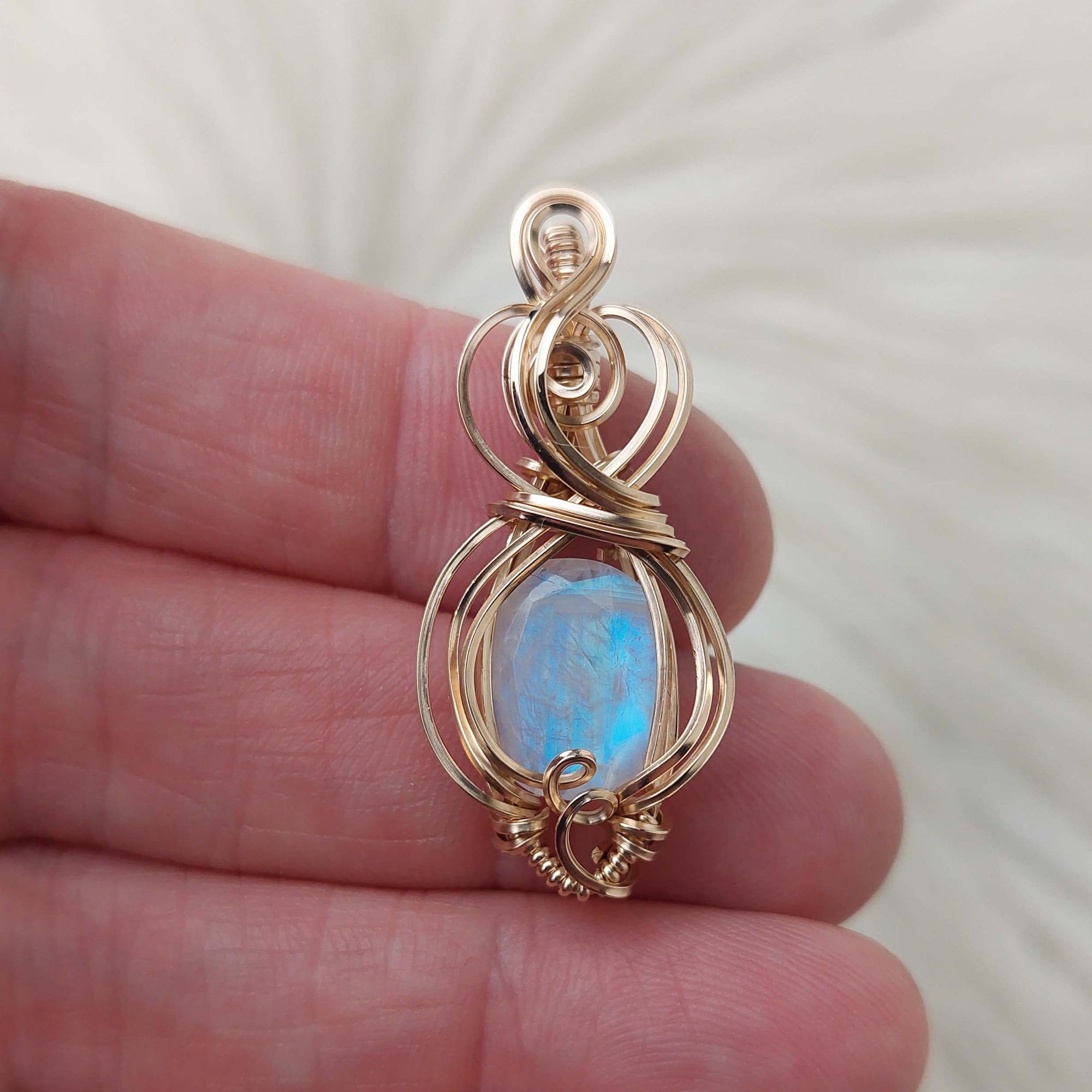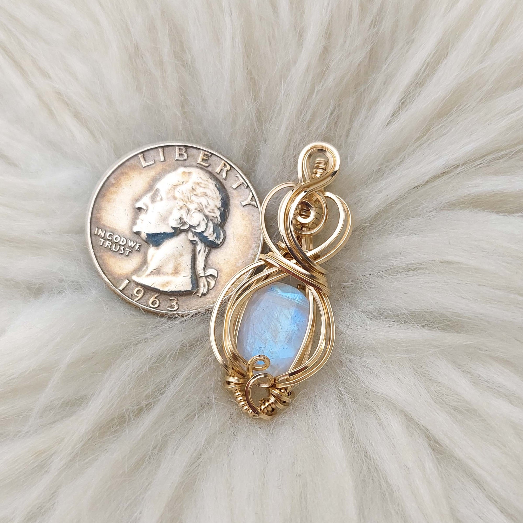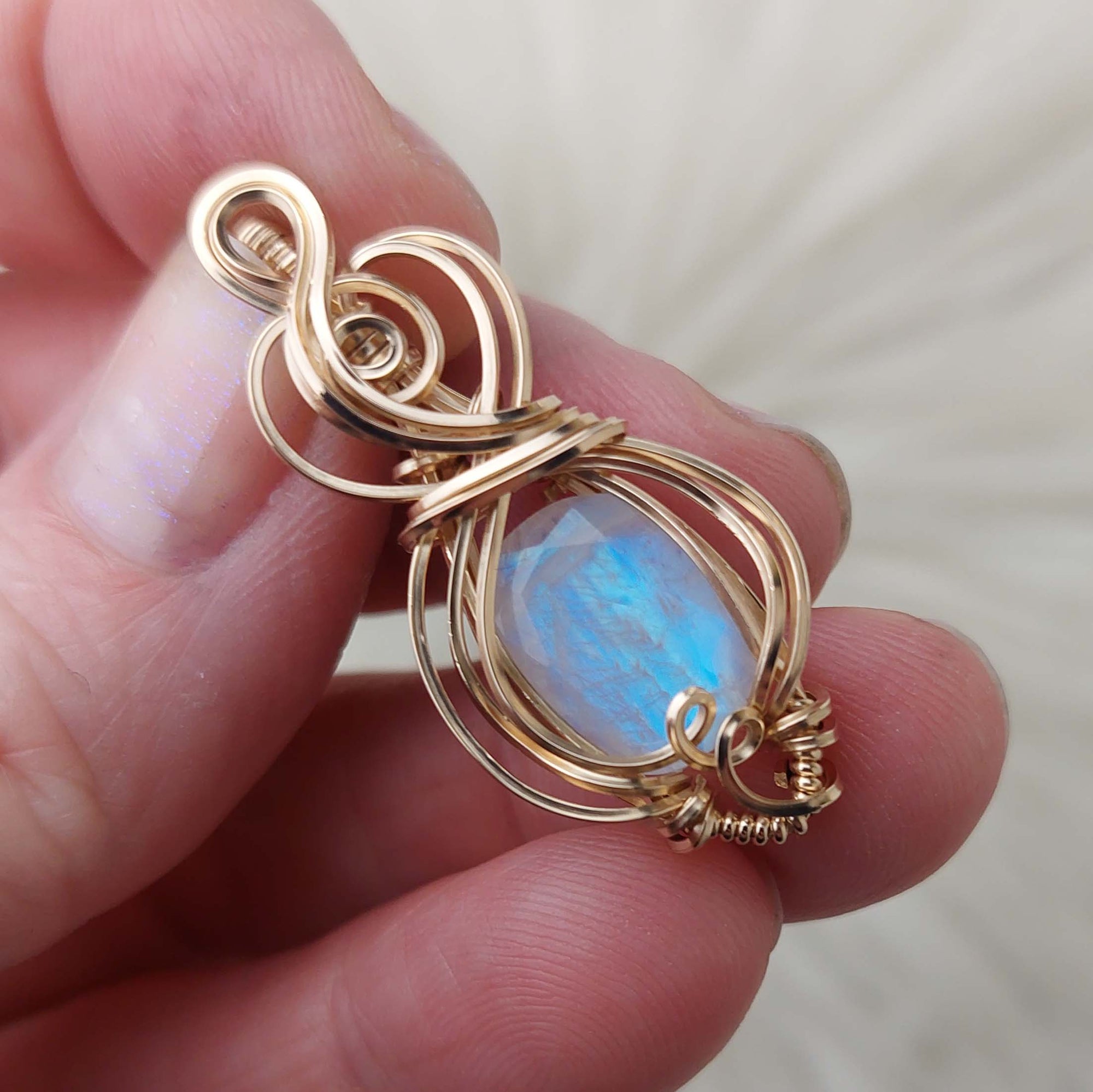 Beautiful pendant! I love the wire wrap contrasting colors and the flash quality of the stone. Can't wait to wear it when I find a matching necklace strong enough to hold up the weight of it.