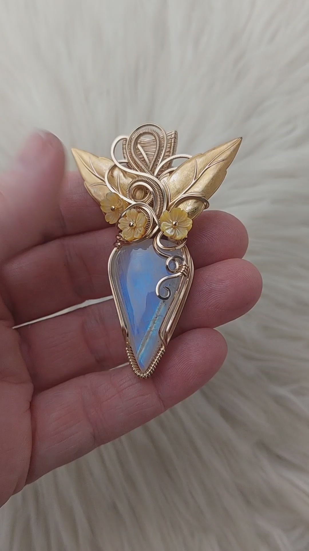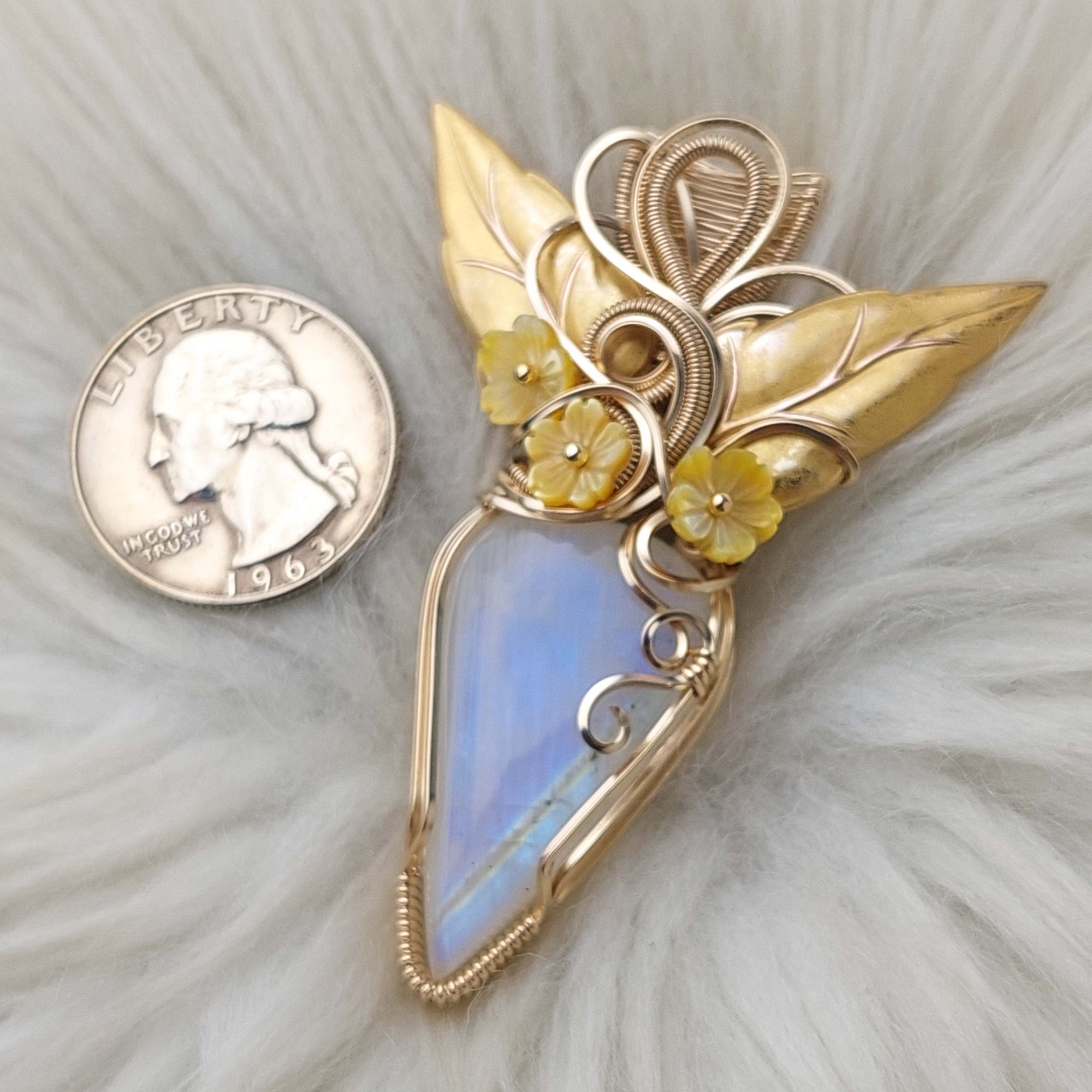 This pendant is very beautiful and super unique. The stone is a very pretty Blue flash Moonstone. It is set in 14k Goldfill wire. The leaves are 14k gold plated brass. The flowers are shell and the head pins brass.