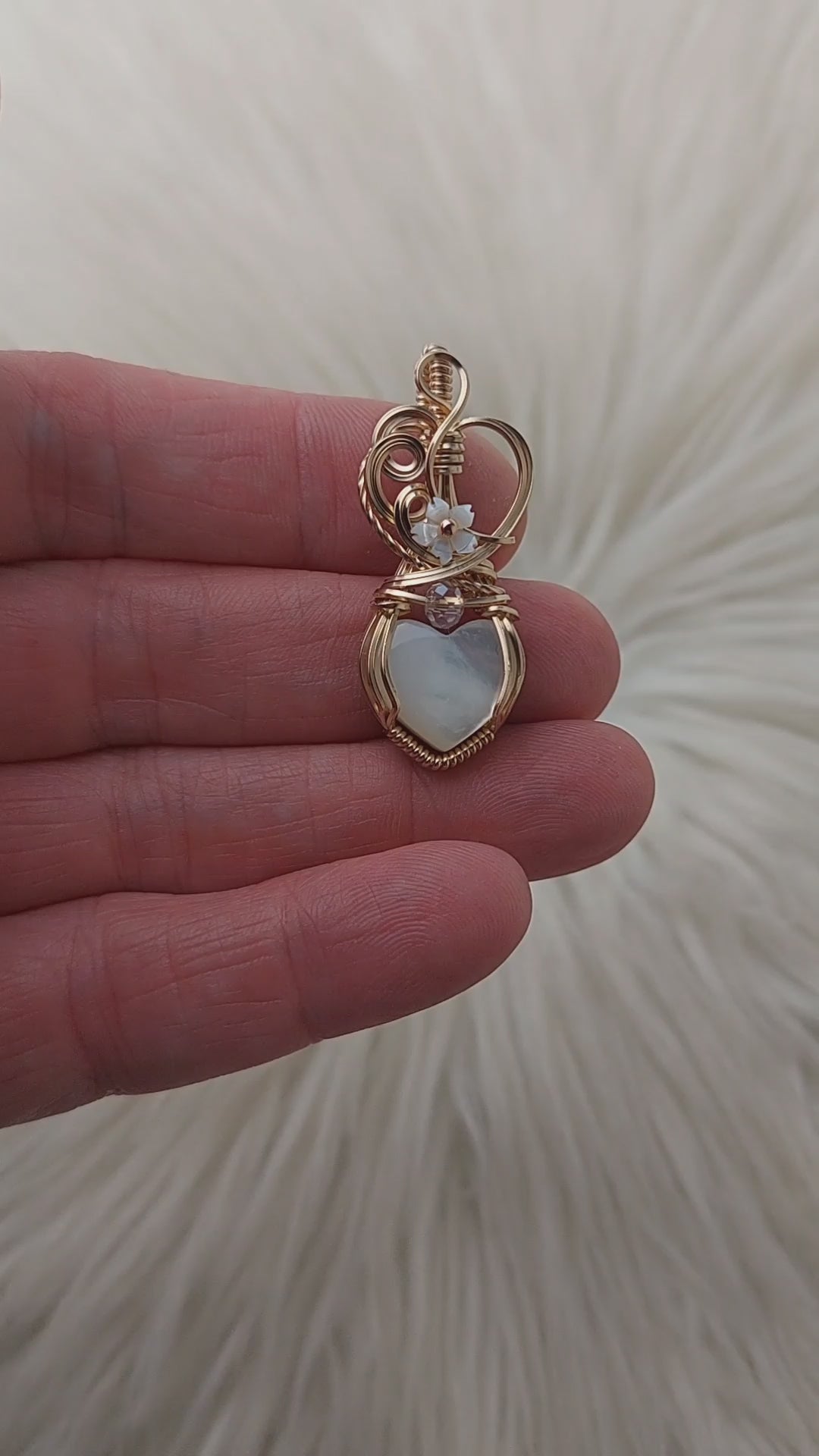 This pendant is really cute. The heart is carved mother if pearl. The flowers are mother of pearl. The bead us Swarovski Crystal. It's set in 14k Goldfilled wire. It's only been polished.