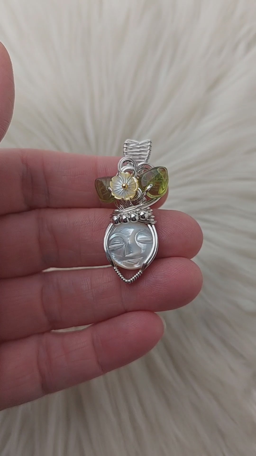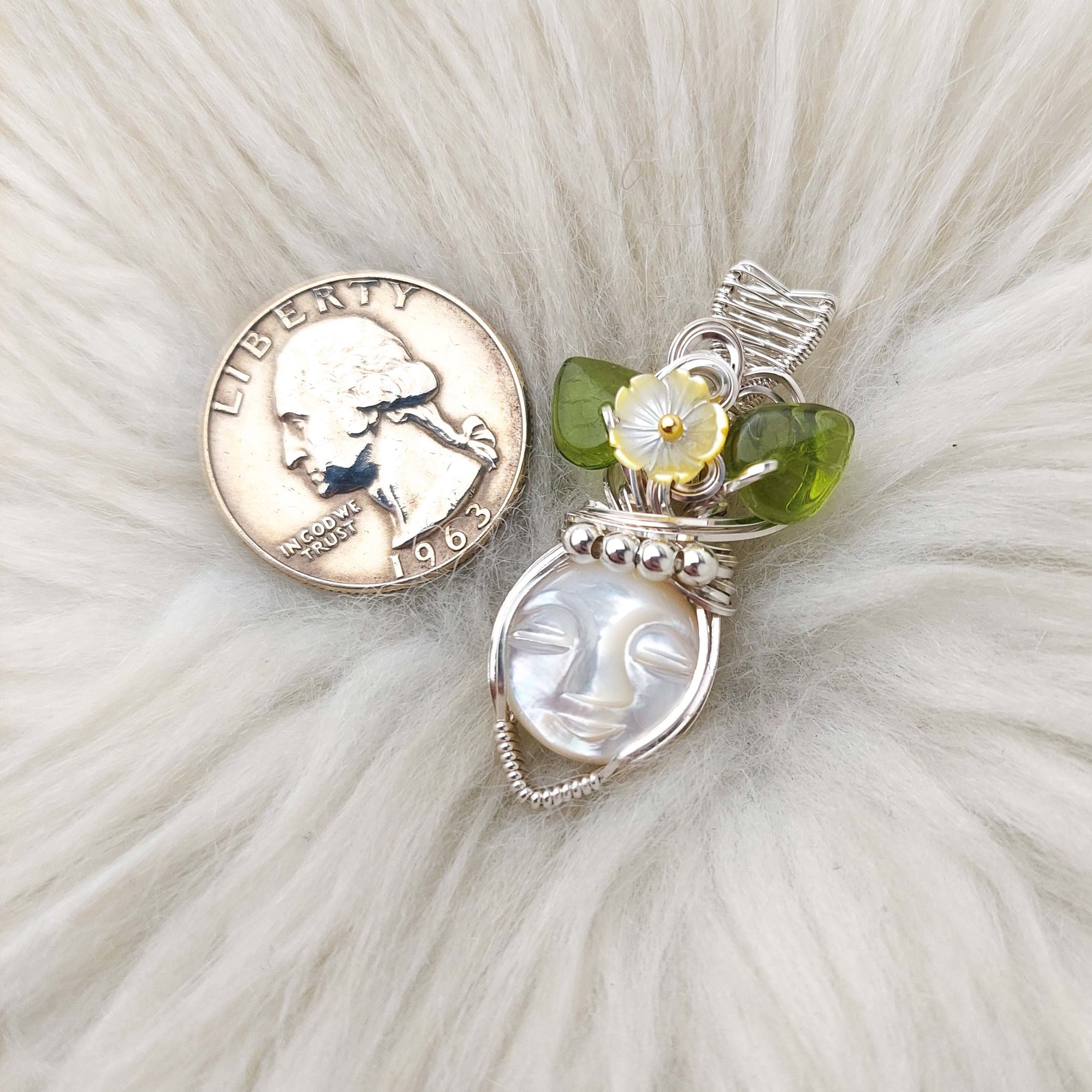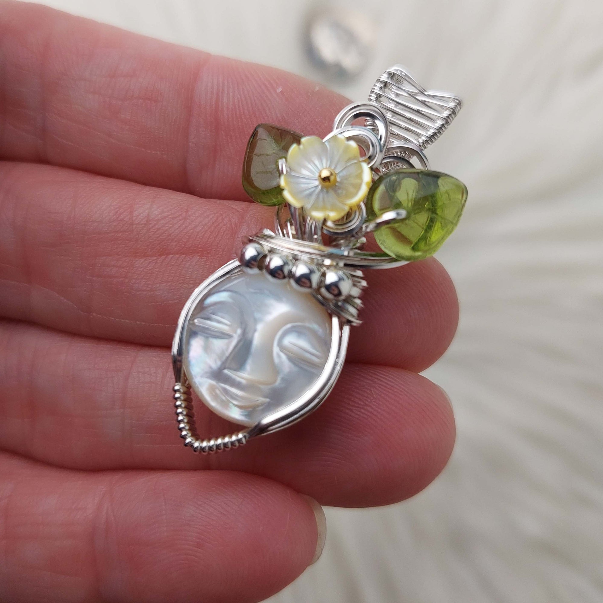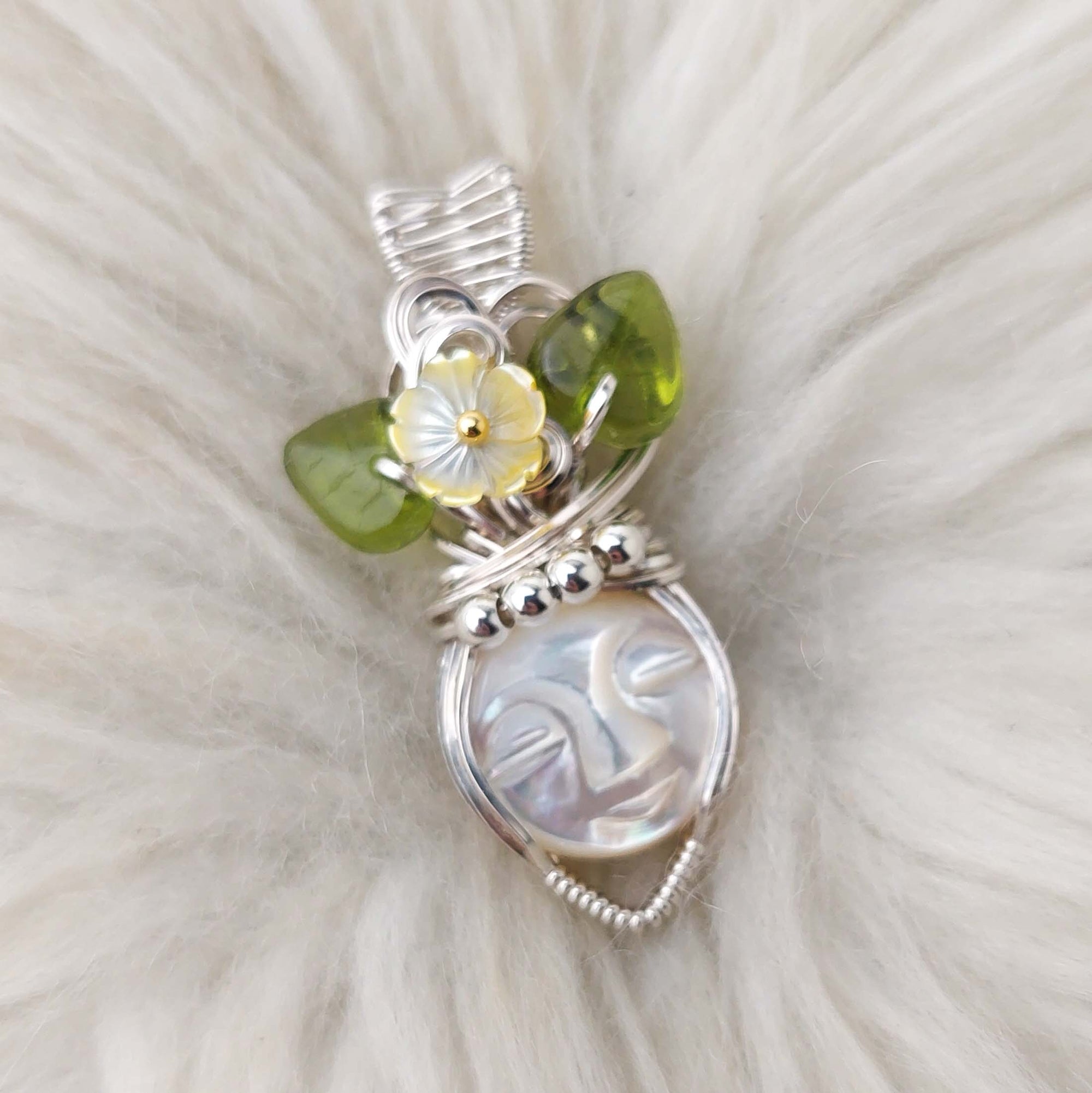 This pendant is really cute. The face is carved mother if pearl. The flowers are mother of pearl. The leaves are glass. It's set in solid sterling silver. It's only been polished.