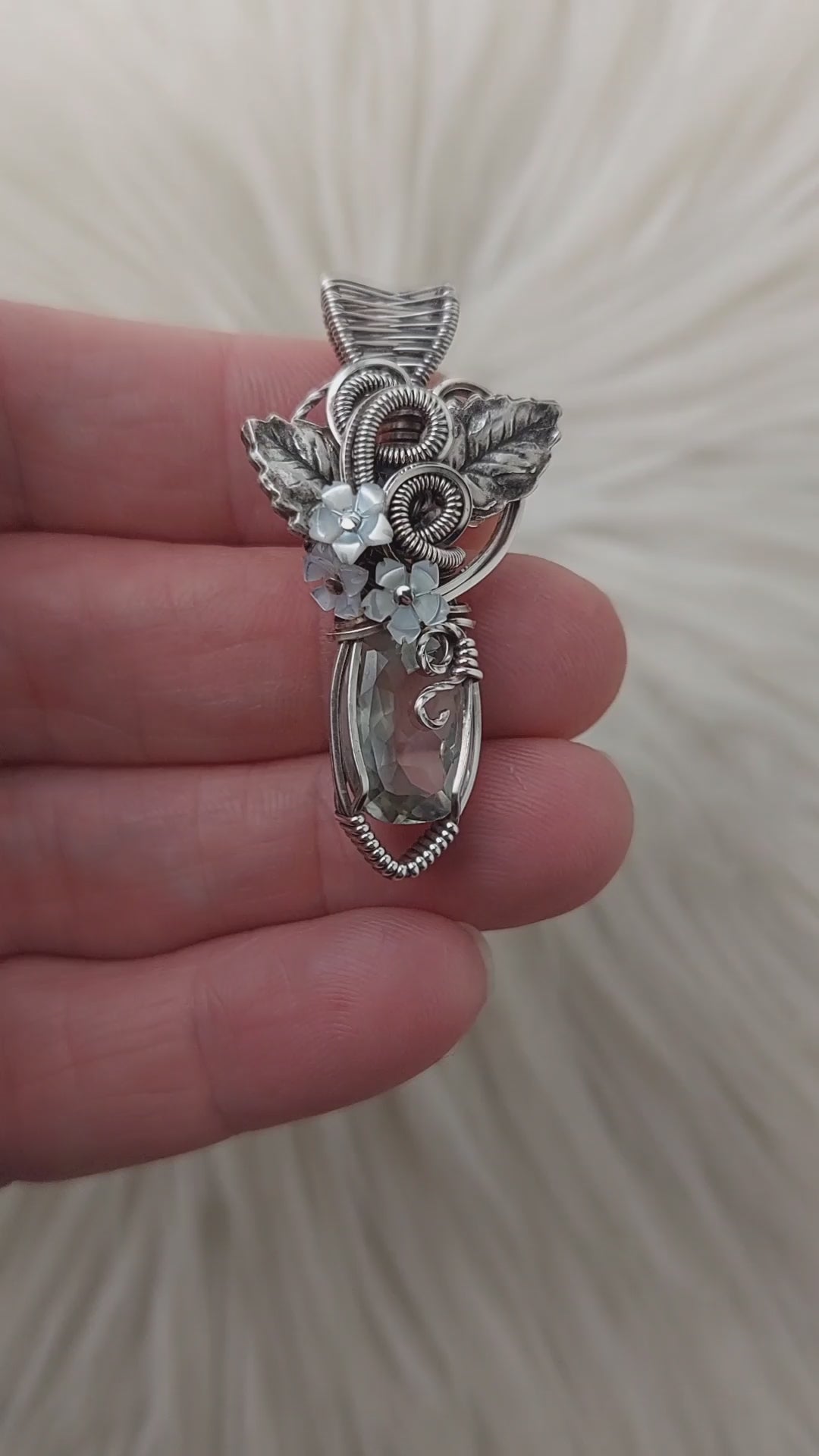 This pendant is really stunning with a large natural 6ct faceted Prasiolite. The flowers are mother of pearl. The leaves are silver-plate. It's set in solid sterling silver. It's been oxidized and polished for an antiqued look.