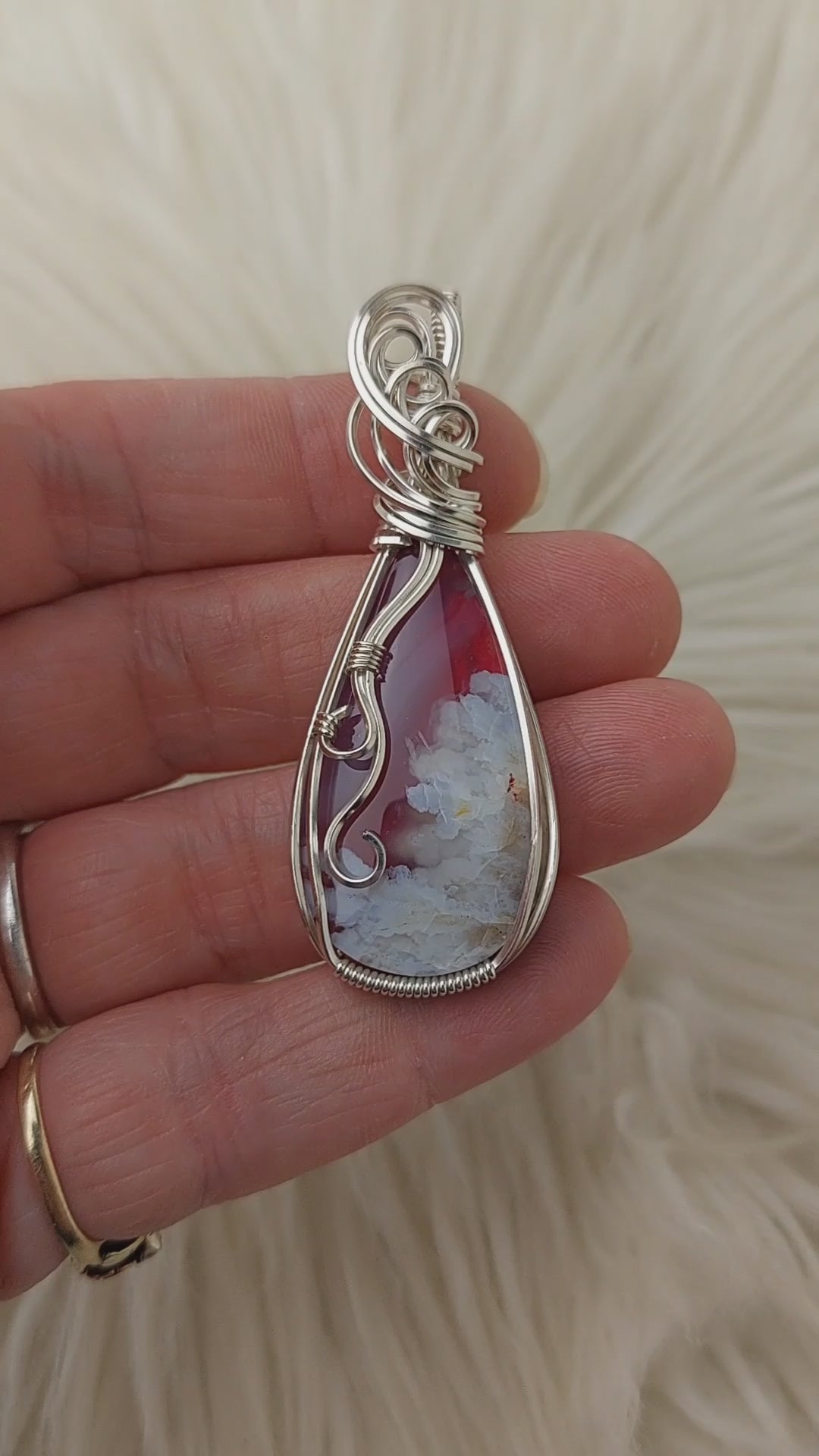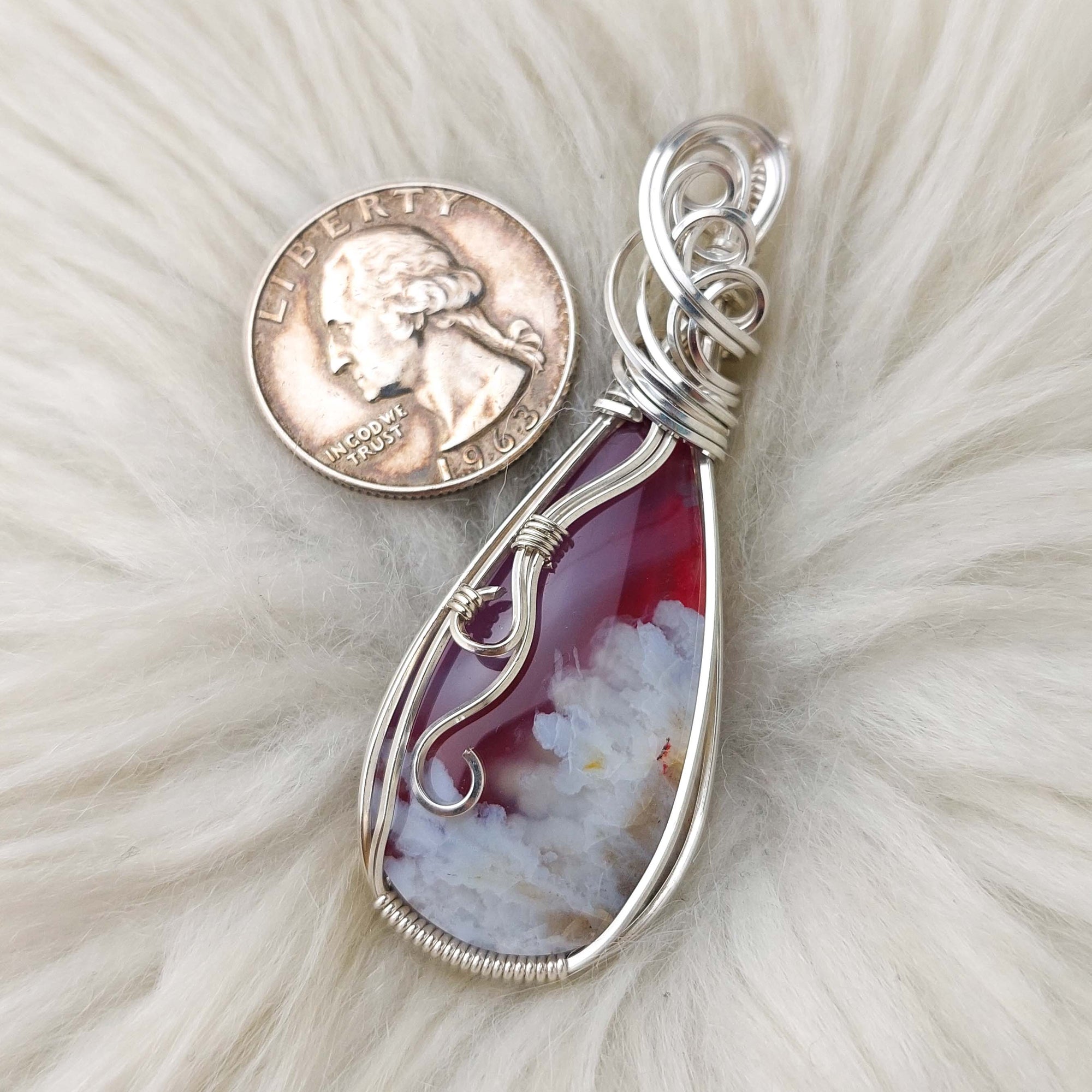 This pendant is absolutely stunning. The stone is a Plume Agate Doublet. It is set in Sterling Silver wire.