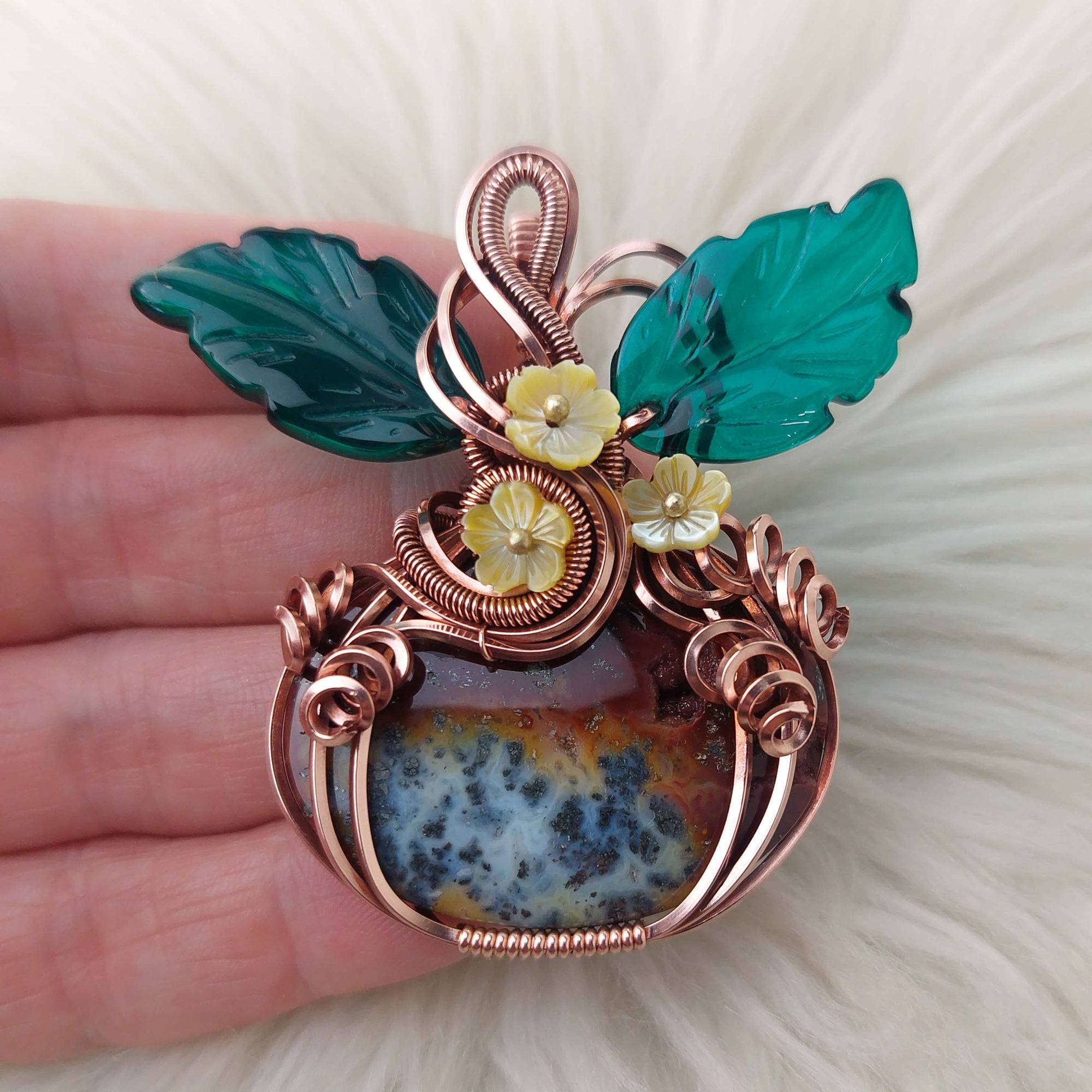 This pumpkin pendant turned out absolutely beautiful. The stone is a stunning Red Marcasite. It was artisan cabbed by Moonlit Owl Lapidary. The leaves are glass. The flowers are shell. It is set in Copper. It's only been polished.