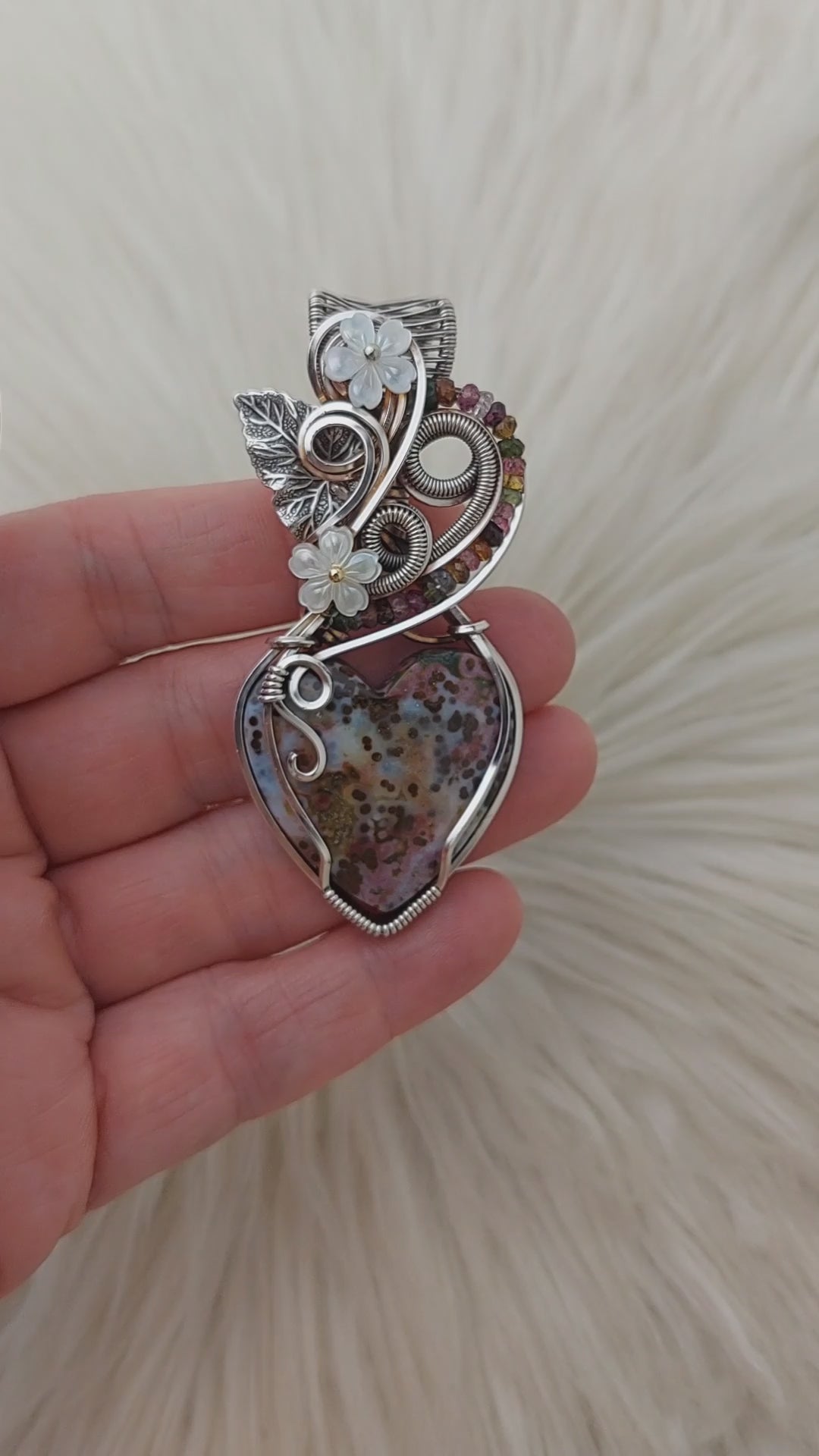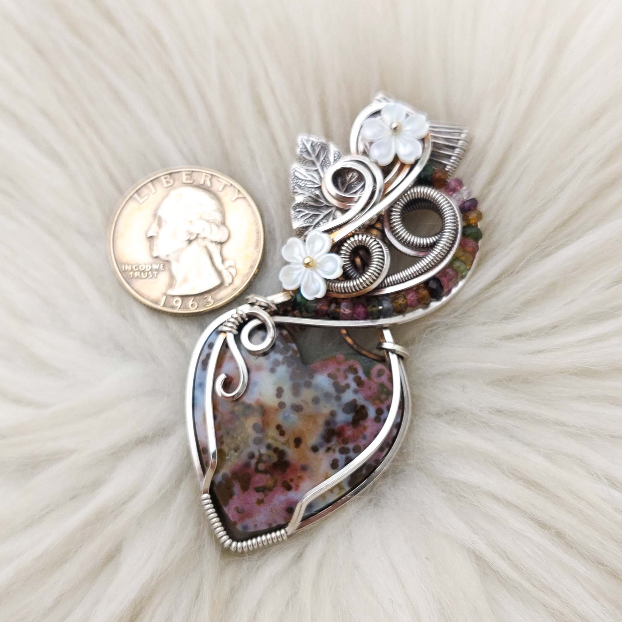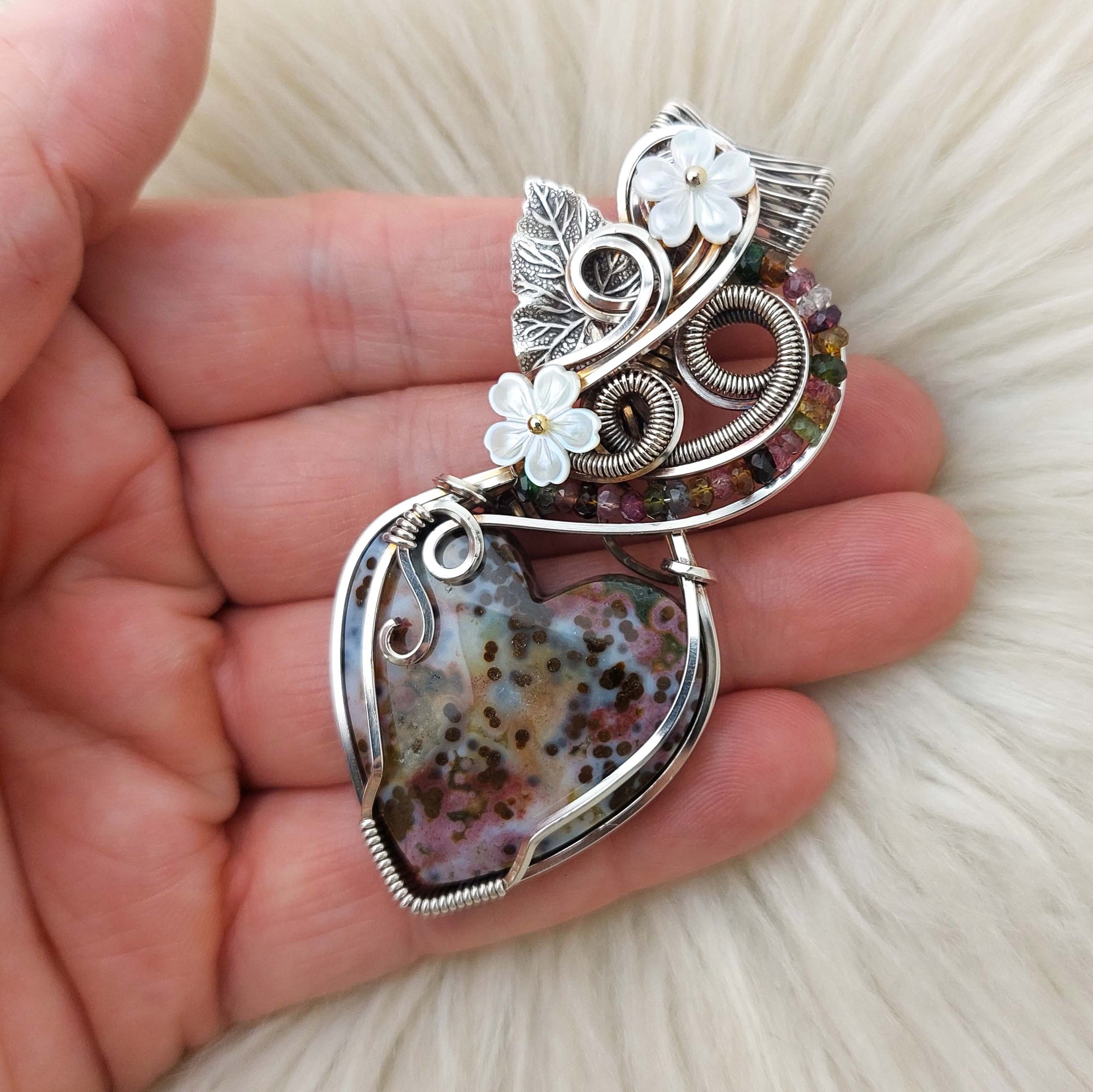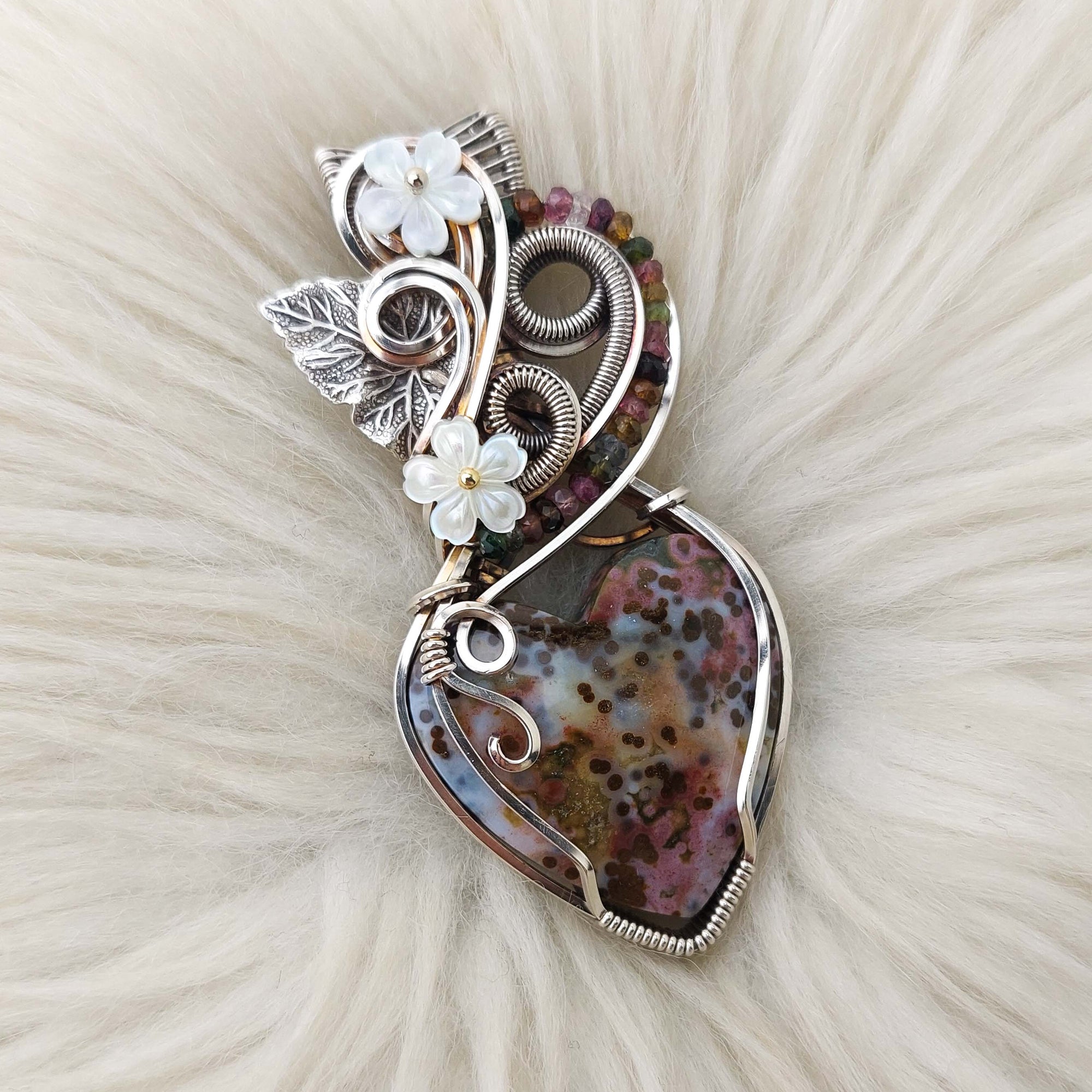 This pendant is absolutely stunning. The stone is a beautiful artisan cut River Jasper. It was cut by Rock Boss Lapidary. The leaves are silver-plated brass. The beads are Tourmaline. The flowers are mother of pearl. It is set in Sterling Silver. This pendant is large.
