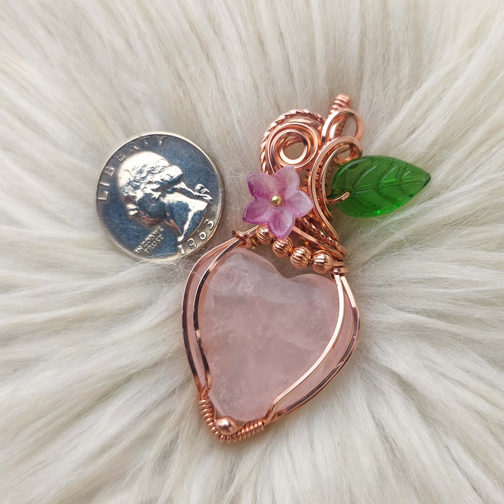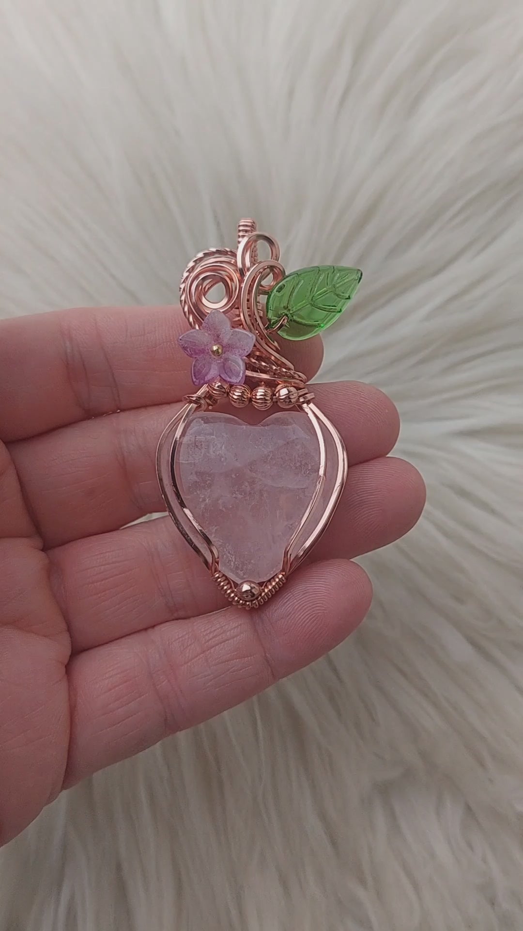 This pendant turned out absolutely beautiful. The stone is Rose Quartz. The leaf is glass and the flowers are glass. It is set in Copper. It's only been polished. This stone was from Blizzards Rocks.