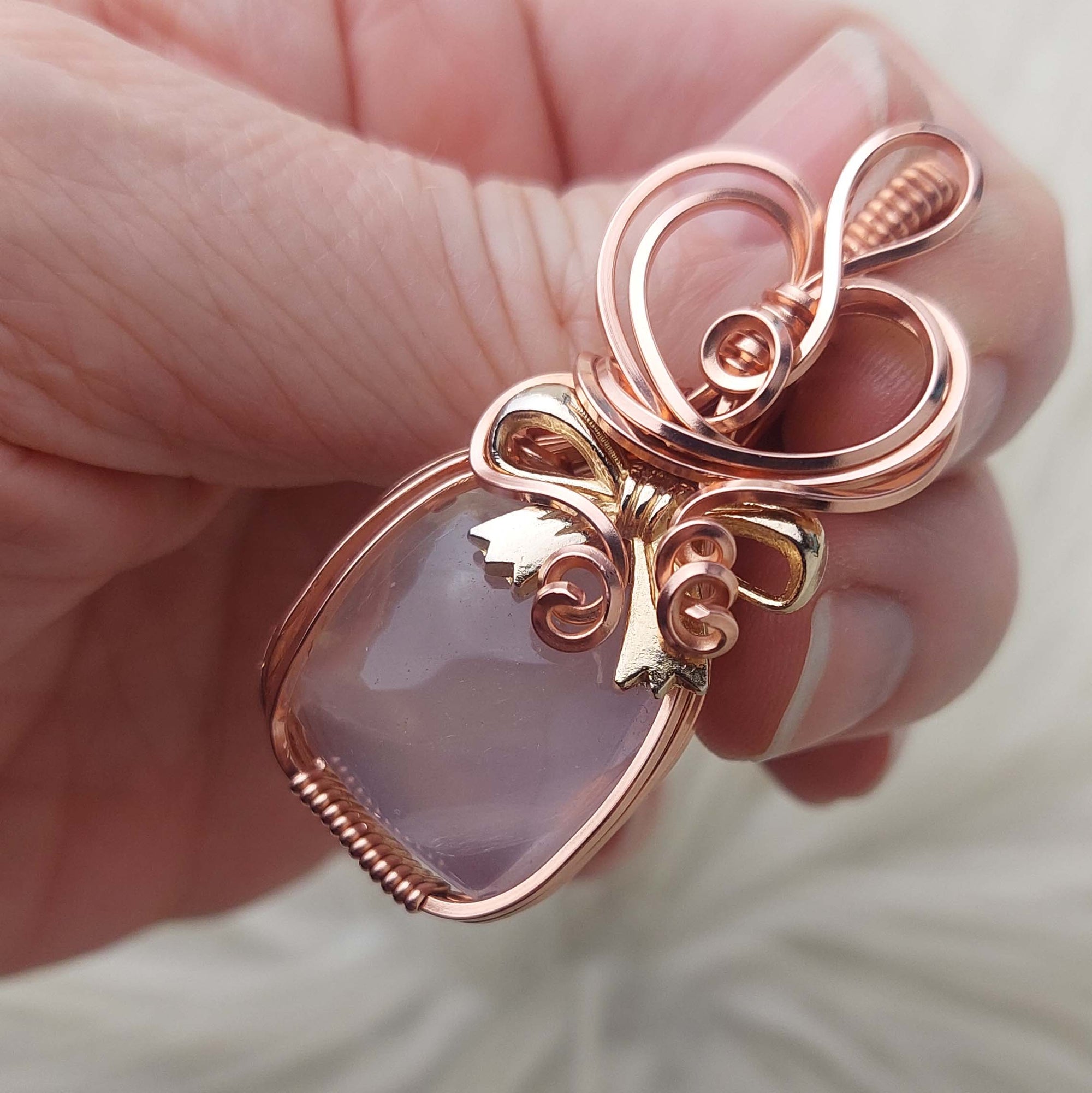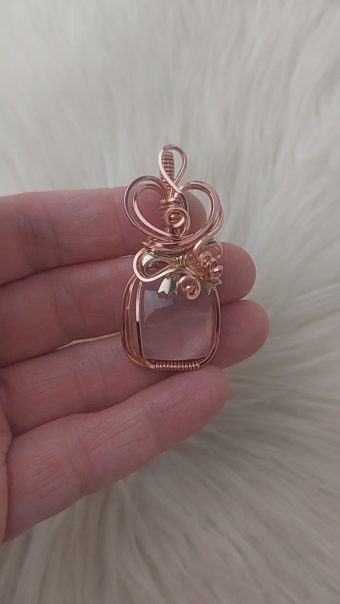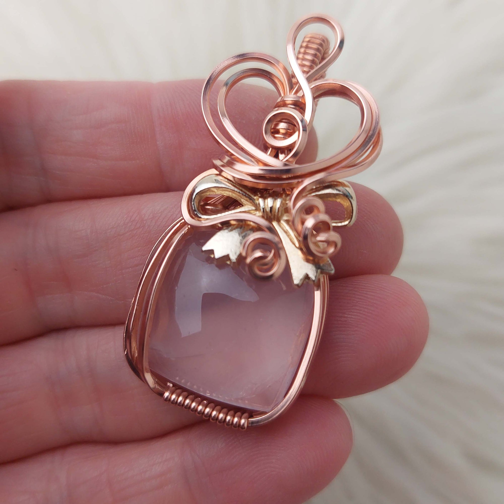 This pendant turned out absolutely awesome. The stone is Rose Quartz. The bow is brass. It is set in Copper. It's only been polished.