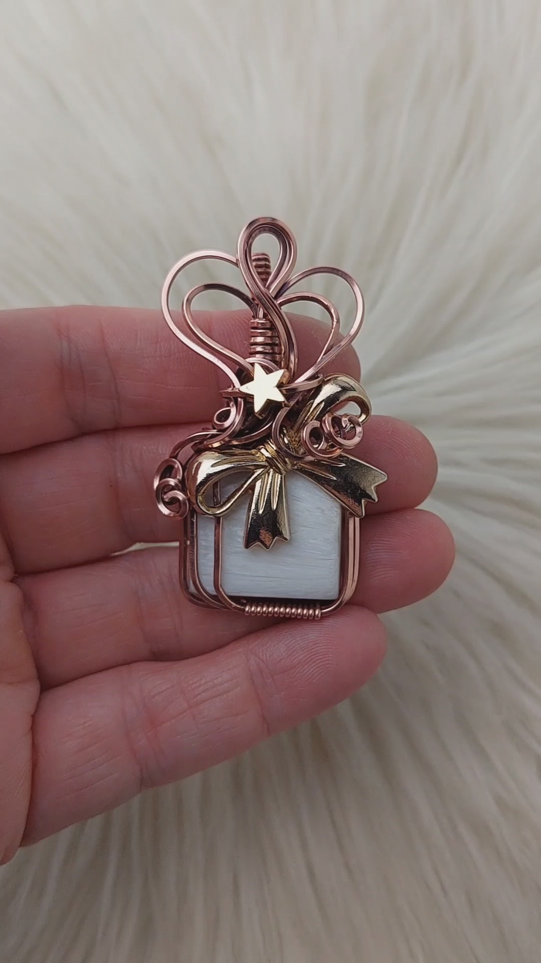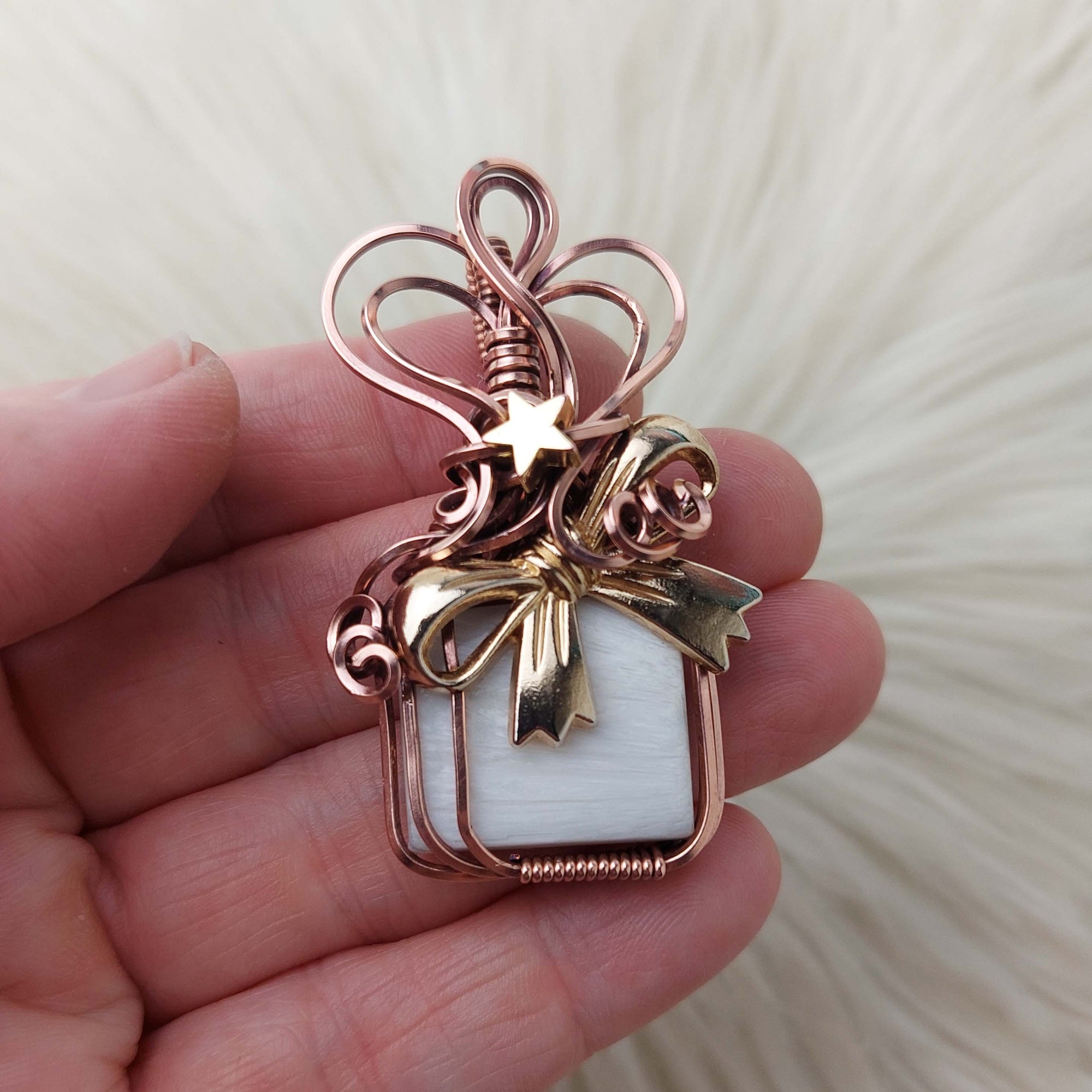 This pendant turned out absolutely awesome. The stone is white scolecite. The bow is brass. It is set in Copper. It's been oxidized and polished for an antiqued look.