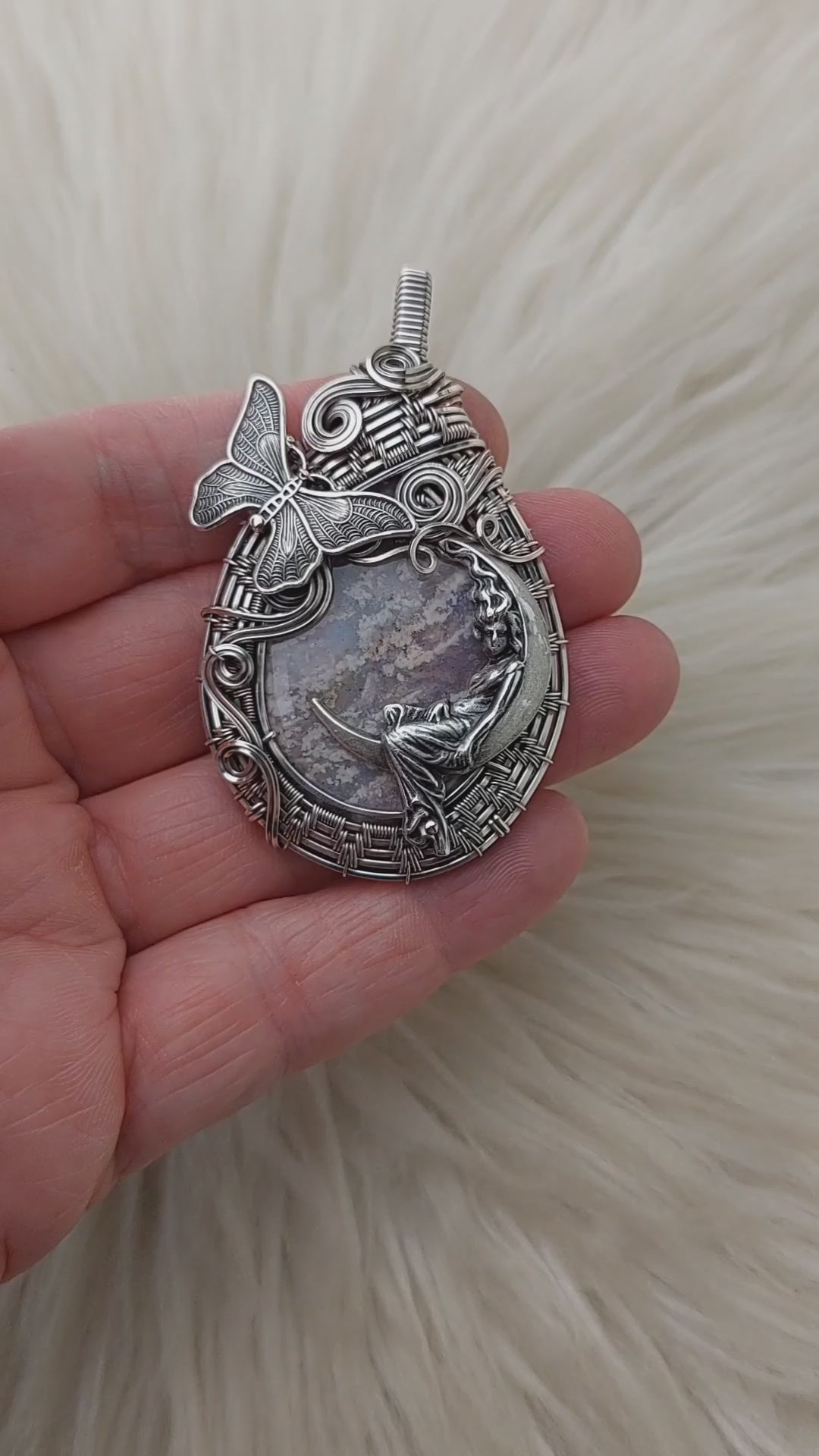 This is a very beautiful pendant. The stone is a stunning Plume Agate. The woman and butterfly are silver-plated brass. It's set in Solid Sterling Silver wire. This pendant only been polished.